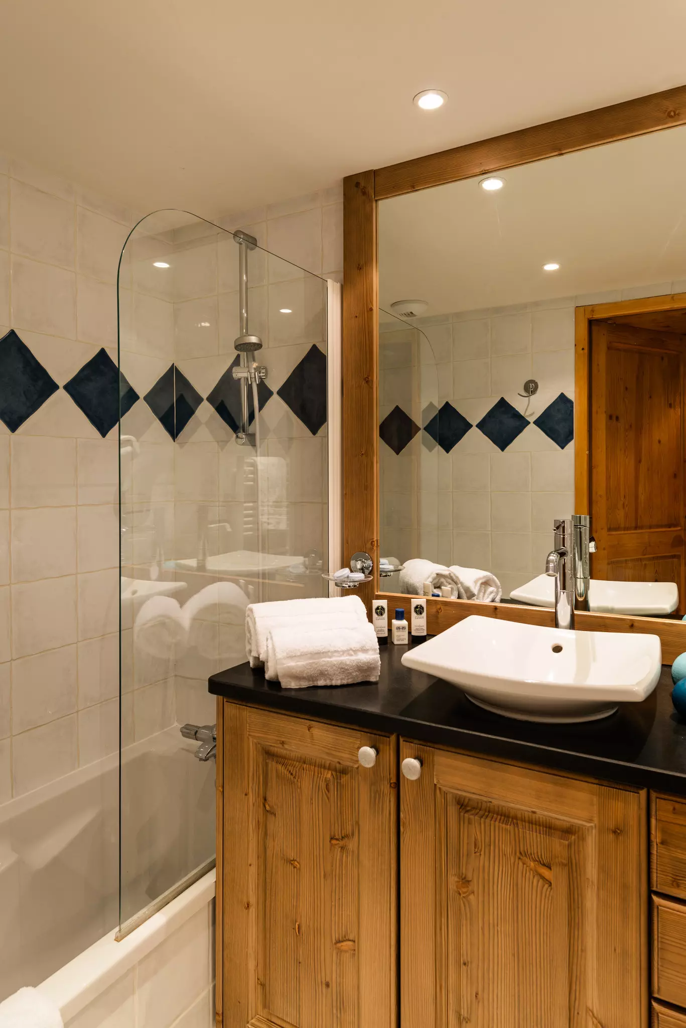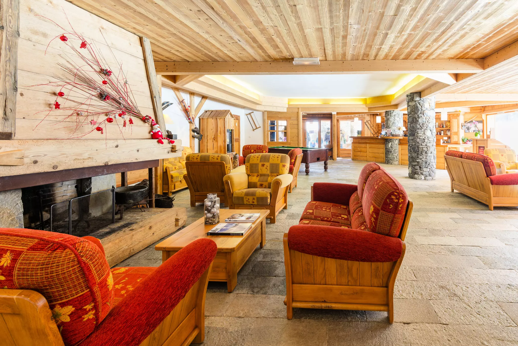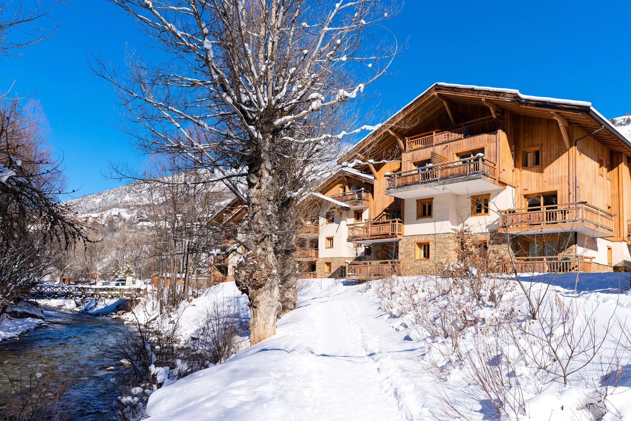 Les appartements sont répartis dans plusieurs chalets, construits en harmonie avec la montagne, avec un mélange de pierre et de bois.