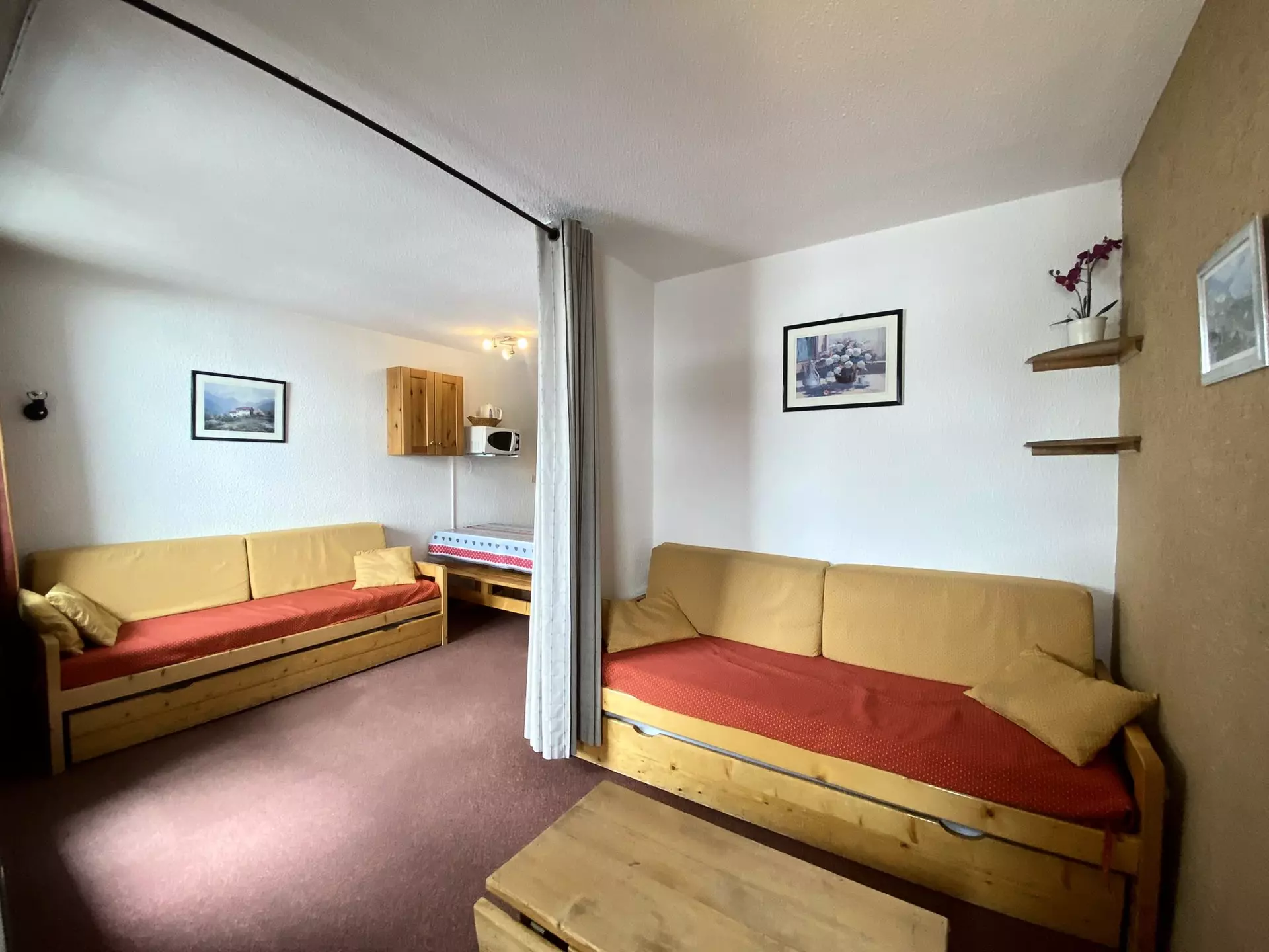 Il dispose d'un balcon exposé sud, d' un canapé lit gigogne dans la partie nuit (séparée du salon par un rideau) et de lits superposés la cabine.