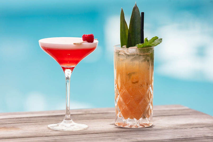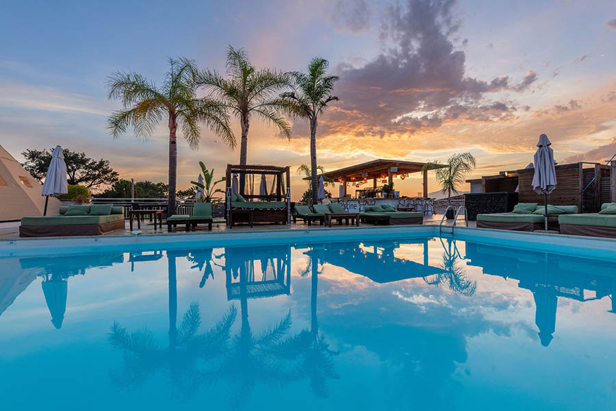 Piscine extérieure avec chaises longues/bed pour deux personnes et bar à cocktails.
