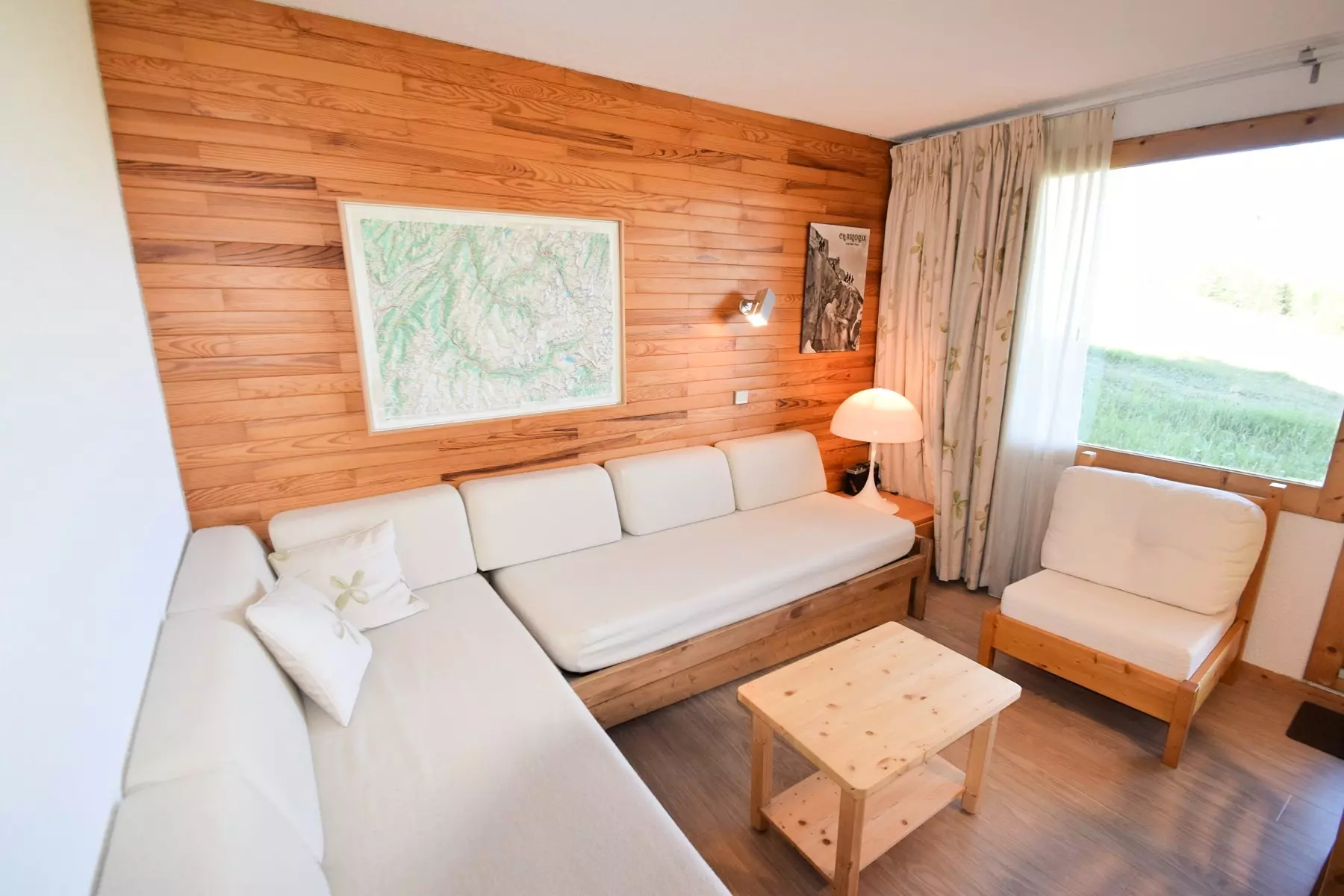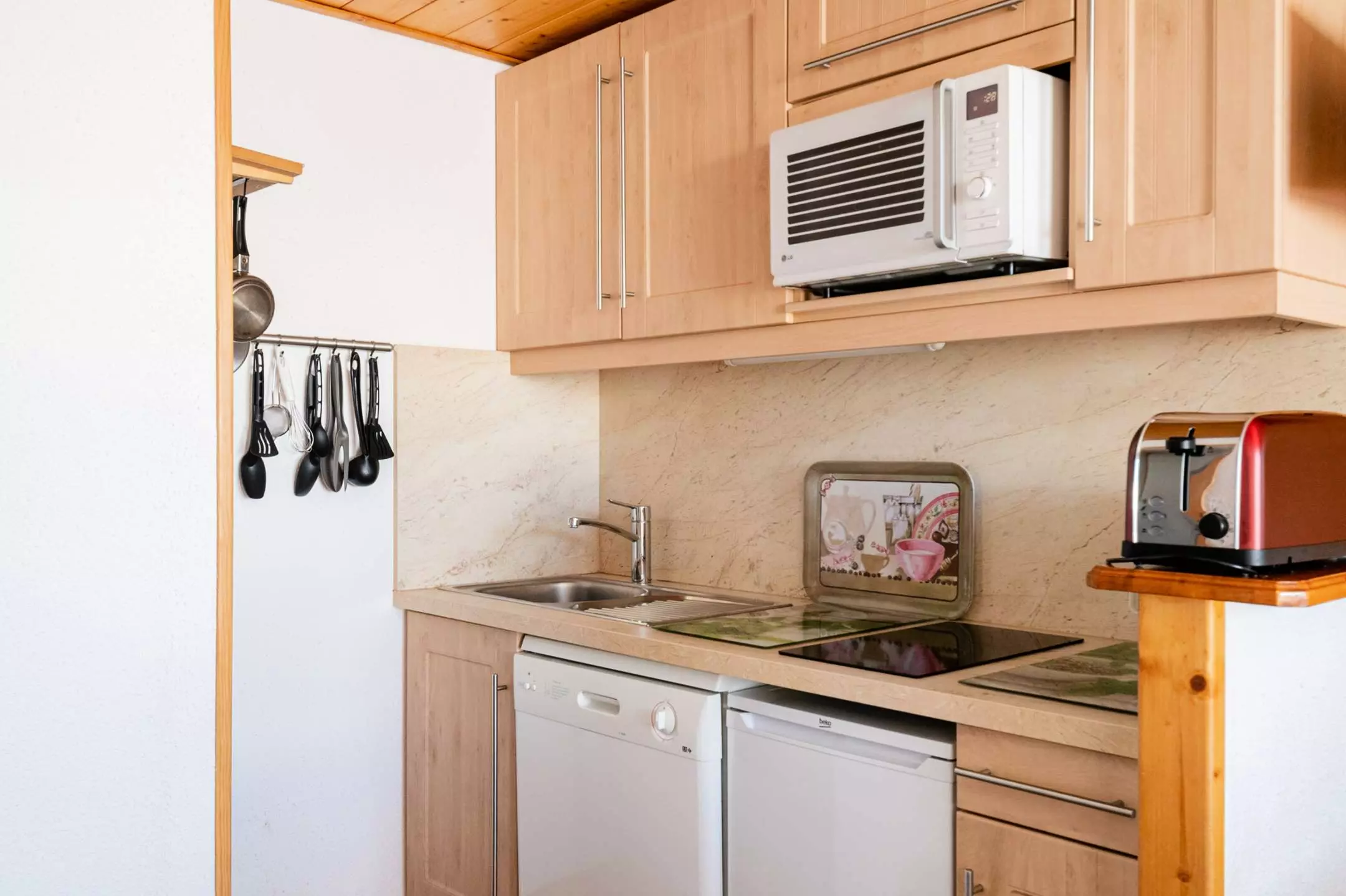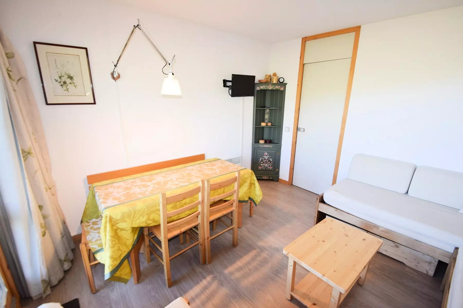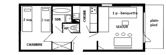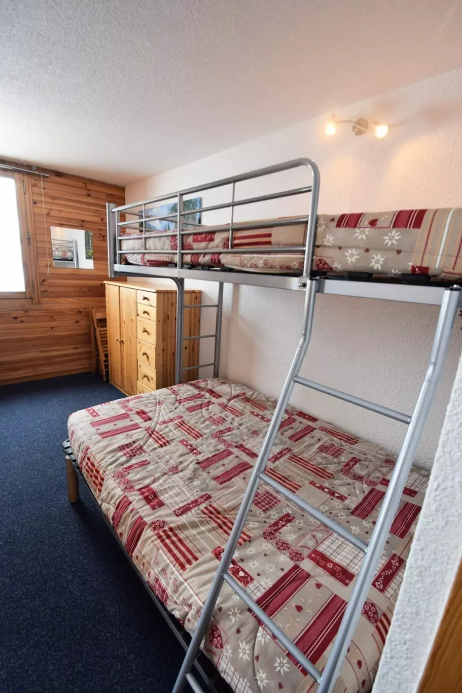 Appt 2 pièces 5 pers, env 35 m2, exposition Sud/Ouest, de plain-pied avec petite terrasse (déneigement non garanti), accès direct et vue sur les pistes, RDC - Entrée 2 - Cuisine: 4 plaques vitrocéramiques, four multi-ondes, réfrigérateur, Lave-vaisselle - Séjour : coin repas, 1 banquette-lit 1 pers (80cm)- Télévision - Chambre : 2 x 2 lits superposés (80cm) - SDB : baignoire, WC séparés. Les sols: plastique - Literie : couettes 1p - En option avec supplément : ménage de fin de séjour, draps, serviettes, forfaits ski . Appartement non fumeur, animaux non admis. En option et en supplément: Ménage de fin de séjour, draps, serviettes, forfaits ski. Casier à skis n°21 au RDC. Appartement clair avec très belle vue sur les pistes et accès direct.