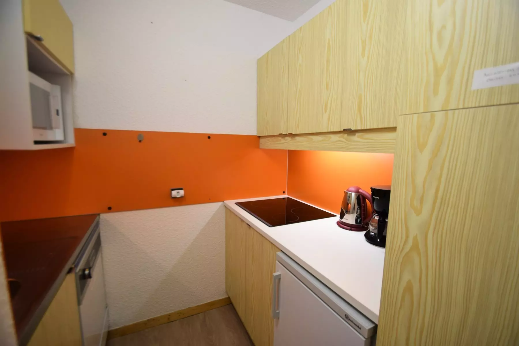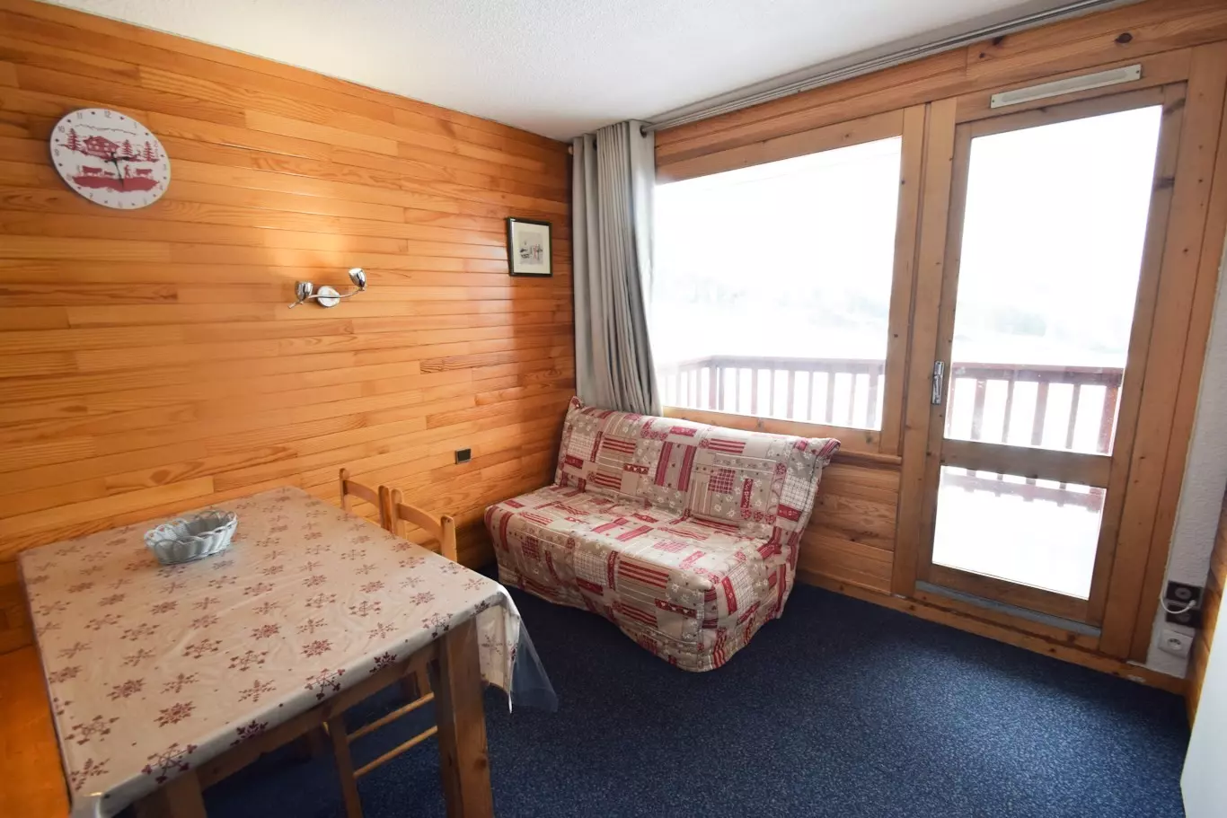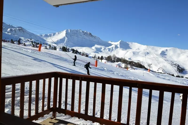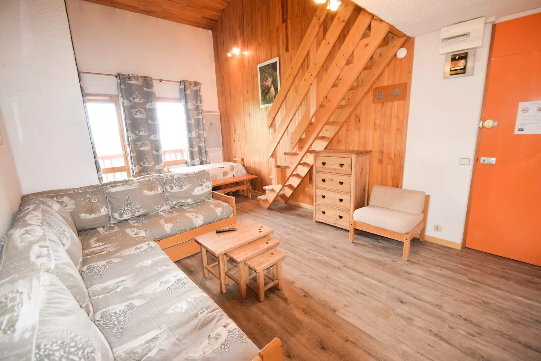Studio divisible 4/5pers, 27 m2 balcon, exposition Sud/Ouest, vue sur les pistes, 1er étage - Entrée 2, escaliers, Cuisine: 2 plaques à induction, four multi fonction, réfrigérateur, lave-vaisselle - Séjour : coin repas, 1 canapé-lit BZ 2p(140cm), TV - Partie divisible par une paroi coulissante en bois : 1 lit 1 pers en mezzanine et 1 lit 2 pers en dessous. Douche - WC séparés. Literie : 2 couettes 2p et 1 couette 1p. Les sols : moquette ds entrée et séjour, plastique ds cuisine, wc/sdb. Ménage de fin de séjour, draps, serviettes et forfaits ski en option. ANIMAUX NON ADMIS Casier à skis n°26 au RDC -Appartement clair avec belle vue sur les pistes.
