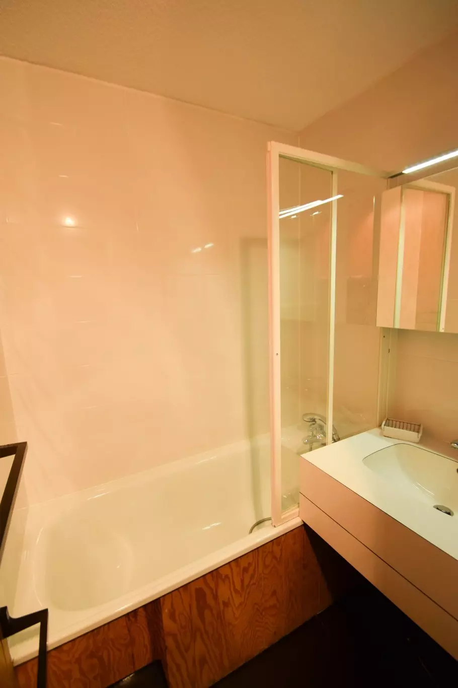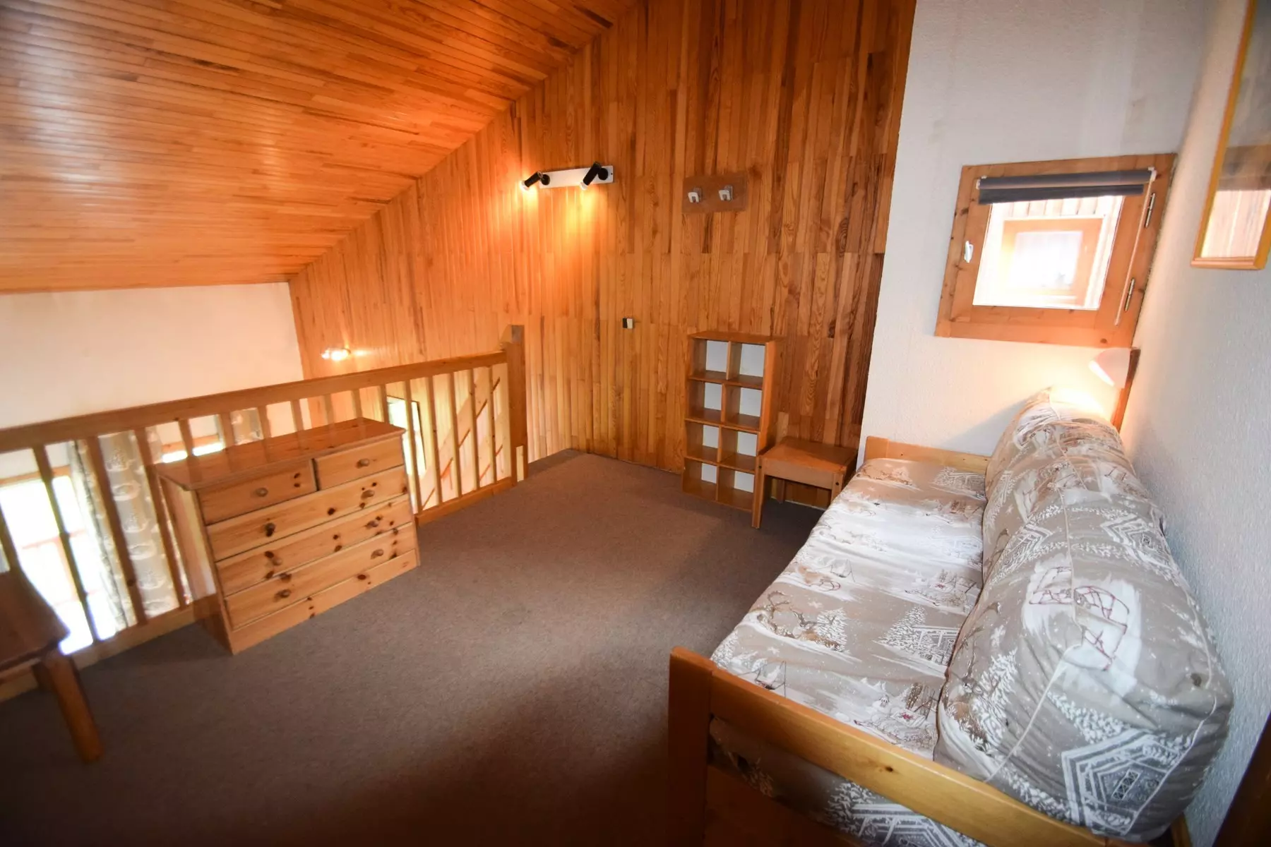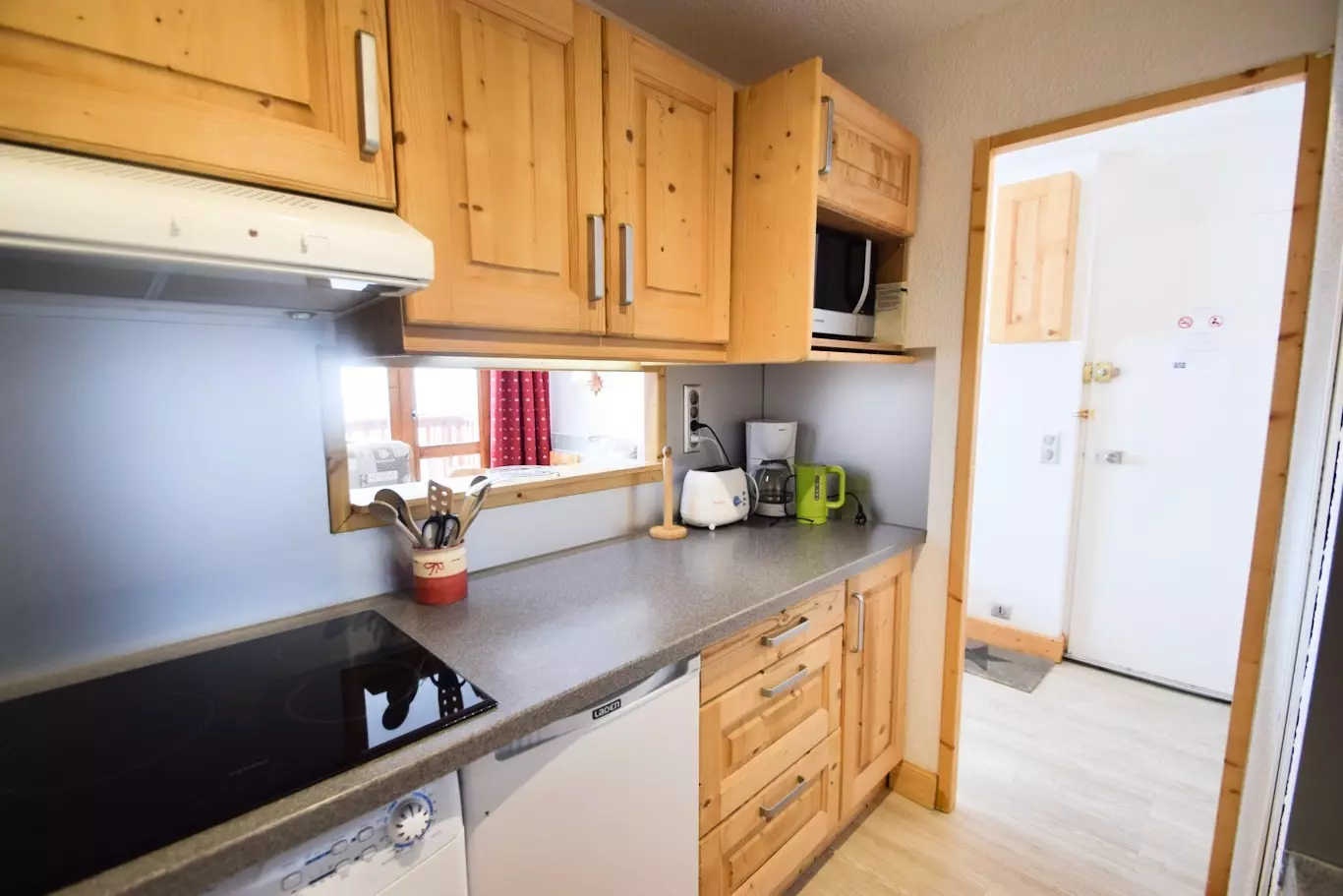 Studio divisible 4/5pers, 27 m2 balcon, exposition Sud/Ouest, vue sur les pistes, 1er étage - Entrée 2, escaliers, Cuisine: 2 plaques à induction, four multi fonction, réfrigérateur, lave-vaisselle - Séjour : coin repas, 1 canapé-lit BZ 2p(140cm), TV - Partie divisible par une paroi coulissante en bois : 1 lit 1 pers en mezzanine et 1 lit 2 pers en dessous. Douche - WC séparés. Literie : 2 couettes 2p et 1 couette 1p. Les sols : moquette ds entrée et séjour, plastique ds cuisine, wc/sdb. Ménage de fin de séjour, draps, serviettes et forfaits ski en option. ANIMAUX NON ADMIS Casier à skis n°26 au RDC -Appartement clair avec belle vue sur les pistes.