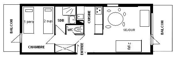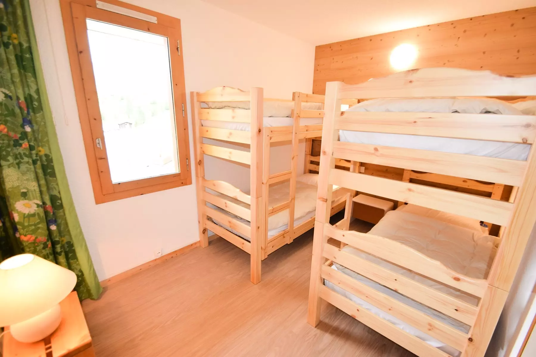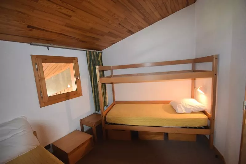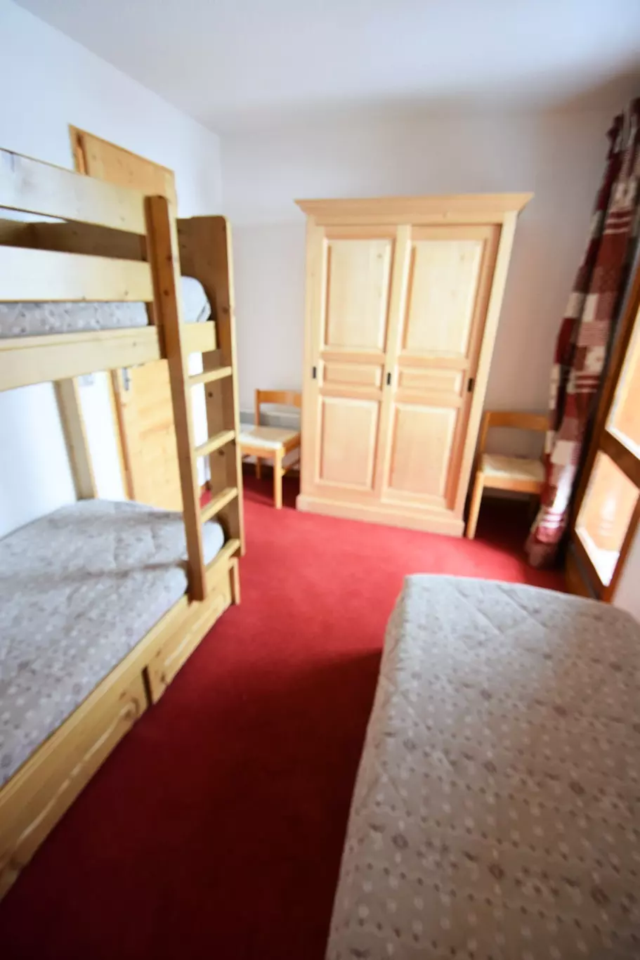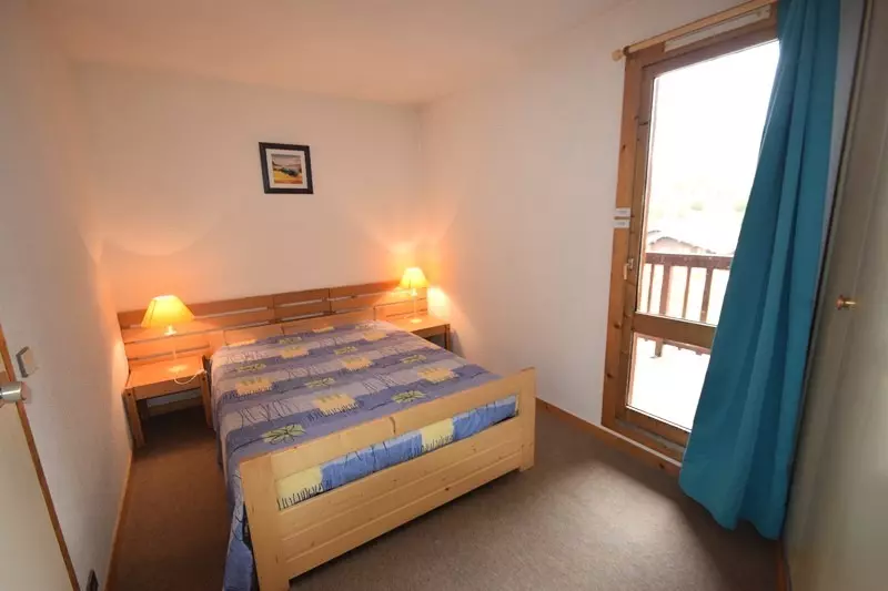 Appt 2 pièces 5 pers, 35 m2, 2 balcons, exposition Sud/Ouest, vue sur les pistes, 1er étage - Entrée 2, accès escaliers, Cuisine: 3 plaques vitro-céramiques, four micro-ondes/grill, réfrigérateur, LV, Lave-linge - Séjour : coin repas, 2 lits gigognes TV - Chambre : 2 lits superposés et 1 lit 1 pers - SDB : douche - WC séparés. Literie : couettes - Les sols: plastique sauf chambre moquette. ANIMAUX NON ADMIS.