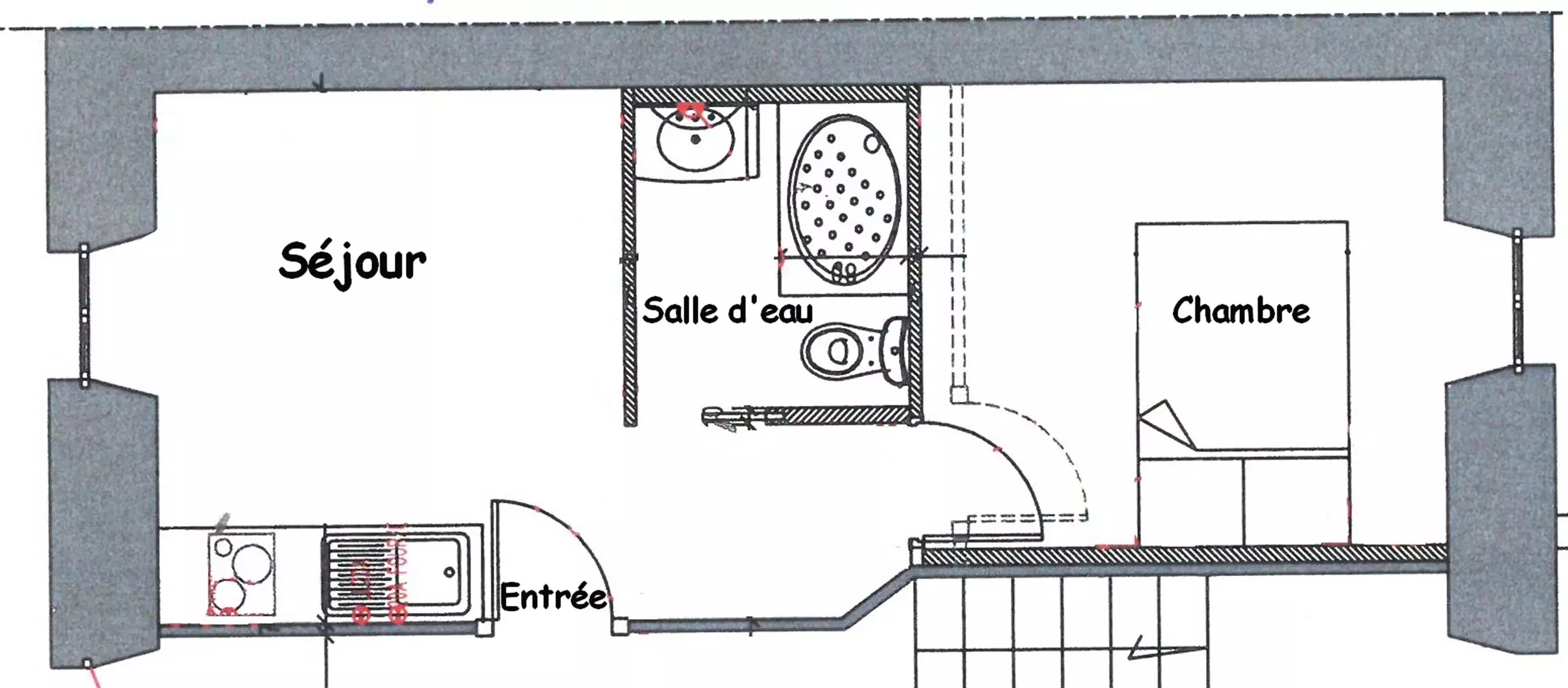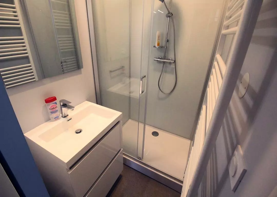 Cet appartement d'une superficie de 23.97 m² comprend un séjour avec canapé fixe, téléviseur, une kitchenette équipée (micro-ondes, plaques vitrocéramiques deux feux, cafetière électrique filtres, bouilloire), une chambre avec un lit deux personnes rangement, une salle d'eau avec douche et wc, sèche serviette électrique.