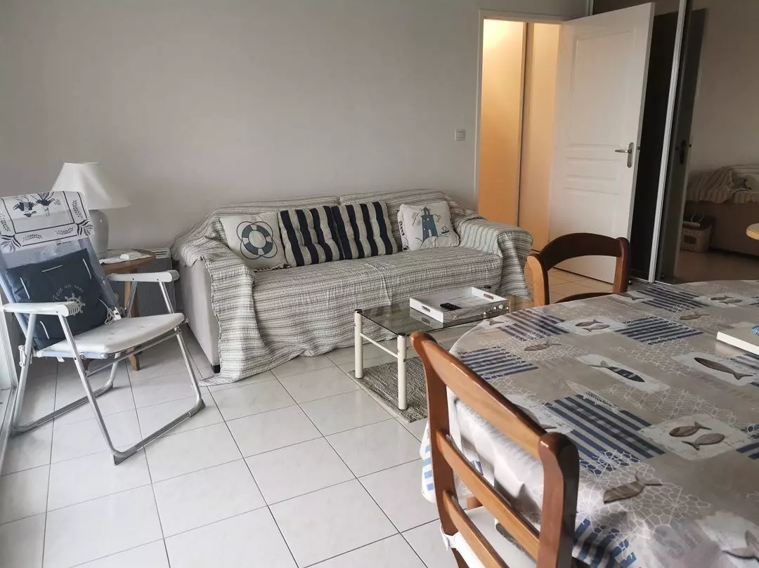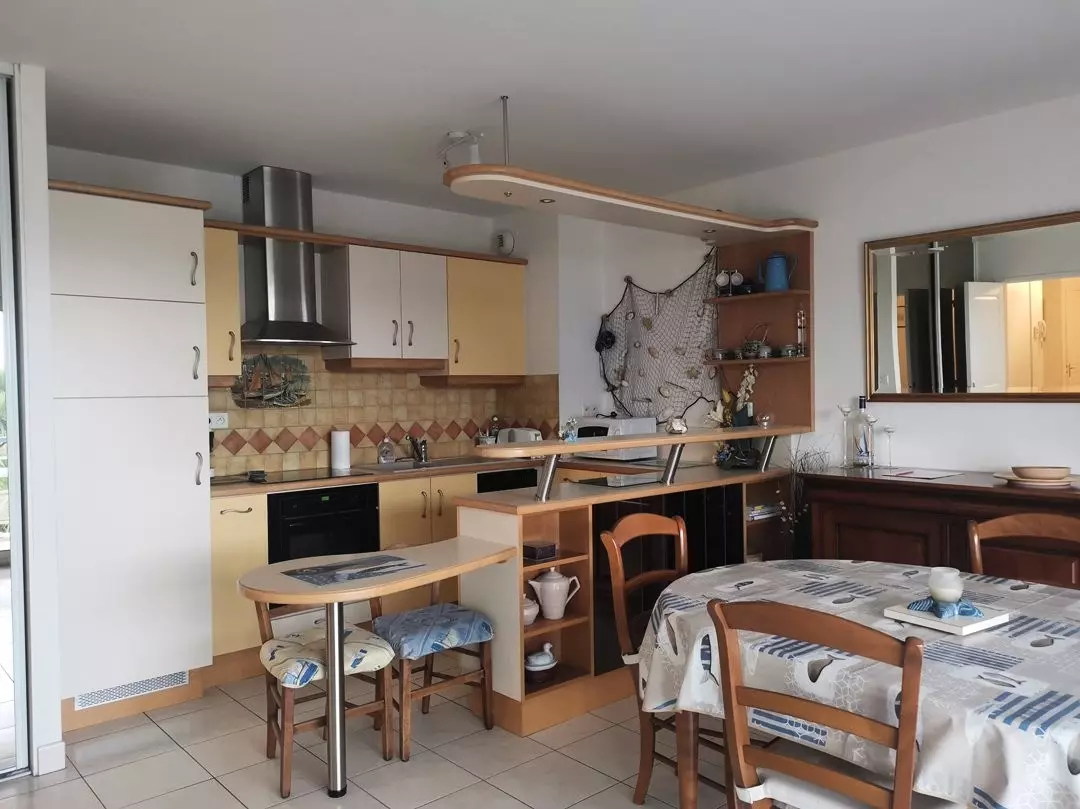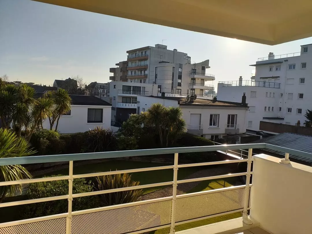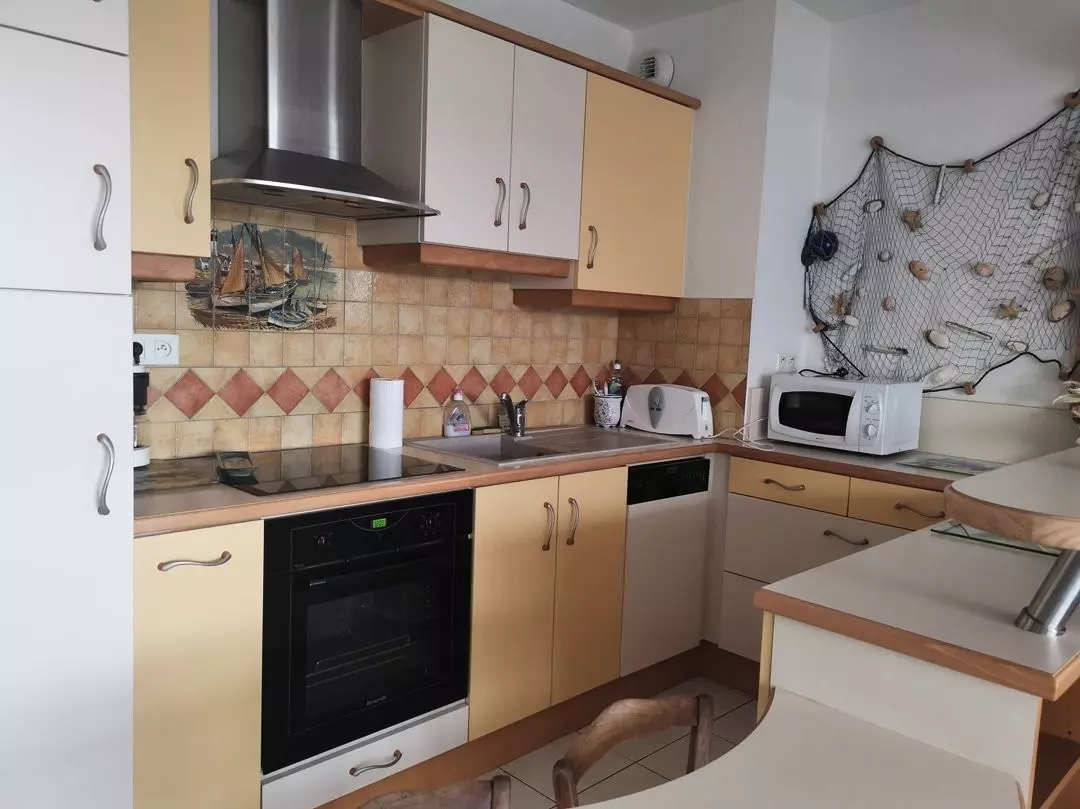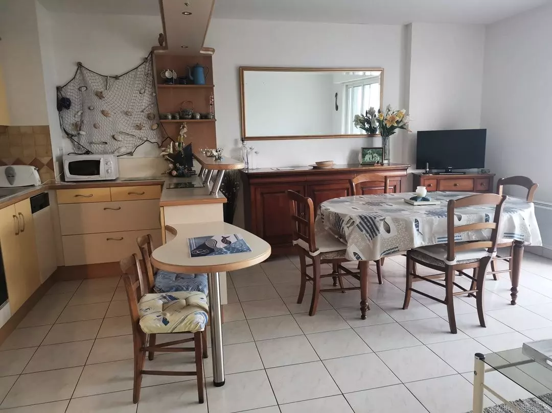 PORNICHET, au pied de la place du marché et à proximité de la plage, appartement en bon état, au deuxième étage avec ascenseur, comprenant : une entrée avec placard, un séjour sur terrasse avec canapé, télévision, table et chaises, une cuisine ouverte aménagée et équipée (réfrigérateur, congélateur, four électrique, plaques de cuisson, hotte, lave-vaisselle et micro-ondes), une chambre sur terrasse avec un lit double, une chambre sur terrasse avec deux lits simples, une salle d'eau avec lave-linge et un wc séparé. Et stationnement en sous-sol.