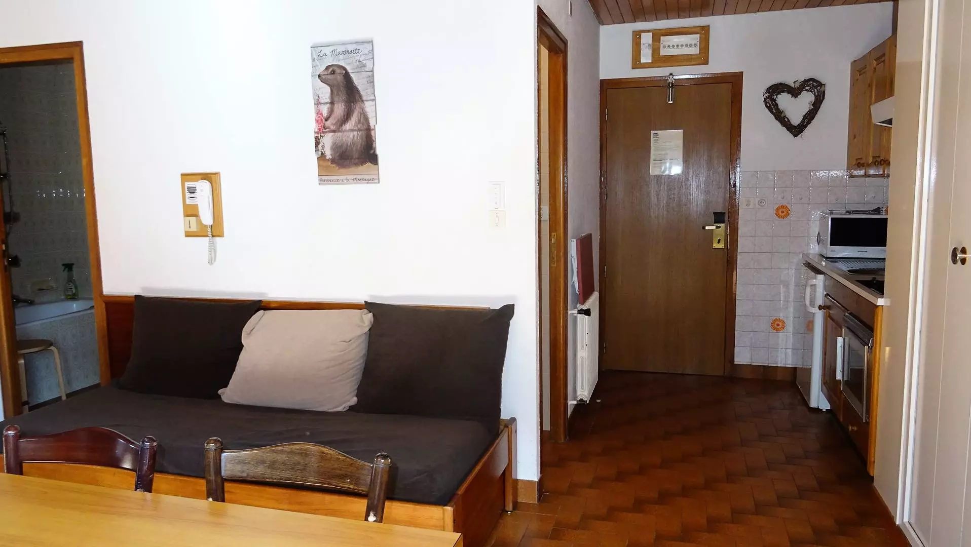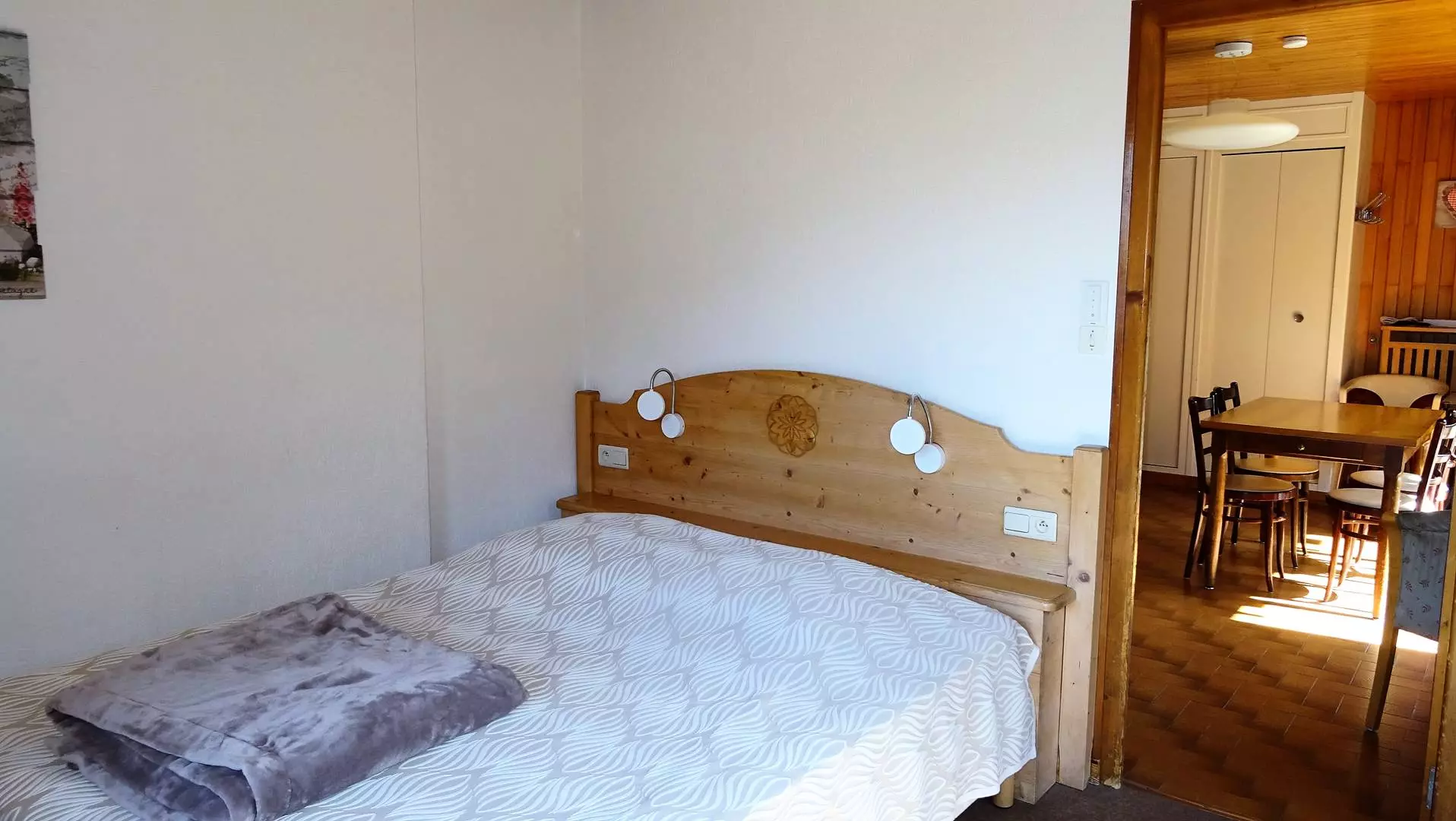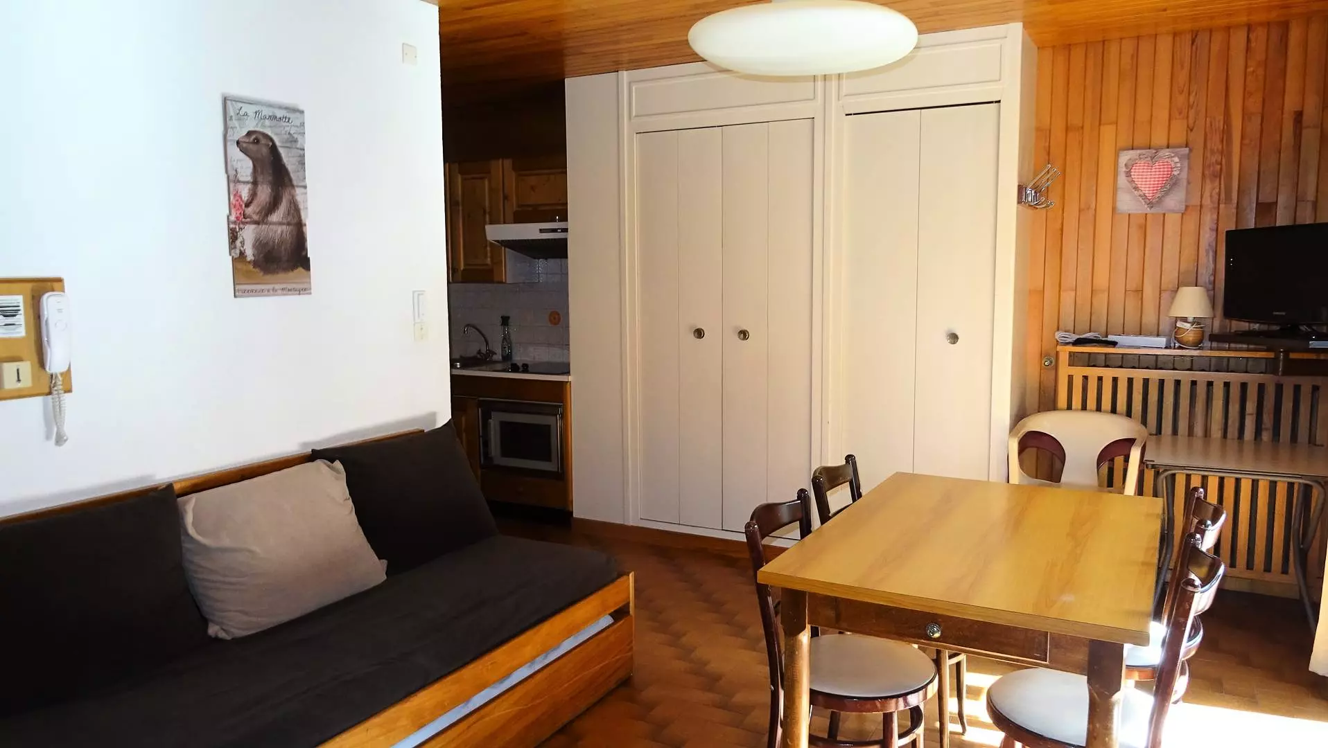 DESCRIPTIF : Entrée avec placard - Une chambre équipée d' 1 lit 2 personnes (160X200) + placard - Séjour salle à manger équipé d' 1 banquette 1 personnes + 1 lit tiroir 1 pers, baies vitrée donnant sur un balcon, Vue centre village - Coin cuisine ouvert sur salle à manger entièrement équipée (3 plaques vitrocéramiques, frigidaire, hotte aspirante, grille-pain, bouilloire, cafetière électrique, four, micro-ondes avec batterie de cuisine ) - 1 WC indépendant - 1 salle de bain - 1 balcon. Animaux non acceptés. Non fumeurs.