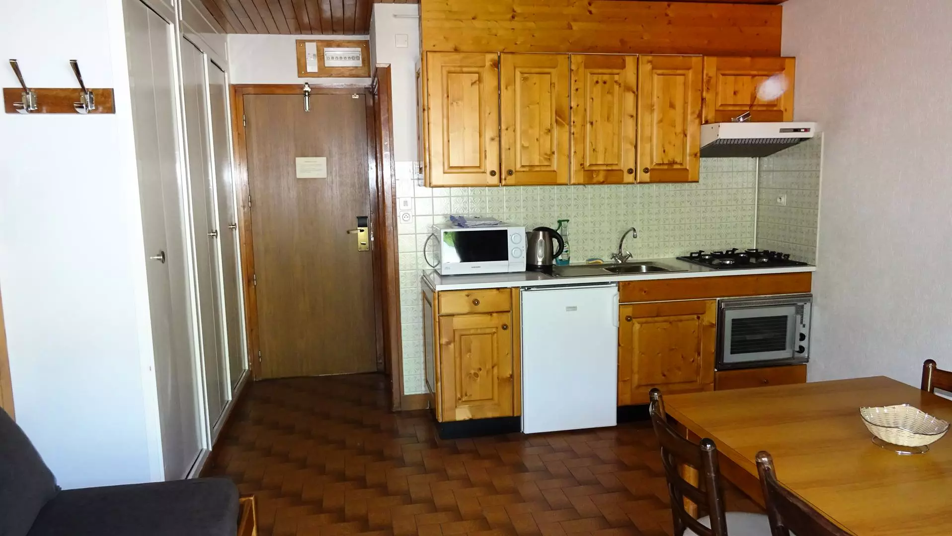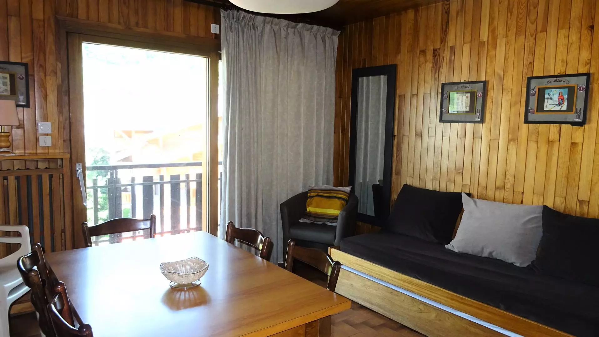 DESCRIPTIF : Entrée avec placard - Une chambre équipée d' 1 lit 2 personnes (160X200) + placard - Séjour salle à manger équipé d' 1 banquette 1 personnes (90) + 1 lit tiroir 1 personne (90), baies vitrée donnant sur un balcon avec mobilier de jardin, Vue centre village - Coin cuisine ouvert sur salle à manger entièrement équipée (4 feux gaz, frigidaire, hotte aspirante, grille-pain, bouilloire, cafetière électrique, four, micro-ondes avec batterie de cuisine ) - 1 WC indépendant - 1 salle de bain - 1 balcon. Animaux non acceptés. Non fumeurs.