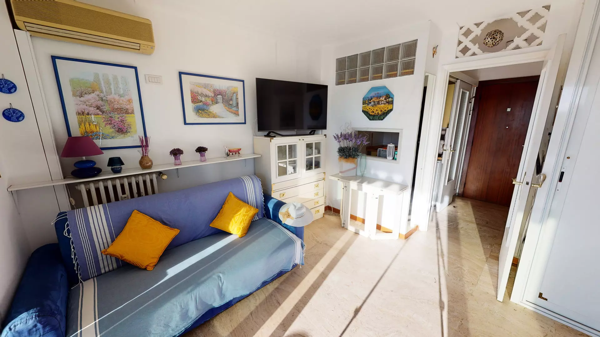 Séjour avec canapé lit et TV.