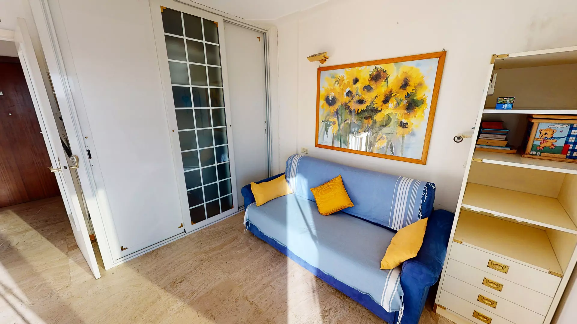 Séjour avec 2 canapé-lits 160x200cm, TV écran plat au mur et grand placard mural.