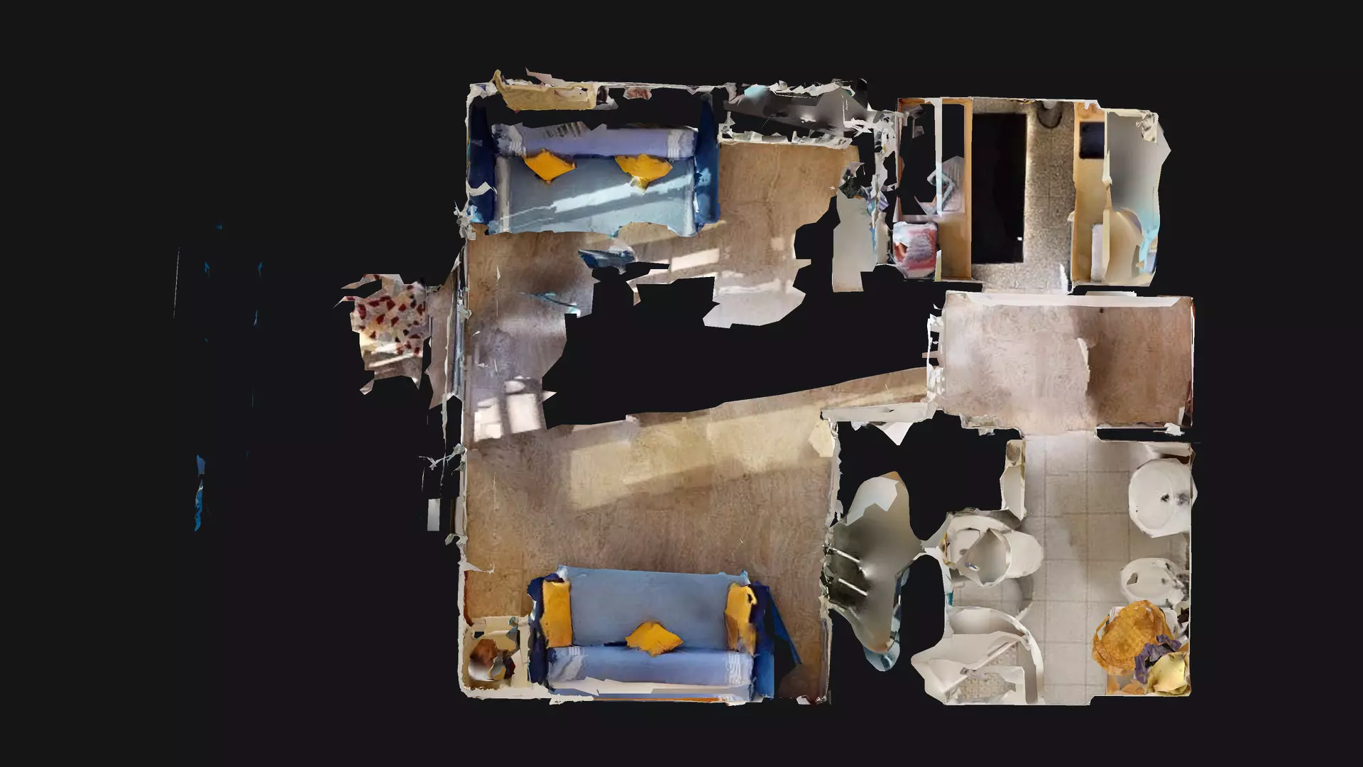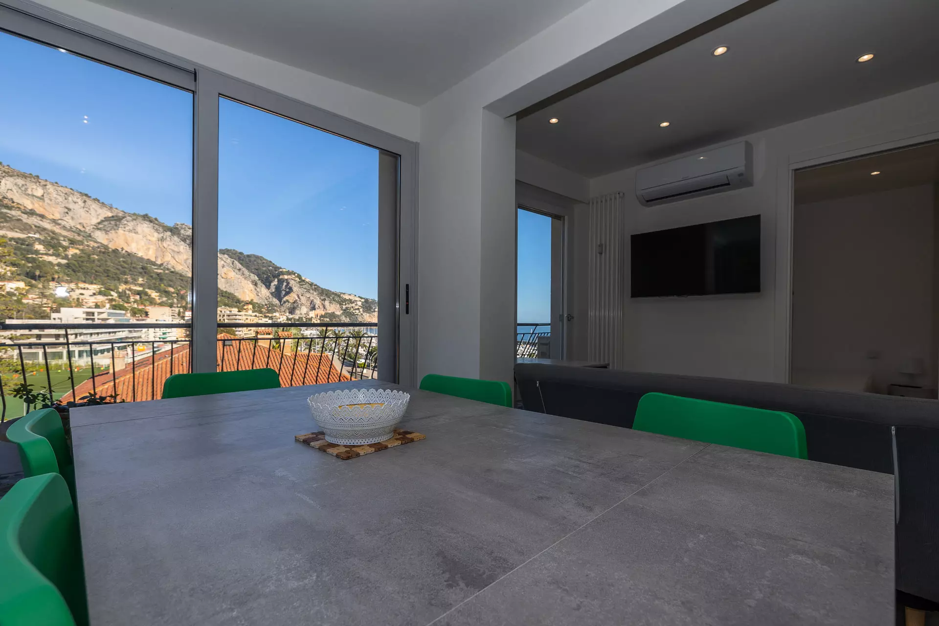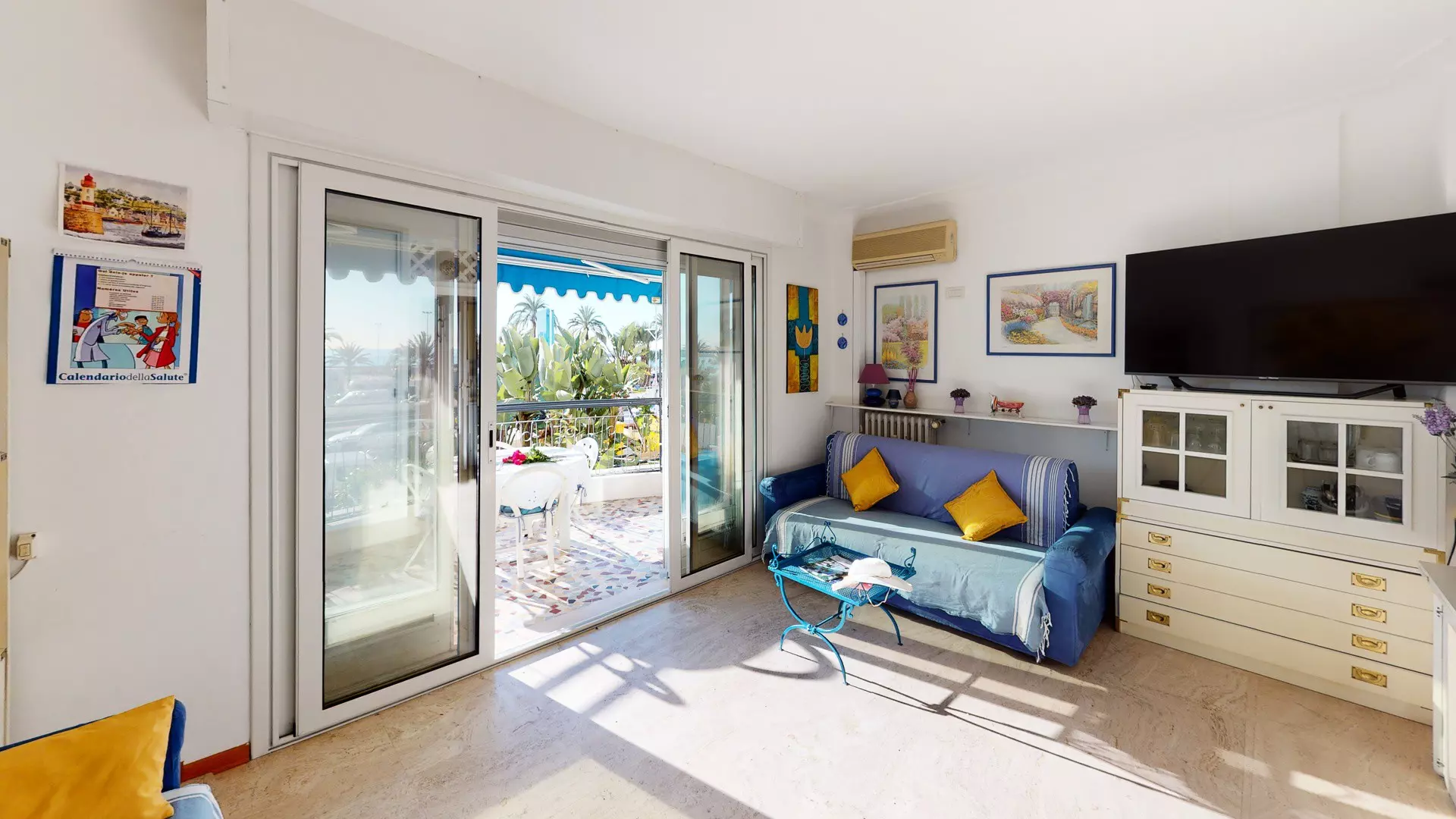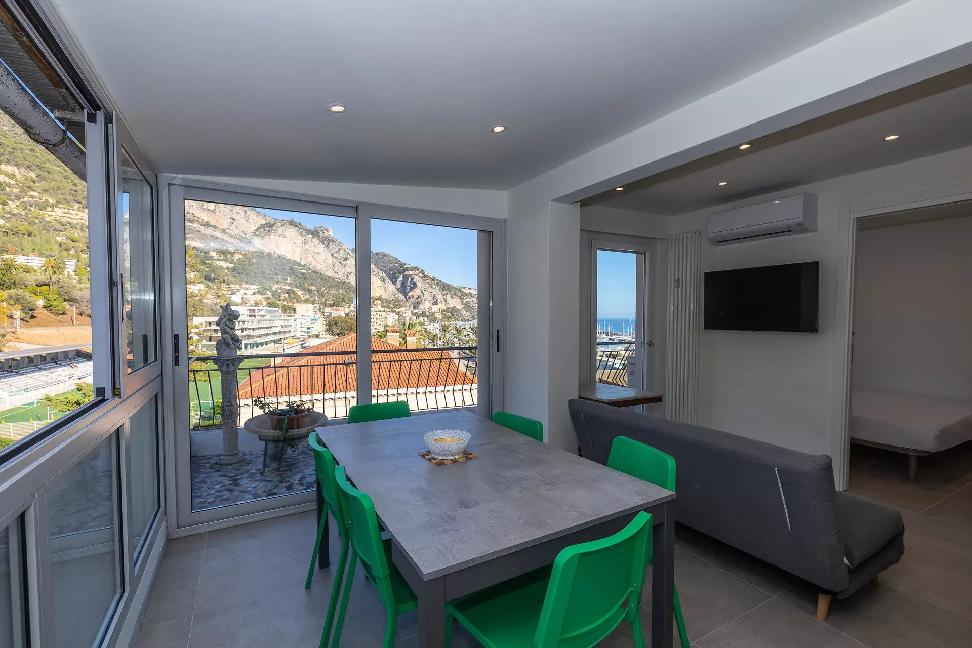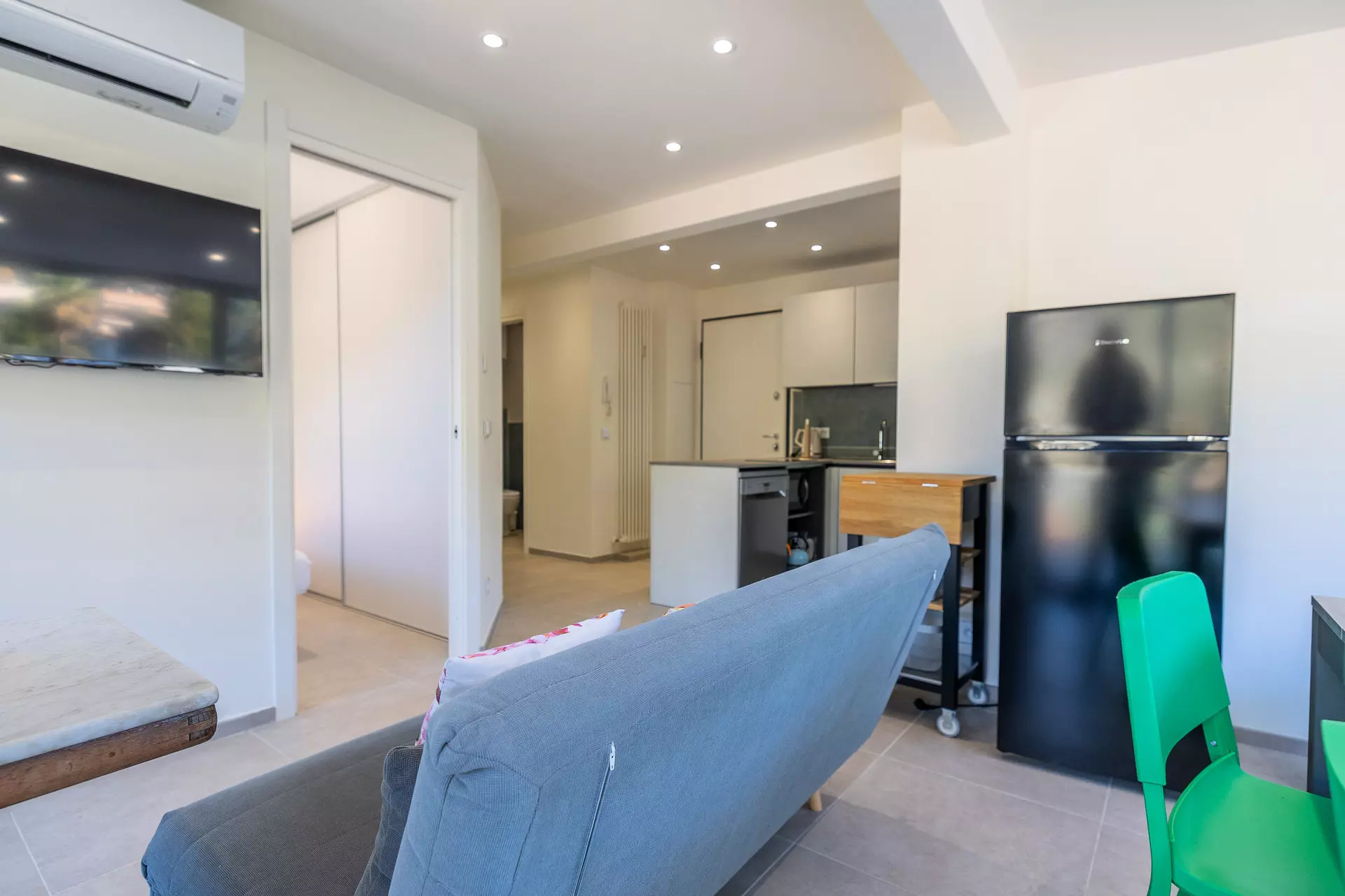 Séjour avec canapé lit et TV grand écran plat au mur.
