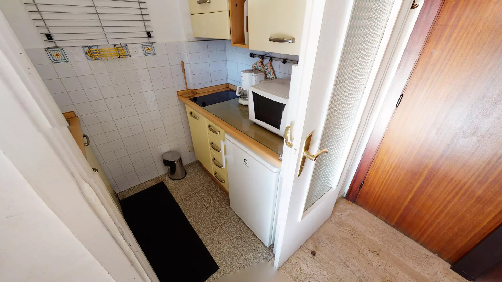Coin cuisine séparé équipé de petit four traditionnel, plaque vitrocéramique 2 feux, microonde et réfrigérateur top avec petite partie freezer.