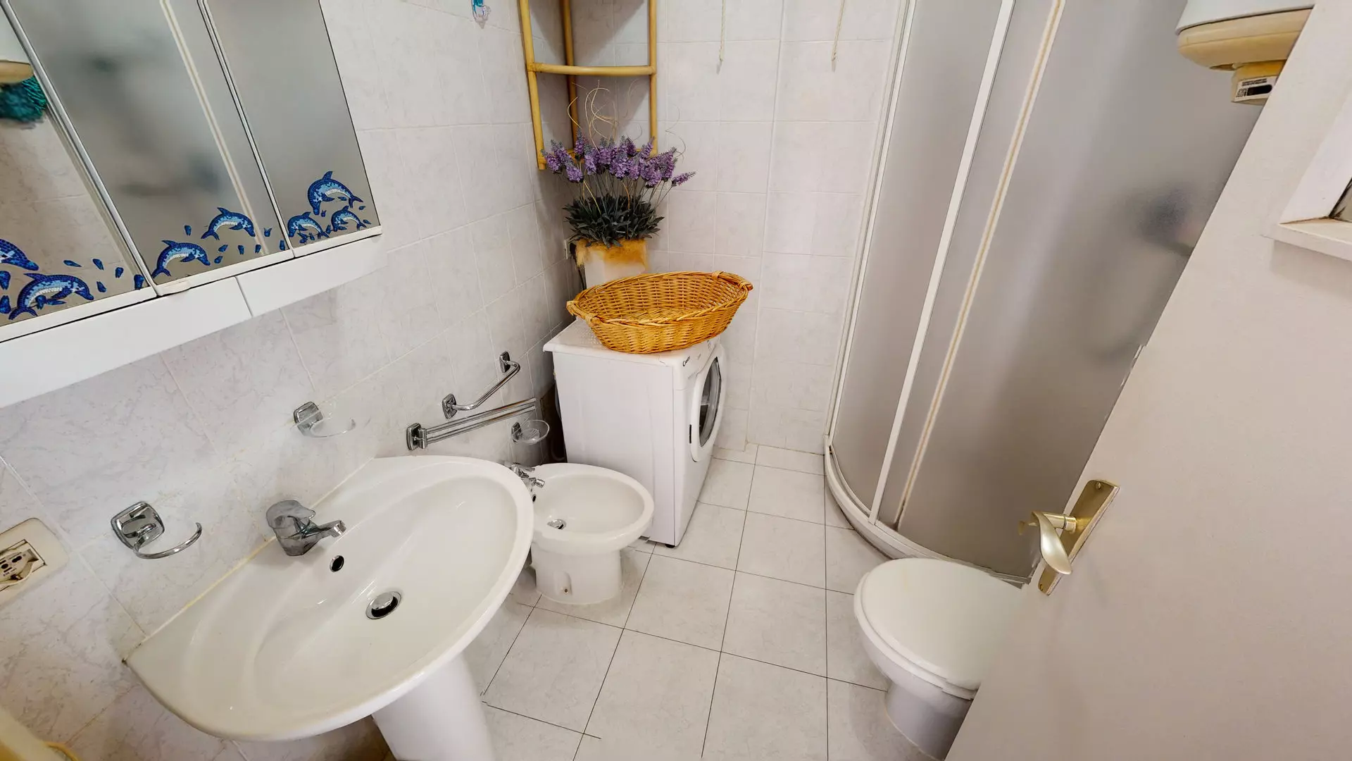 Salle de bains avec douche, WC , bidet et lave-linge.