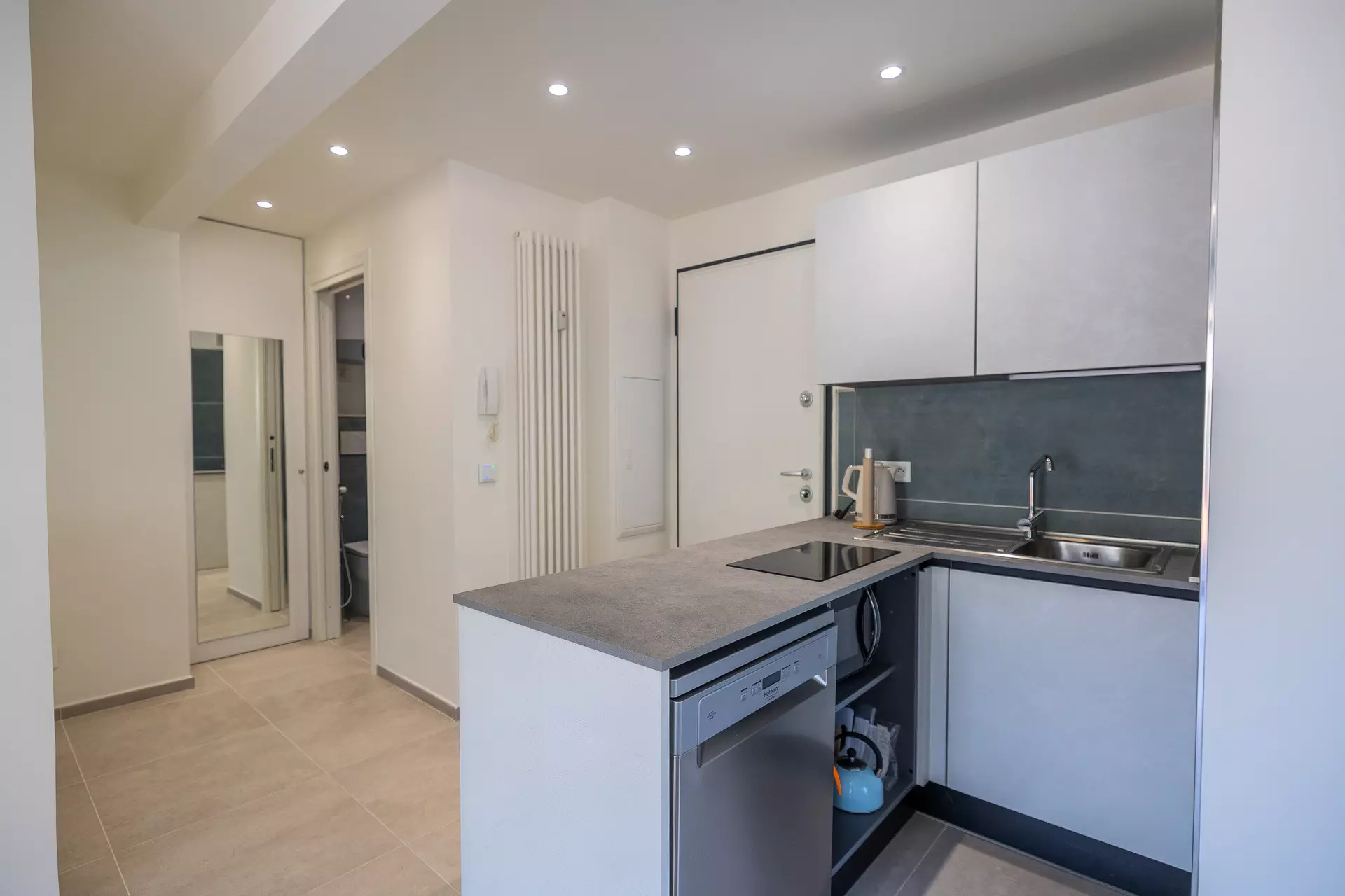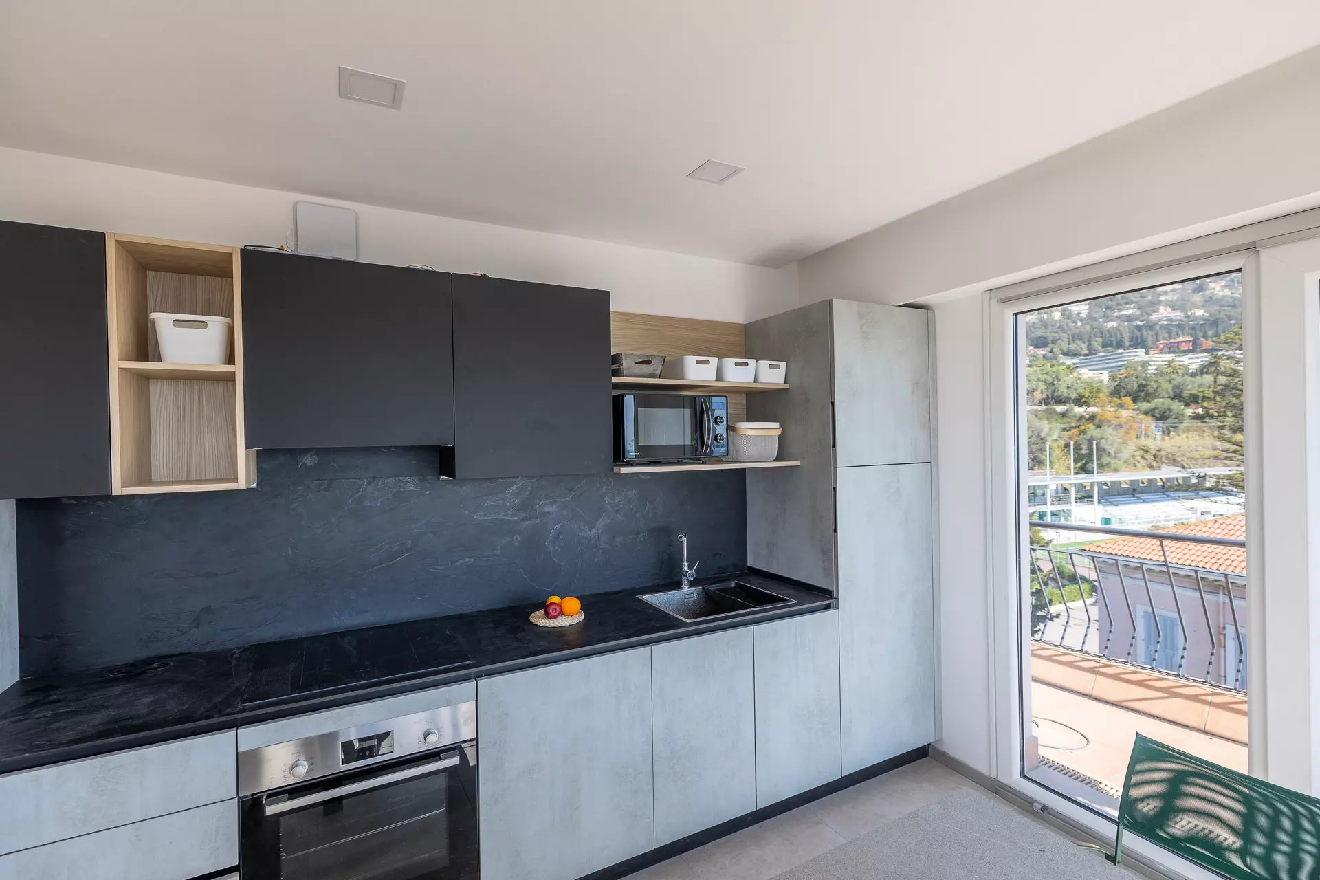 Coin cuisine dans le séjour équipé de four traditionnel, plaque à induction, microonde et lave-vaisselle.