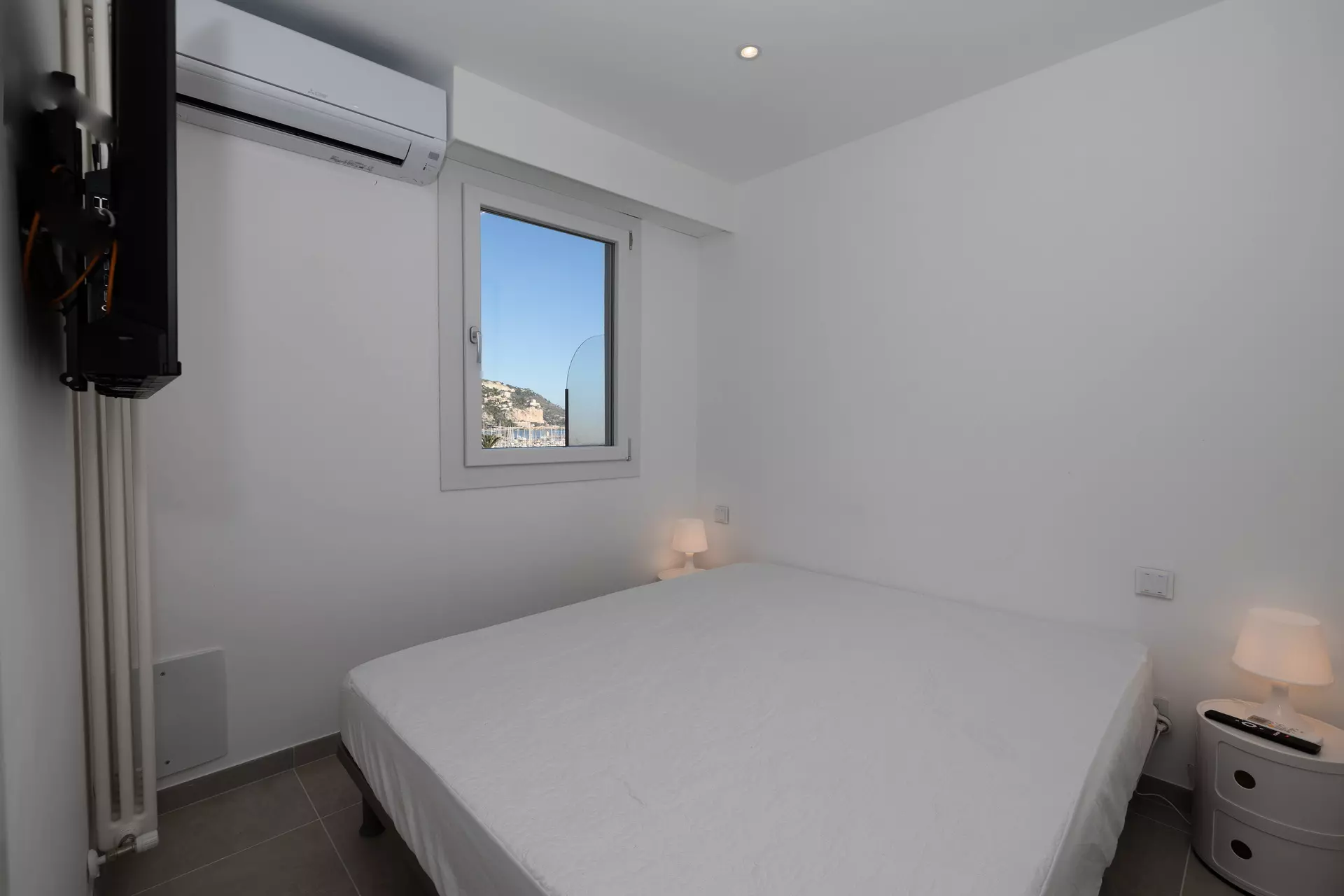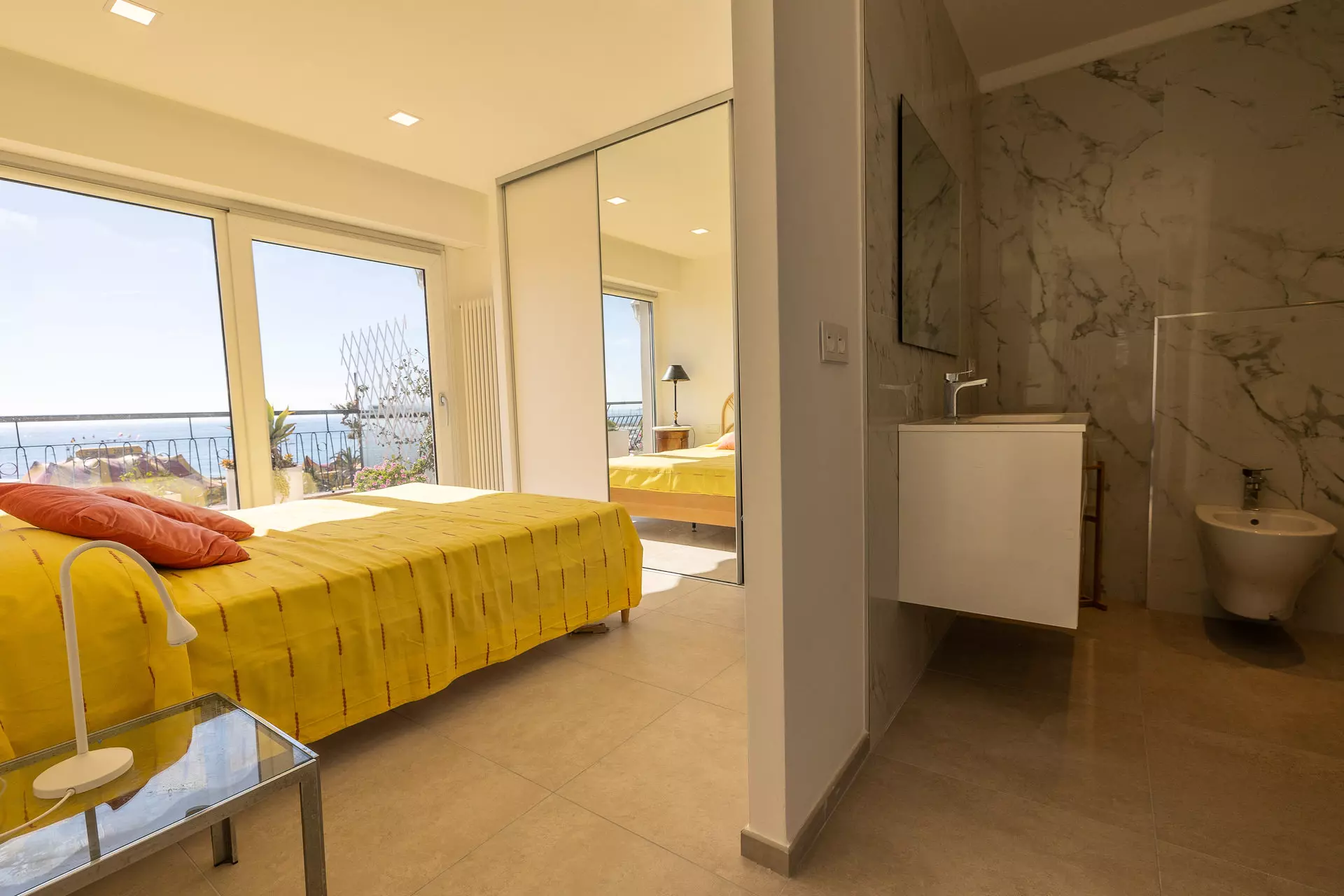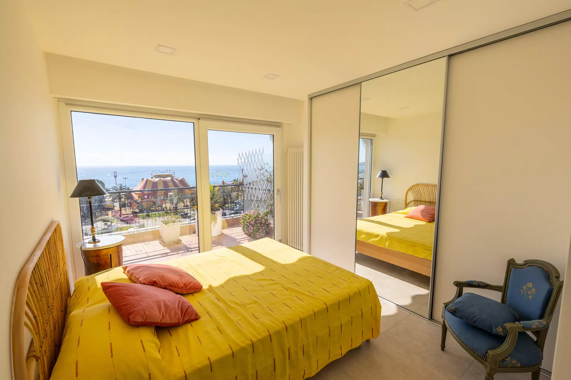 Chambre parentale avec grand lit 160x200cm et placards muraux donnant sur la terrasse face mer.