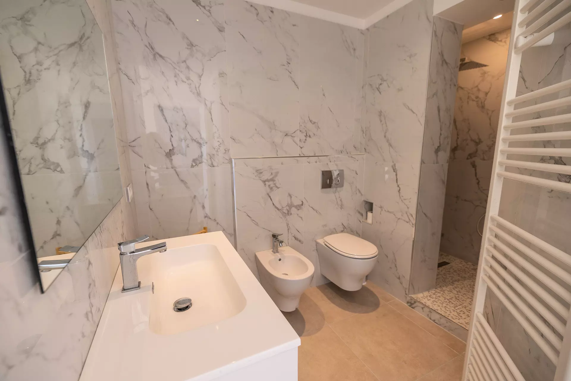 Salle d'eau attenante à la chambre composé de douche, WC et bidet.