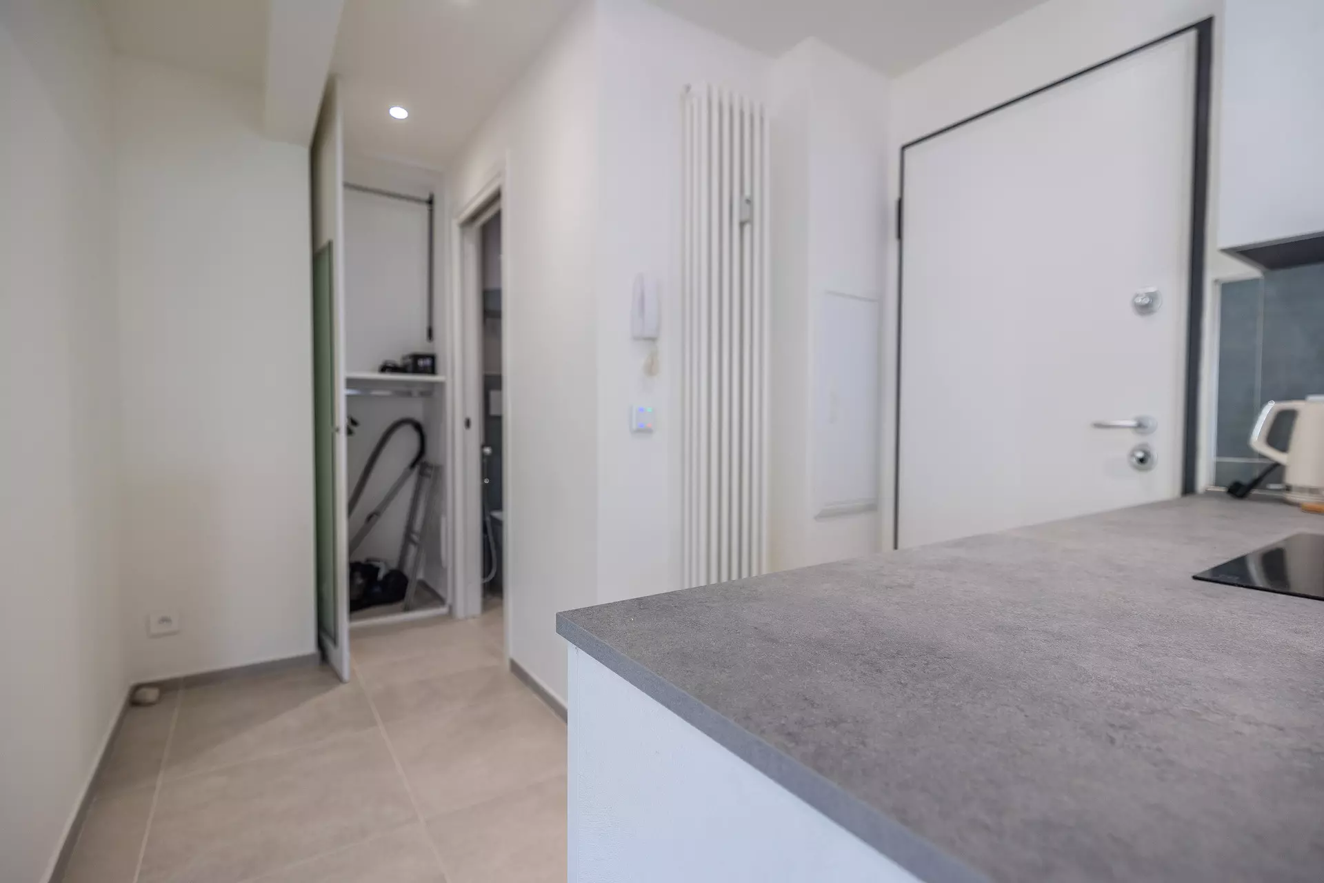 Coin cuisine dans le séjour équipé de réfrigérateur, lave vaisselle, microonde et plaque à induction.