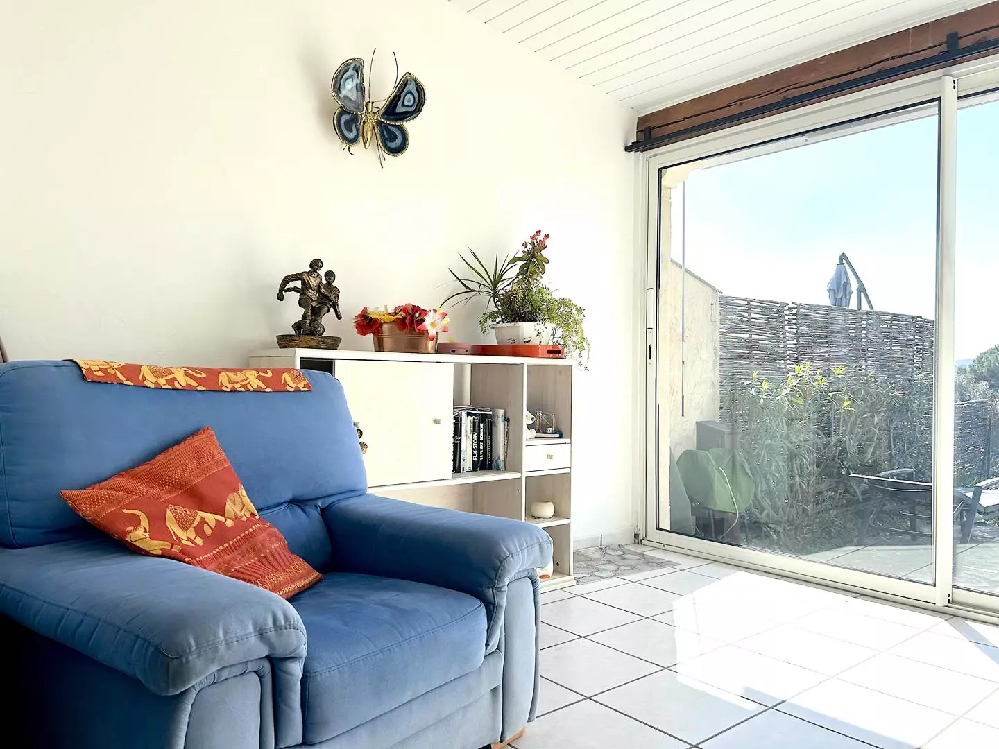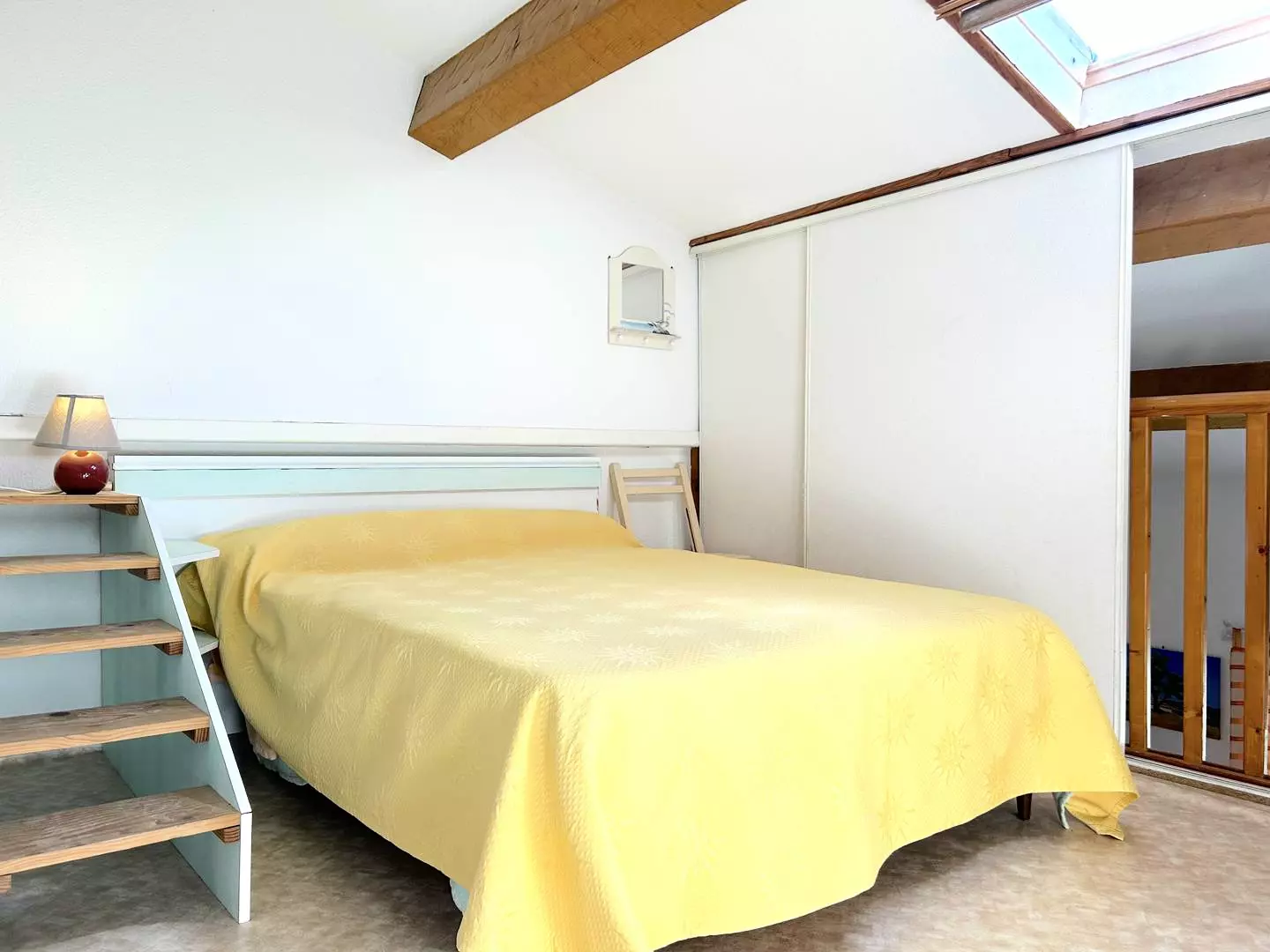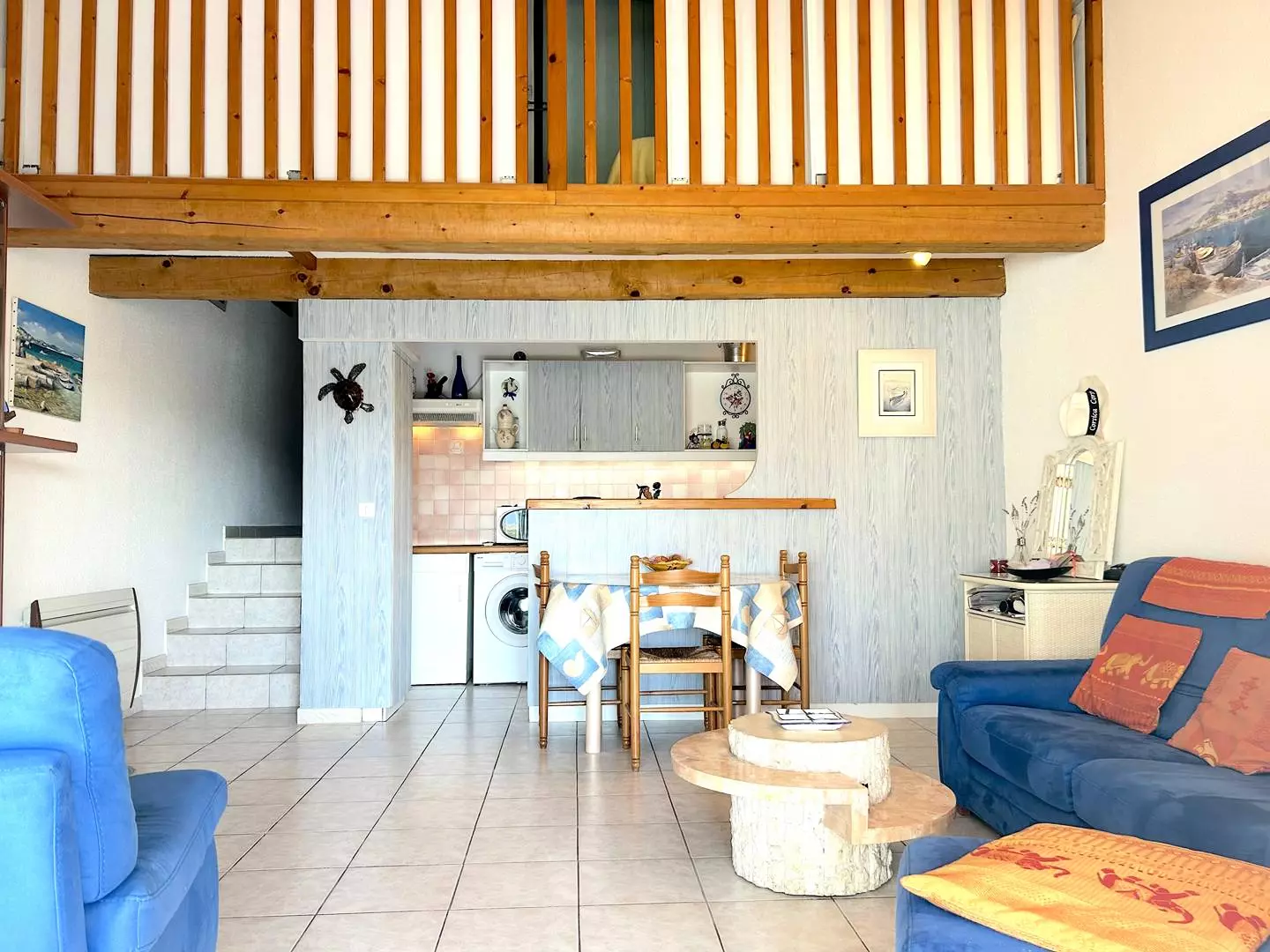 La location vous propose deux terrasses fleuries avec store banne et petit aperçu mer, un séjour ouvrant sur une véranda avec table de repas et coin lecture, une cuisine équipée, une chambre avec lit double ainsi qu'une mezzanine avec lit double également, puis une salle d'eau avec wc.