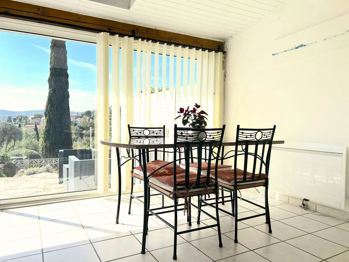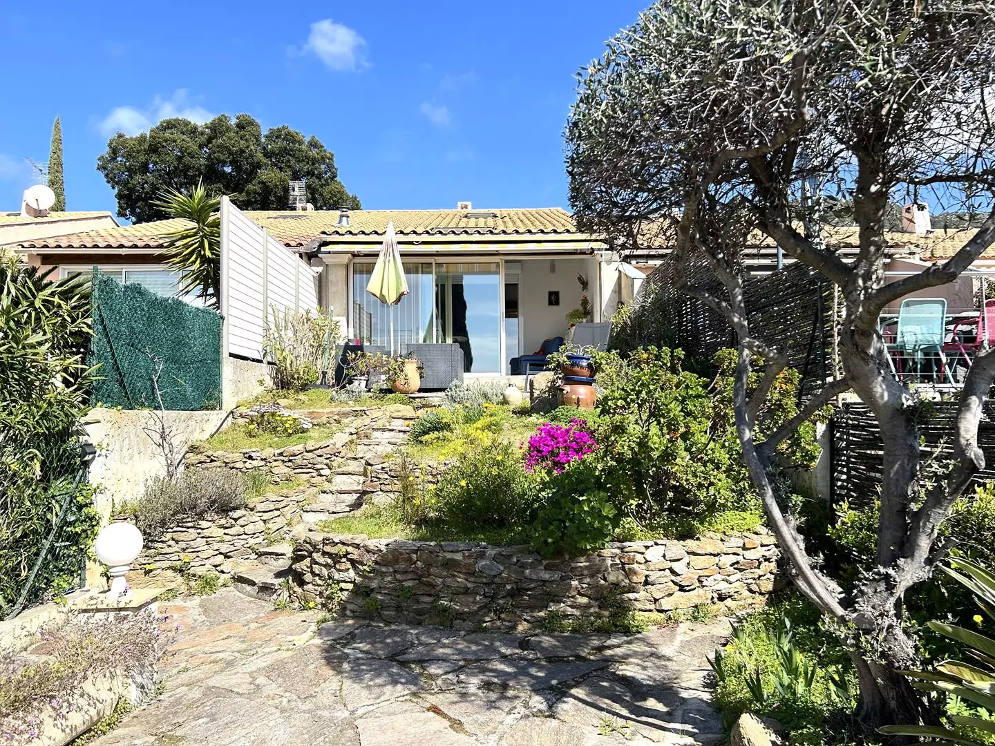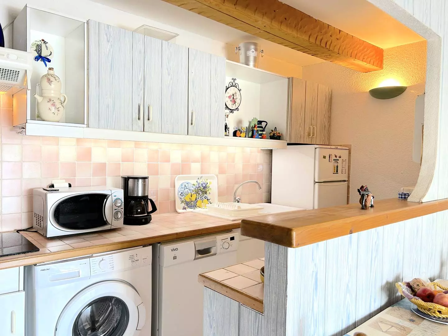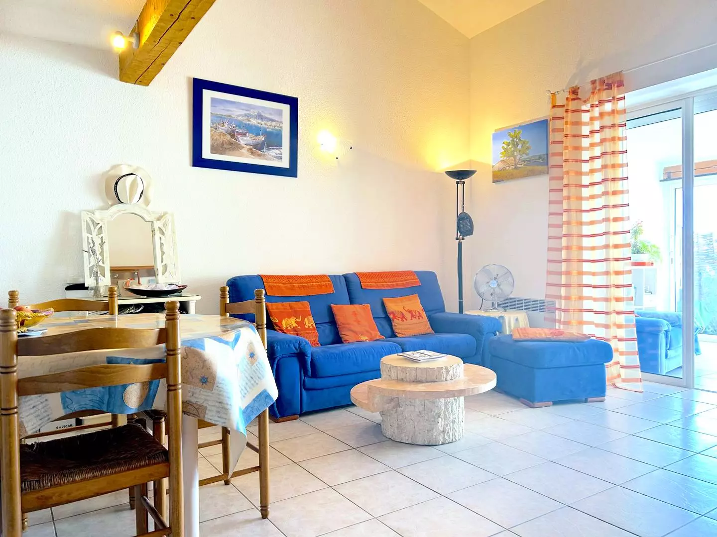 La location vous propose deux terrasses fleuries avec store banne et petit aperçu mer, un séjour ouvrant sur une véranda avec table de repas et coin lecture, une cuisine équipée, une chambre avec lit double ainsi qu'une mezzanine avec lit double également, puis une salle d'eau avec wc.