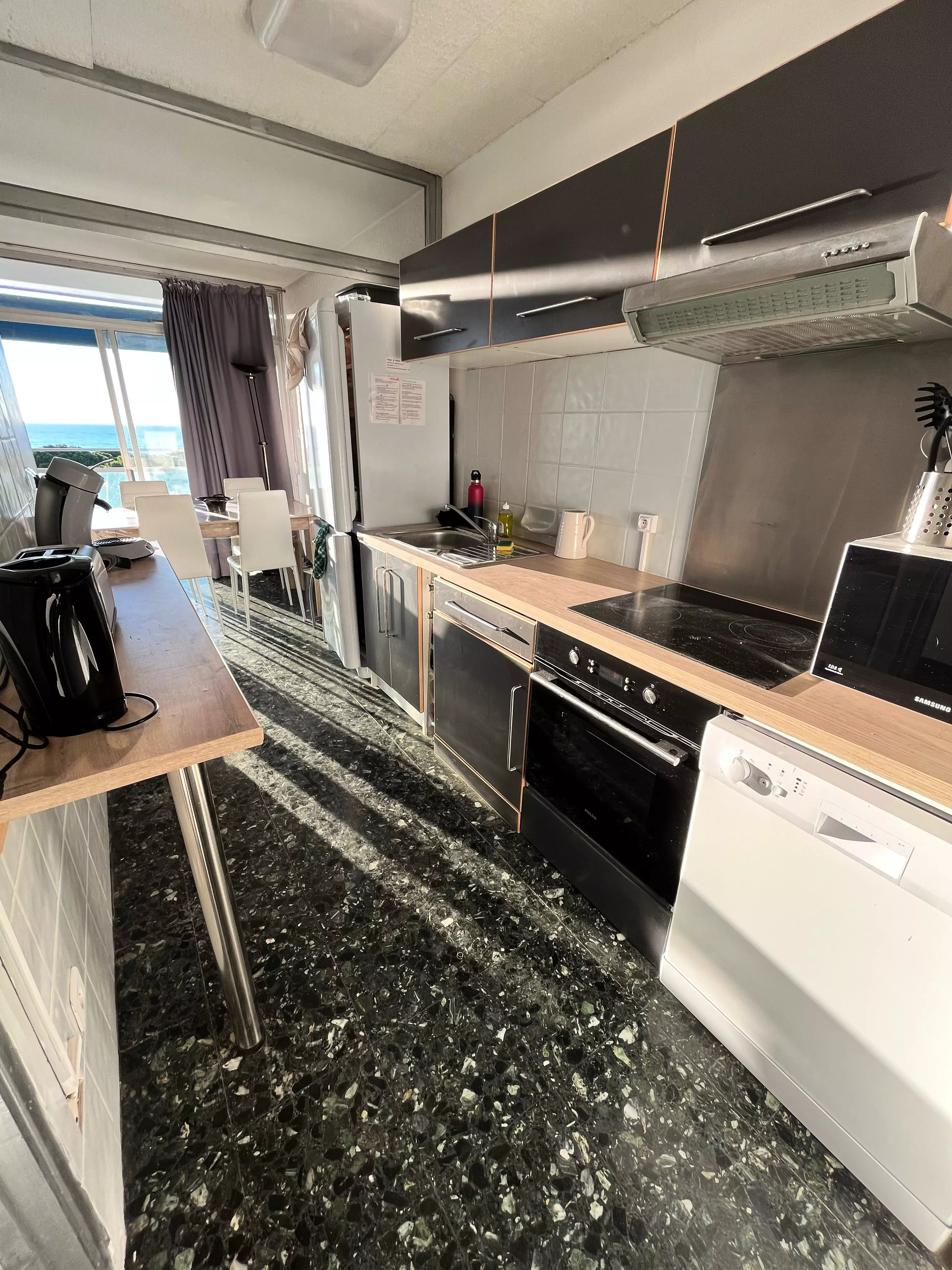 Les atouts de votre location : Appartement de 60 m², orienté au Sud, grande baie vitrée avec vue sur la mer, plage à 50 m et proche des commerces. Salle à manger salon avec télévision, cuisine équipée ouverte avec plaques, réfrigérateur, four, micro ondes, lave vaisselle , cafetière Senseo. Terrasse donnant coté mer avec guéridon , chaises et 2 chaises longues. Salle de bain avec machine à laver.