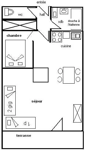 Chambre : 2 lits 1 pers. et 2 lits superposés -SDB : douche, lave-linge - WC séparés. Cabinet de toilette dans la chambre avec douche et lavabo. Literie : couettes et couvertures -. Appartement non fumeur, animaux non admis. En option et en supplément: Ménage de fin de séjour, draps, serviettes, forfaits ski.