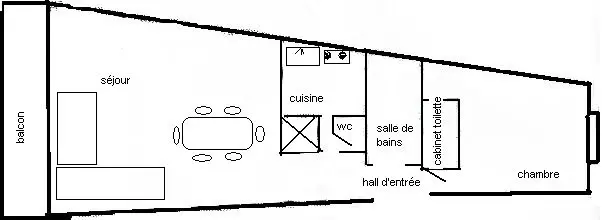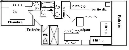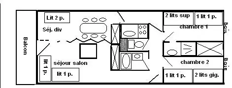 Appt 2 pièces divisible, 6/7 pers, 50m2, exposé SUD, balcon vue sur les pistes, au 3 ème étage sans ascenseur. Cuisine séparée : 4 plaques électriques, refrigérateur, four mixte, lave-vaisselle, cafetière élect. - Séjour : 2 lits gigognes et 1 lit 1 pers 90x190, coin repas, - Partie divisible : 2 lits gigognes 90x190 - TV - Chambre : 1 lit double 160x200 - SDB : baignoire - WC séparés. Salle de douche et lavabo dans la chambre.- Literie : couvertures . Appartement non fumeur, animaux non admis. En option et en supplément: Ménage de fin de séjour, draps, serviettes, forfaits ski.