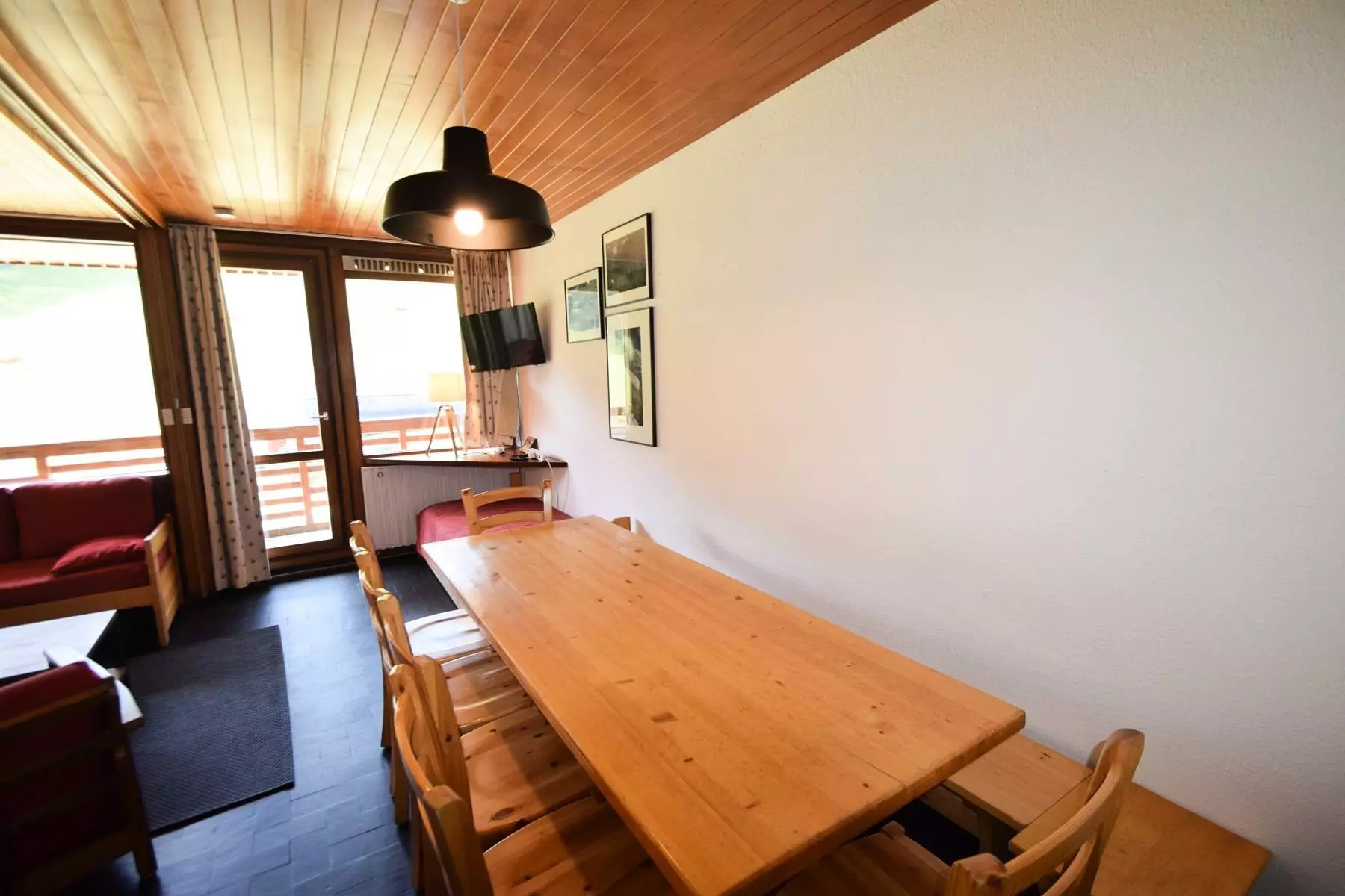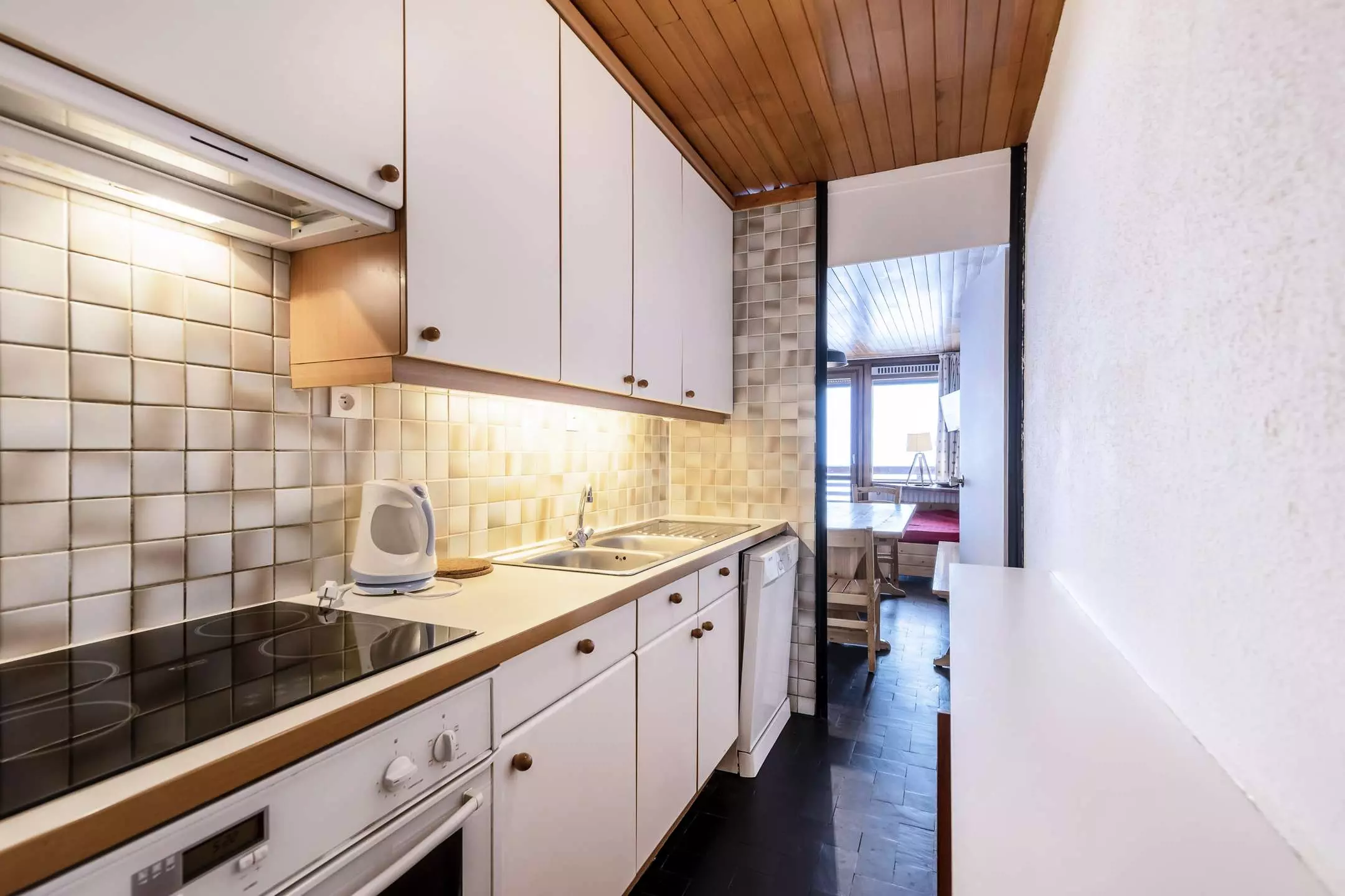 Appt 2 pièces, 6 pers, 48m2, exposé SUD, balcon vue sur les pistes, au 3 ème étage sans ascenseur. Cuisine séparée : 4 plaques vitro-céramiques, refrigérateur, four, lave-vaisselle, cafetière élect. - Séjour : 2 lits gigognes, coin repas,TV
