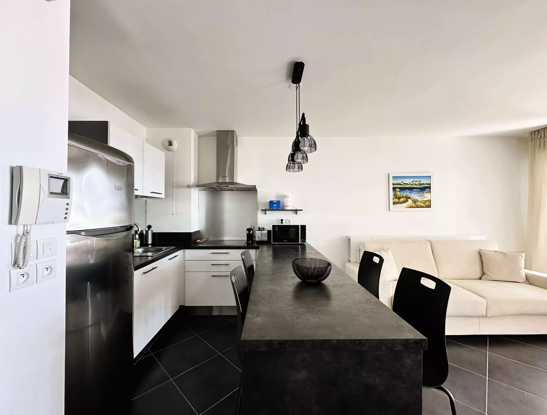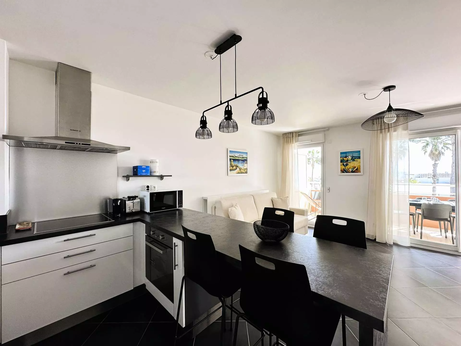 Une cuisine entièrement équipée (four électrique, plaque induction, micro-ondes, cafetière Nespresso, lave-vaisselle...) ouverte sur un séjour avec un canapé convertible, un coin télévision, le tout donnant sur une terrasse aménagée avec vue mer.