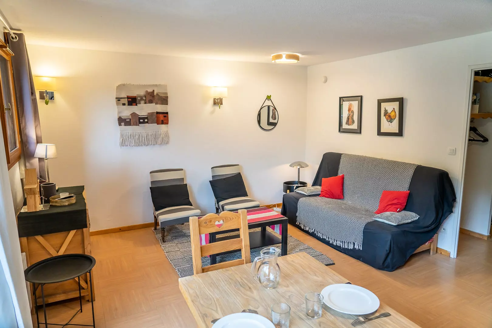 La pièce de vie se compose d'un coin salon avec canapé et d'une cuisine très bien équipée avec four, lave-vaisselle, micro-ondes, plaque de cuisson, réfrigérateur, appareil à raclette... La table à manger peut accueillir 7 convives pour partager des spécialités montagnardes avec ceux que vous aimez.