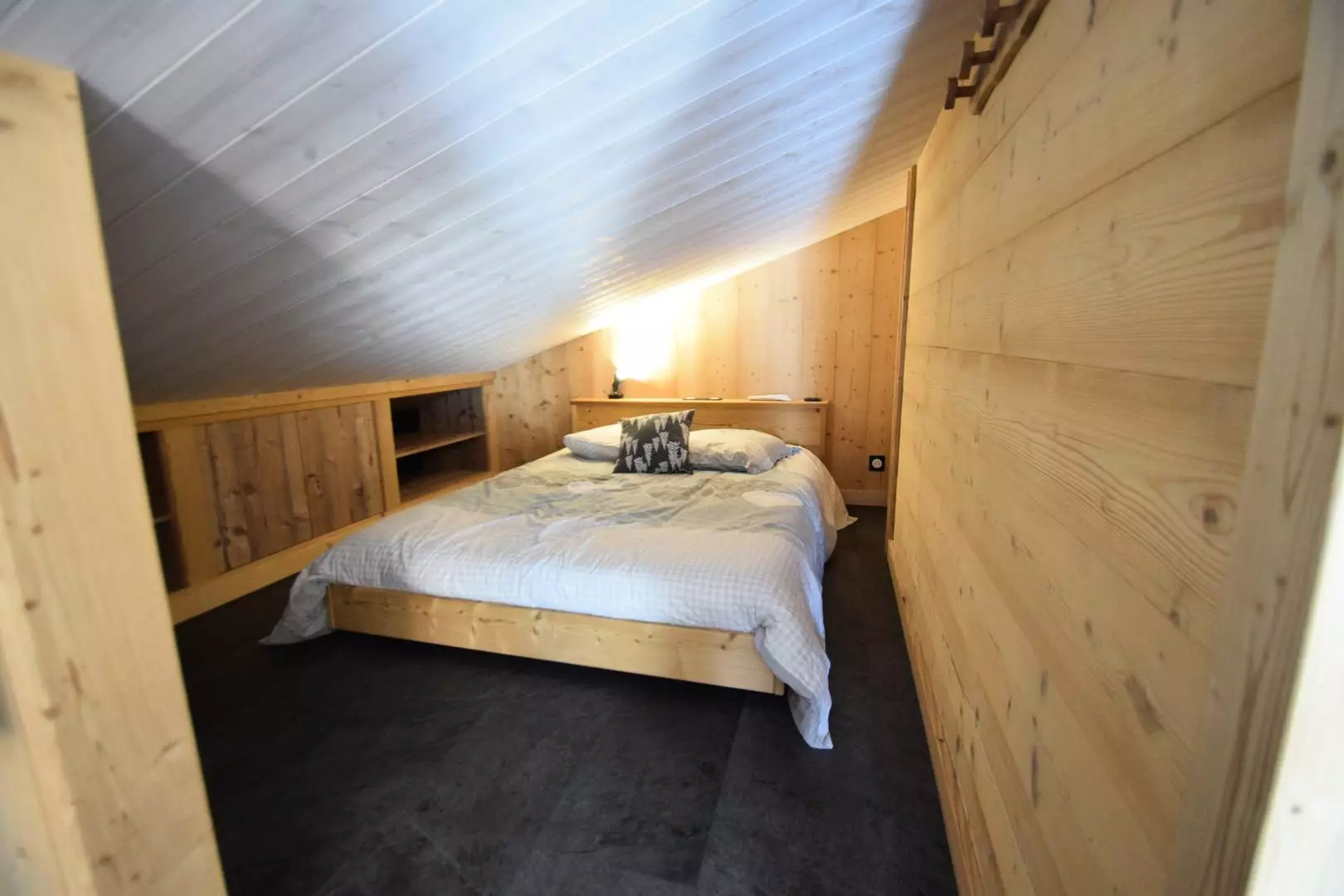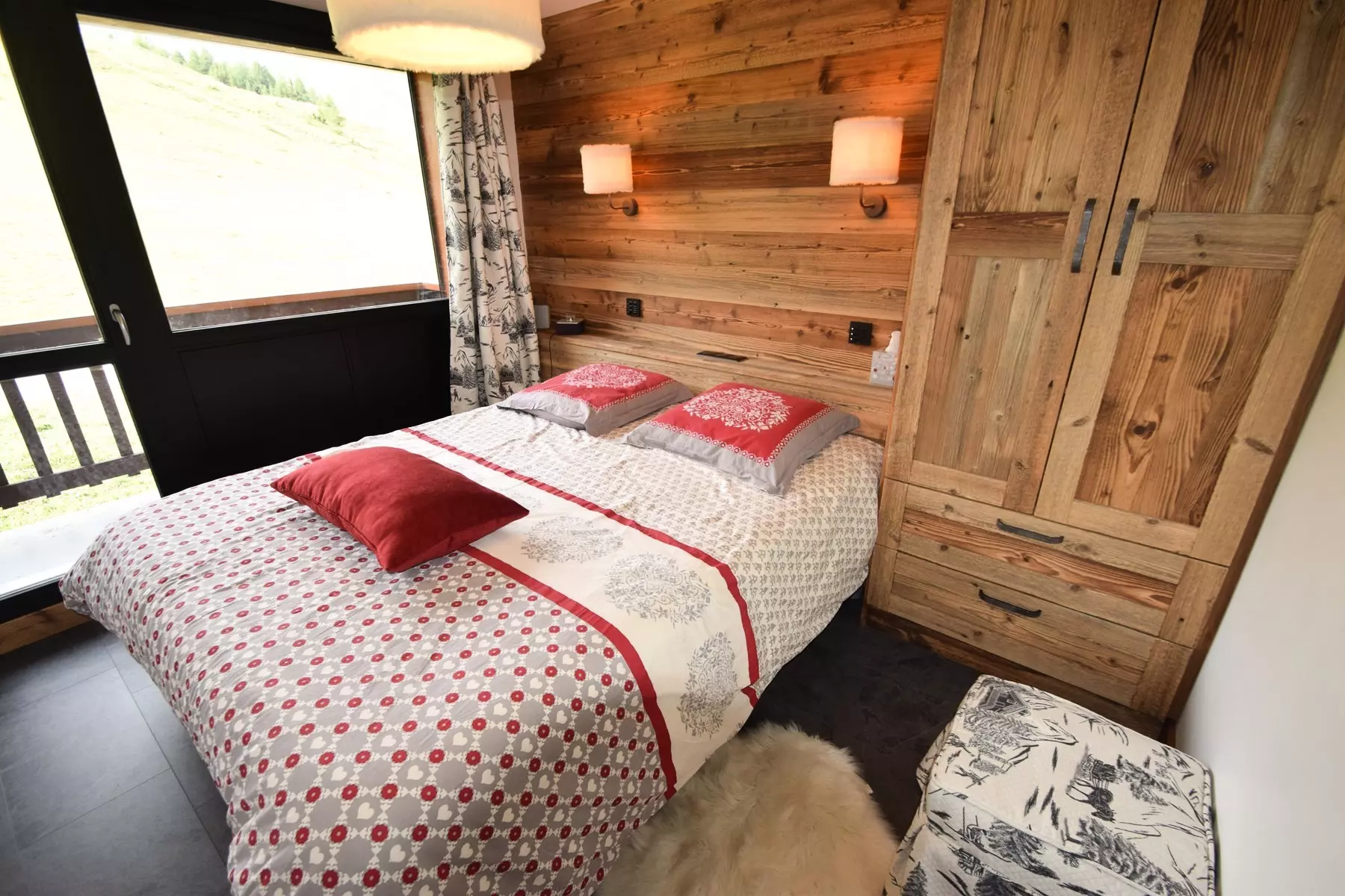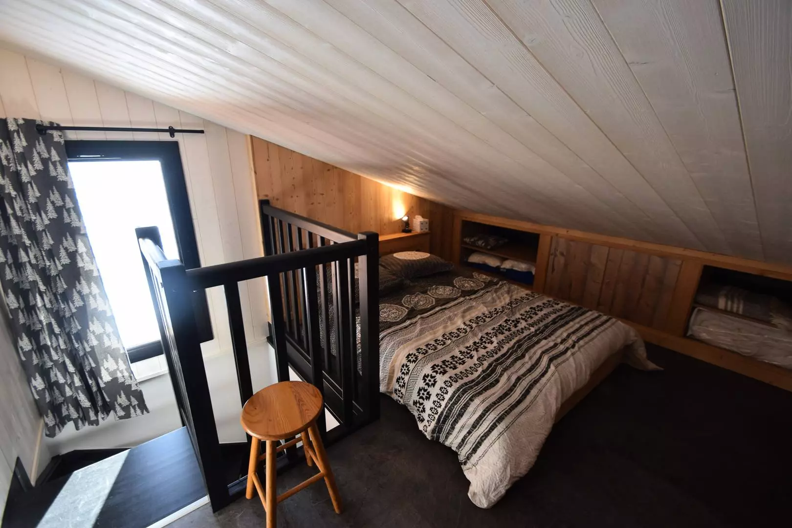 Bel appartement de 5 pièces, 60m2 env + sous pente 20m2 utiles env, en triplex, pour 8/10 pers. 2ème étage sans ascenseur, balcon avec belle vue sur les pistes - Étage intermédiaire : séjour avec coin repas, coin salon, 1 canapé-lit convertible 160cm. Cuisine ouverte : four, four micro-ondes, lave-vaisselle, réfrigérateur, 4 plaques induction, Nespresso (dosettes non fournies) hotte. 1 WC séparés, Lave-linge/séchant - ETAGE HAUT : Mezzanine ouverte : 1 lit double 140cm - CH 1 (sans porte) : sous pente : 1 lit double 140cm, TV - Rangements - Salle de douche : douche + WC inclus - ETAGE BAS : CH 2 : 1 lit double 160cm - TV, placard - CH 3 : 1 lit double 140cm - TV - SDB : baignoire - WC séparés -Sols : lames pvc - Ménage de fin de séjour, draps, serviettes et forfaits ski en option. ANIMAUX NON ADMIS Appartement non fumeur- Équipement musique - WIFI inclus - Volets roulants - 3 casiers à skis - Très Bel appartement chaleureux, rénové style contemporain Montagne, très belle vue sur Pistes.
