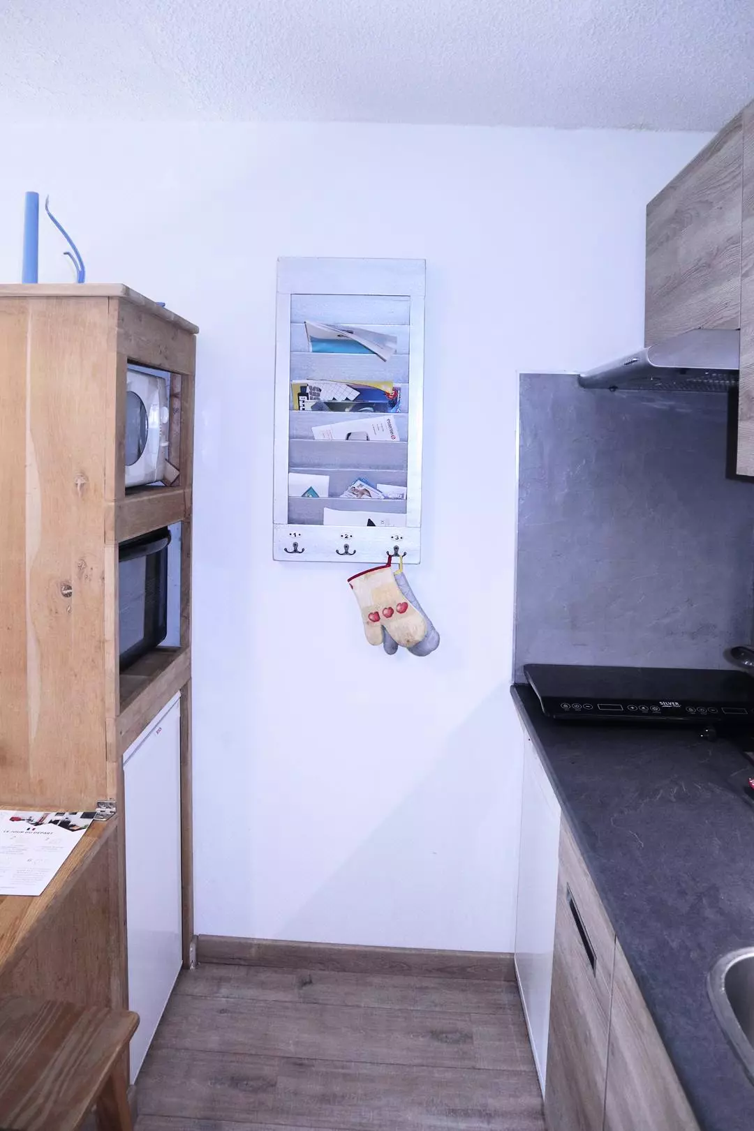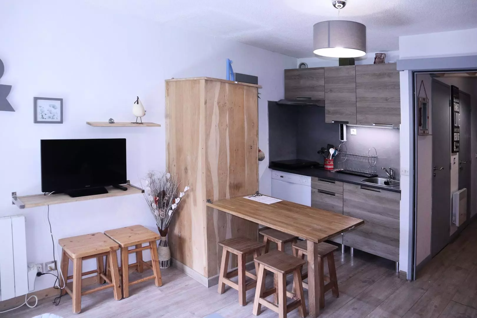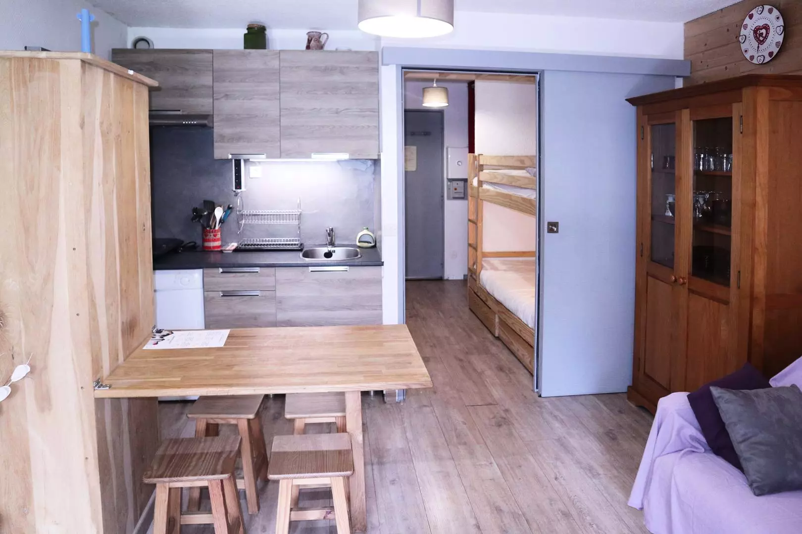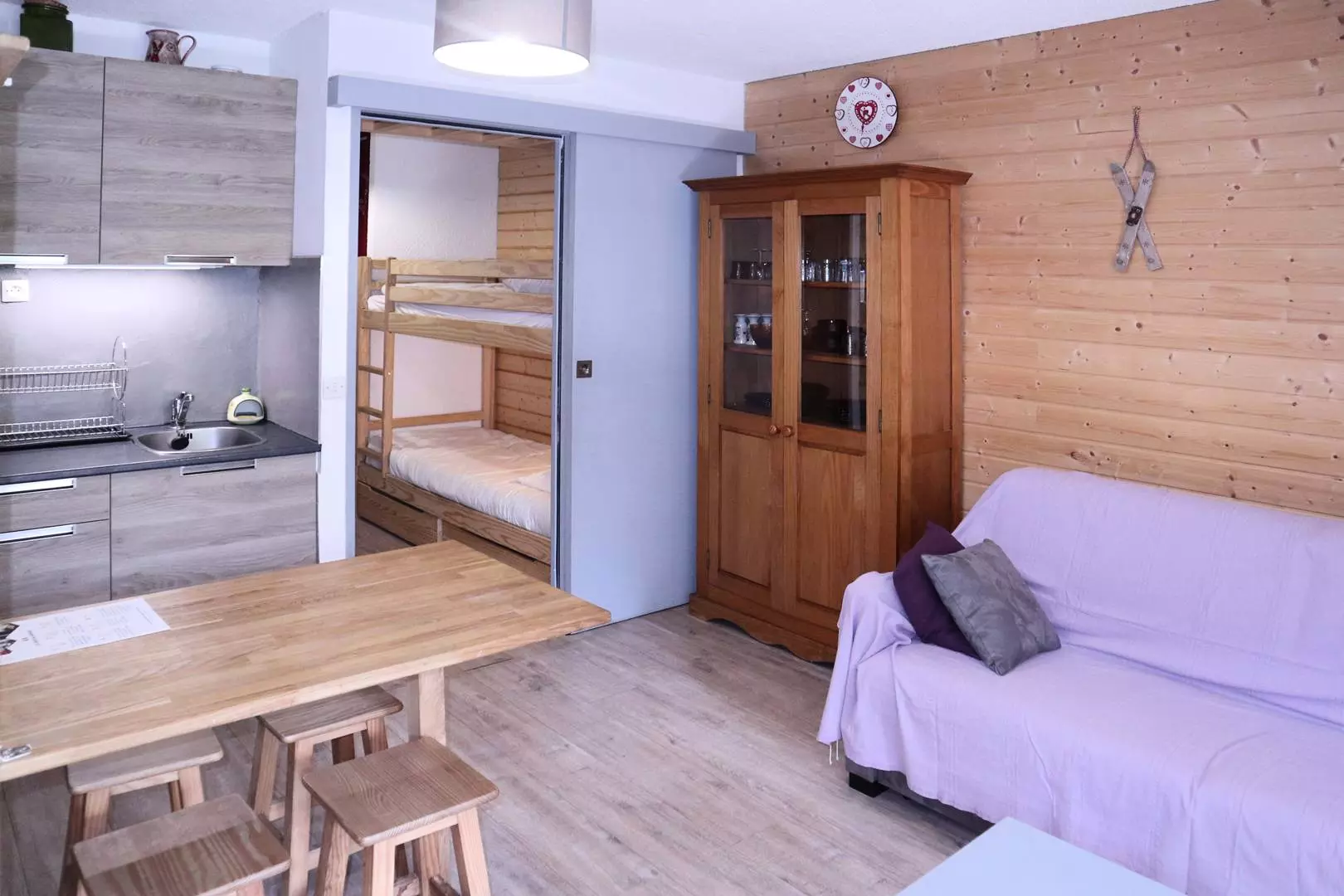 Quartier calme, au coeur des mélèzes,Studio équipé pour 4 personnes au 4ème étage de la résidence, à 250 mètres du nouveau télésiège 6 places de prébois, à 200 mètres des commerces et animations, logement confortable comprenant une entrée avec 2 lits superposés 1 place, un séjour avec 1 banquette convertible 2 places, un coin cuisine, une salle de bains et wc séparés. grand balcon exposition Ouest et bénéficiant d'une vue sur la vallée.