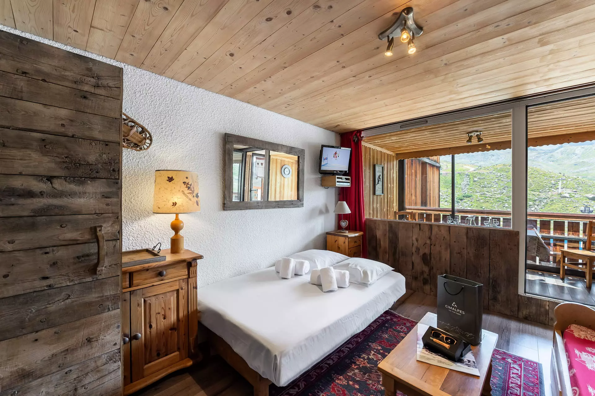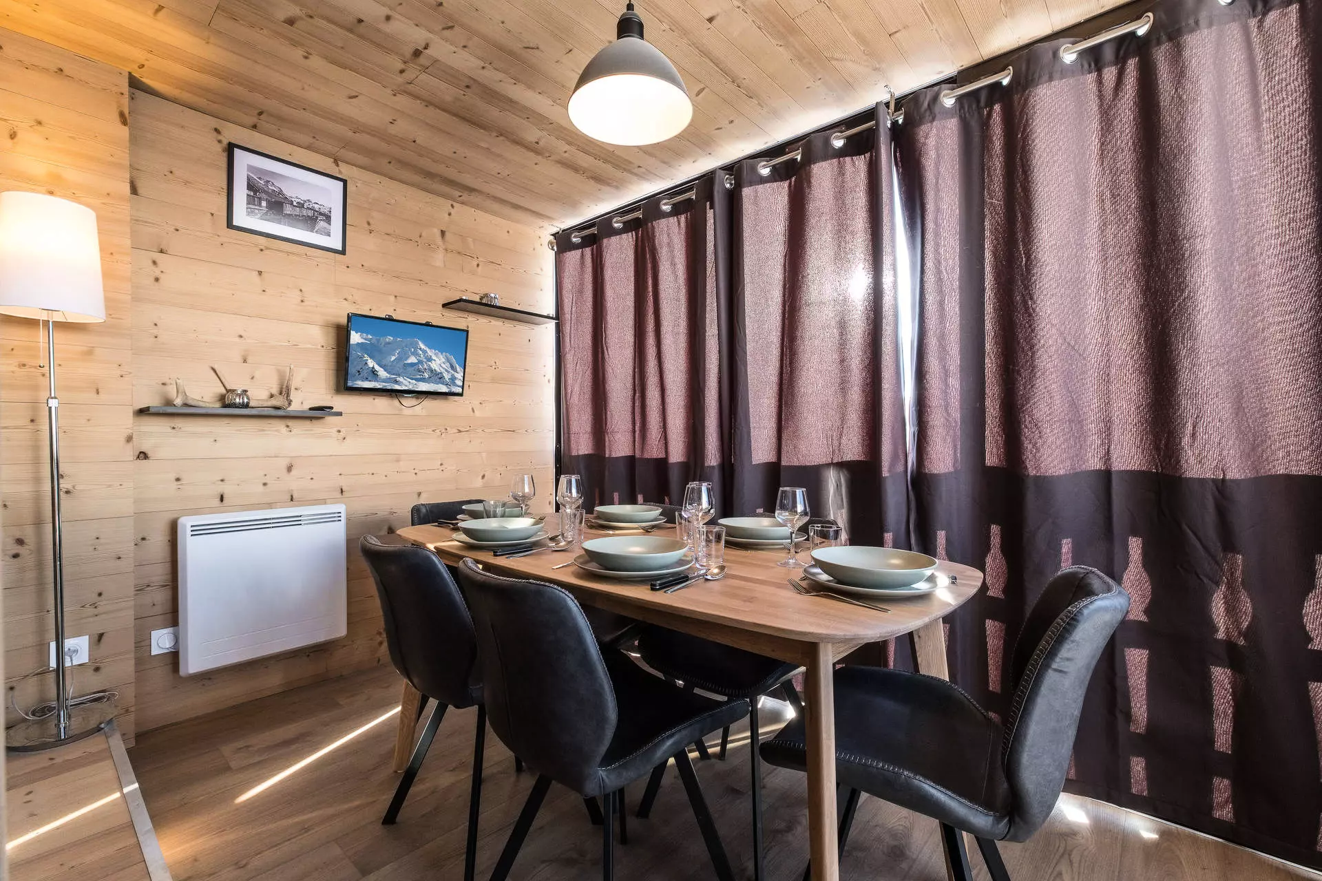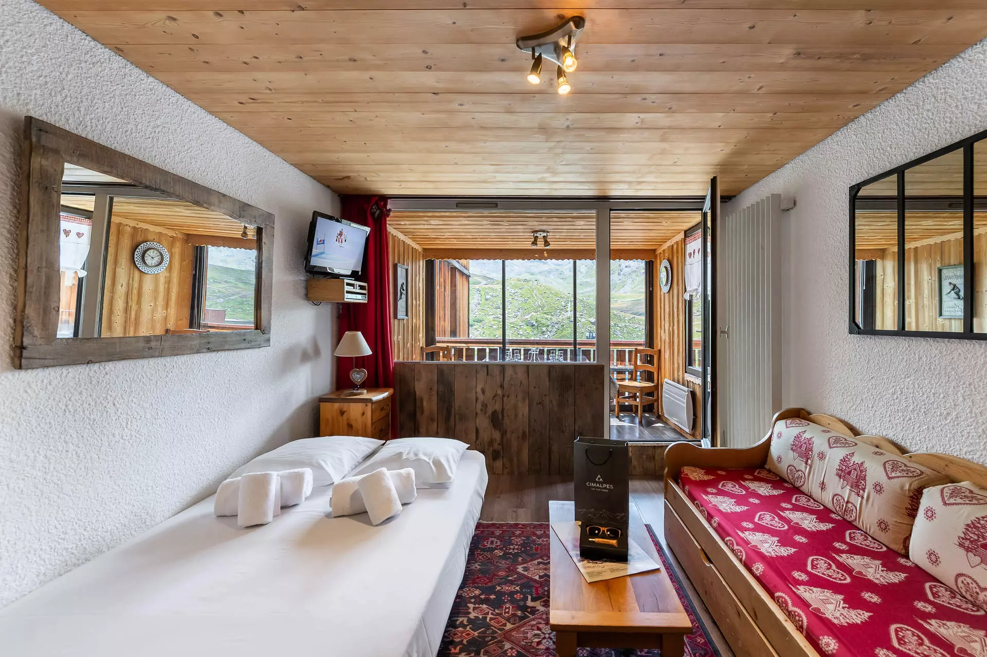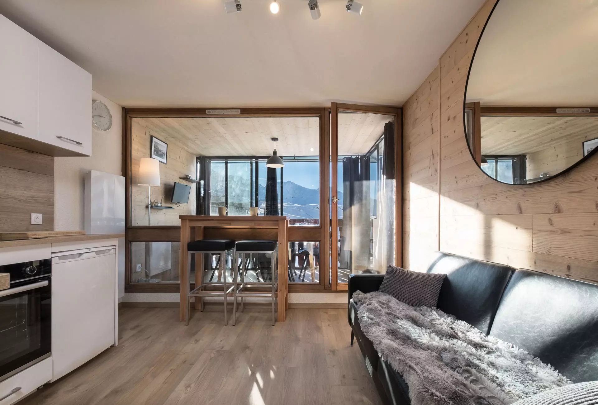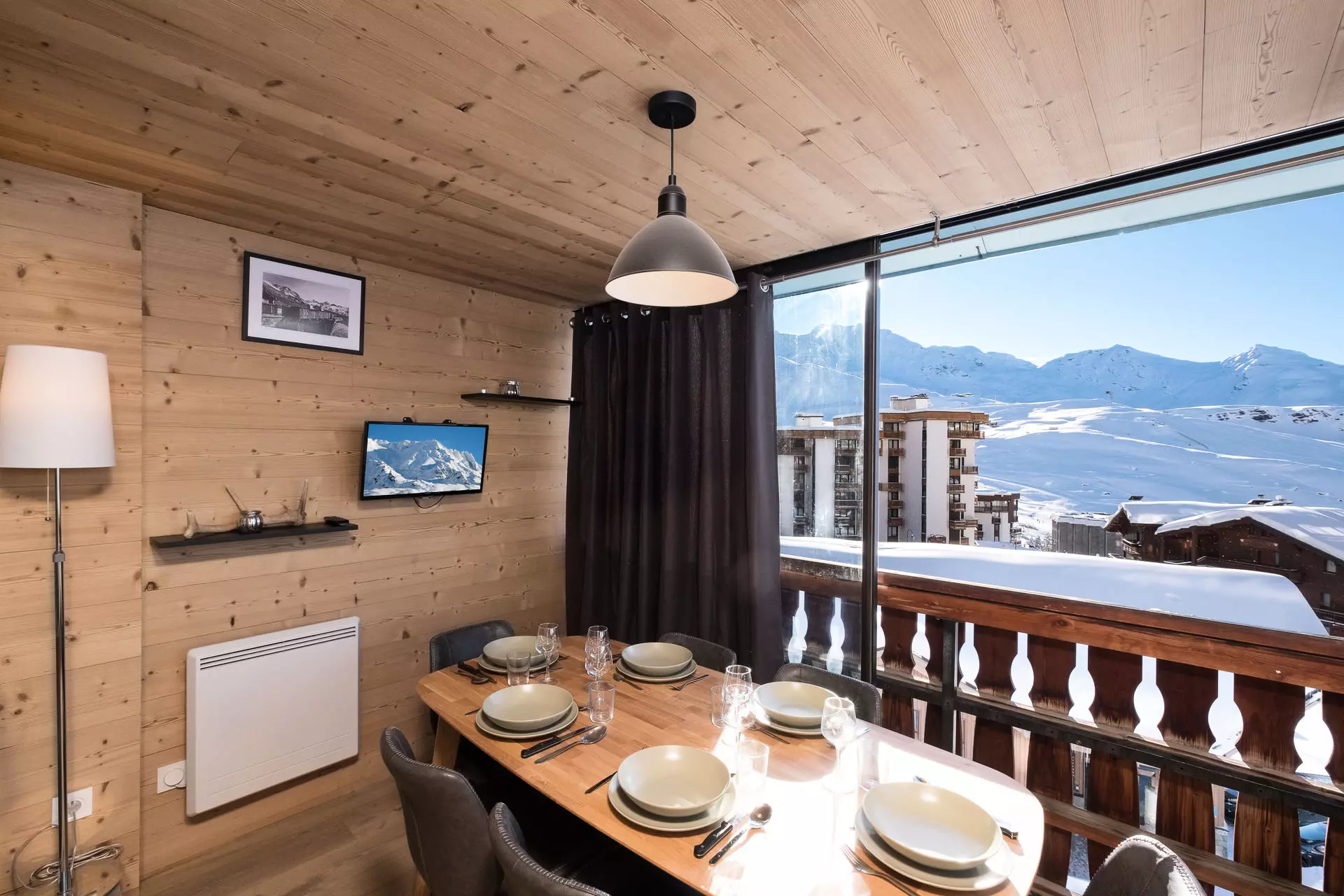 Appartement rénové de 41 m2 pour 6 personnes avec une superbe vue panoramique sur les montagnes et la station, exposé plein sud. Il est situé dans la résidence le Serac, dans un quartier calme de Val Thorens à moins de 50 m des pistes.