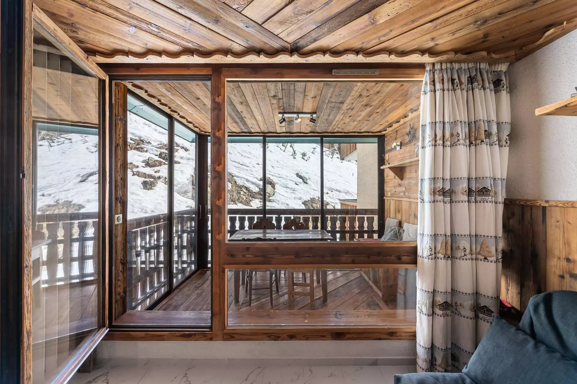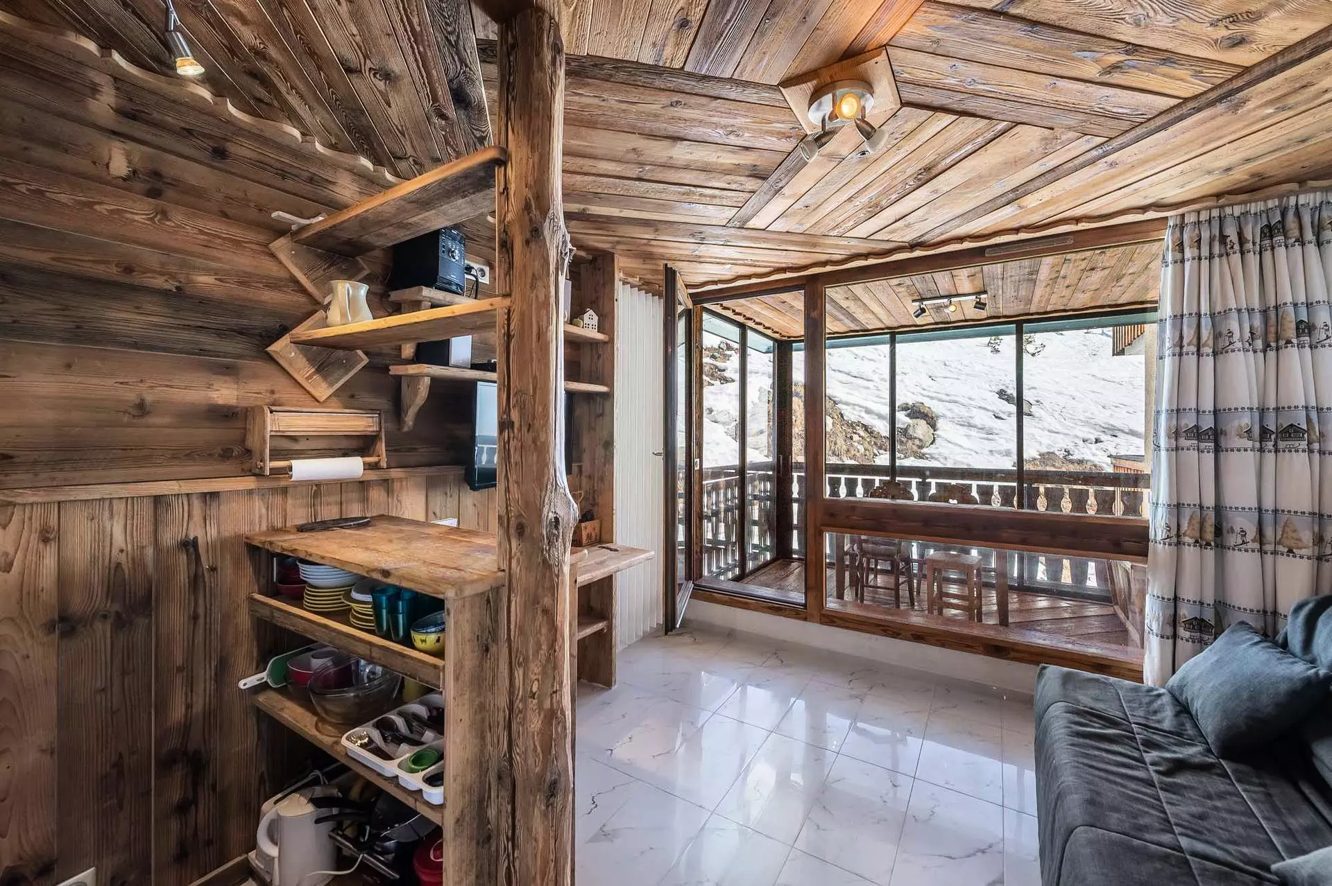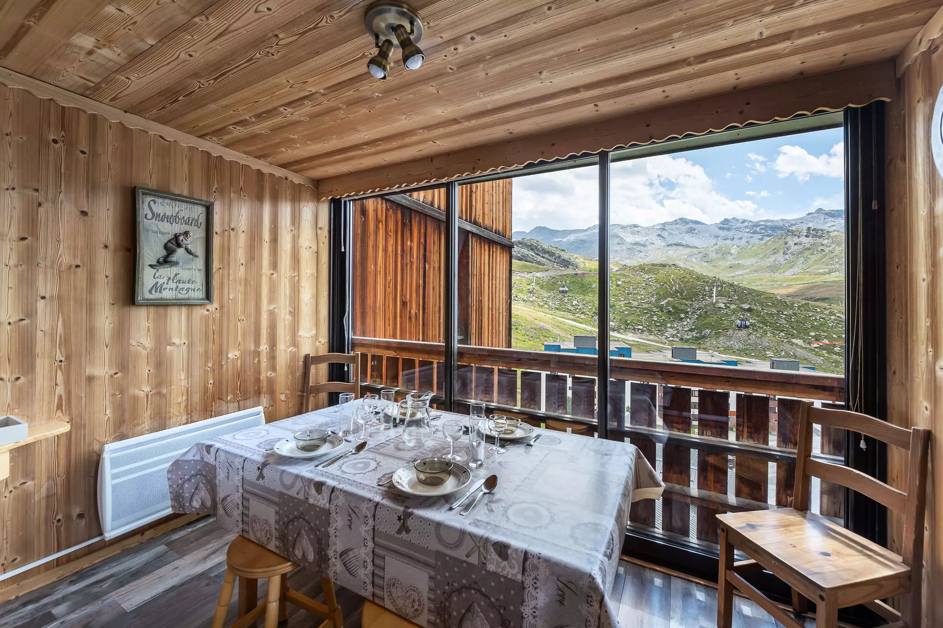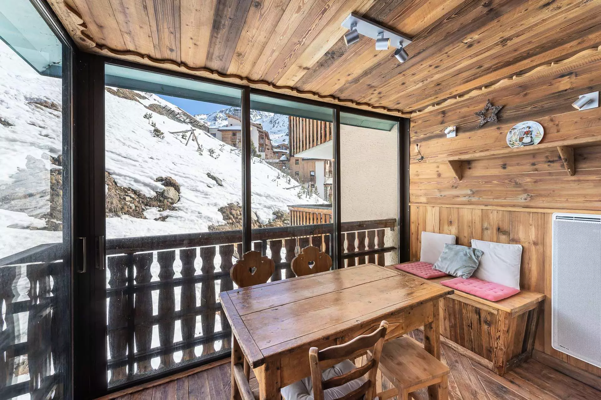 L'espace repas chaleureux dans la véranda offre une ambiance conviviale et lumineuse. La salle de bain est équipée d'une douche, et les toilettes sont séparées pour plus de praticité. Idéalement situé à proximité des pistes de ski et du centre, dans un quartier calme de Val Thorens, cet appartement est apprécié des touristes en quête d'une expérience montagnarde authentique et confortable. Profitez d'un séjour mémorable dans cet havre de tranquillité au cœur de l'animation de Val Thorens.
