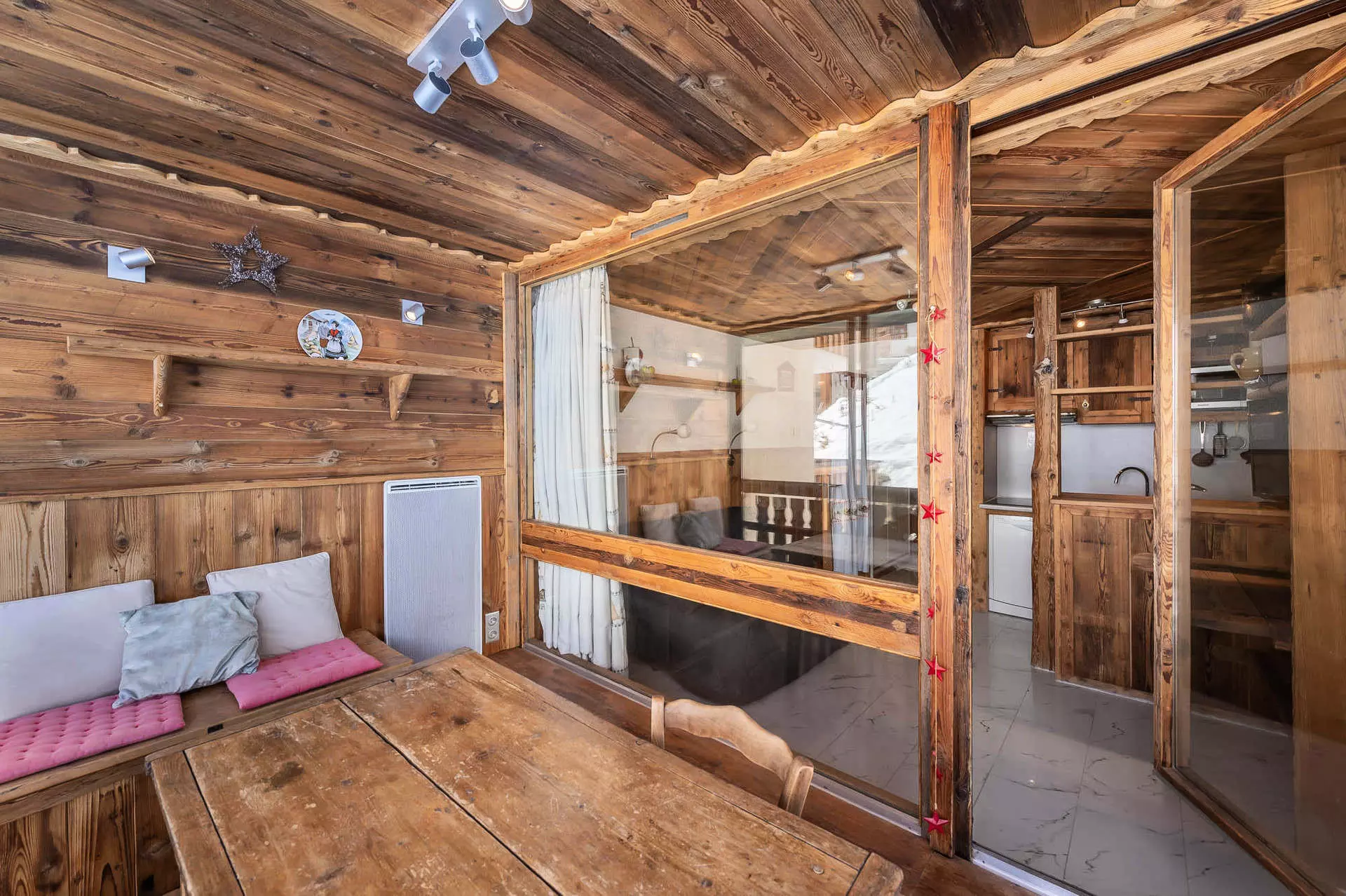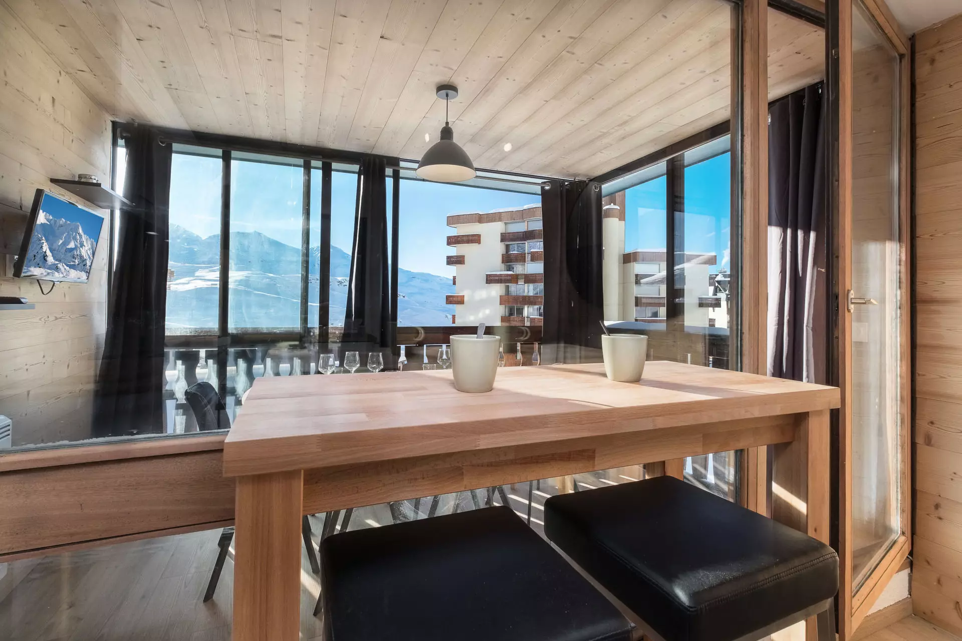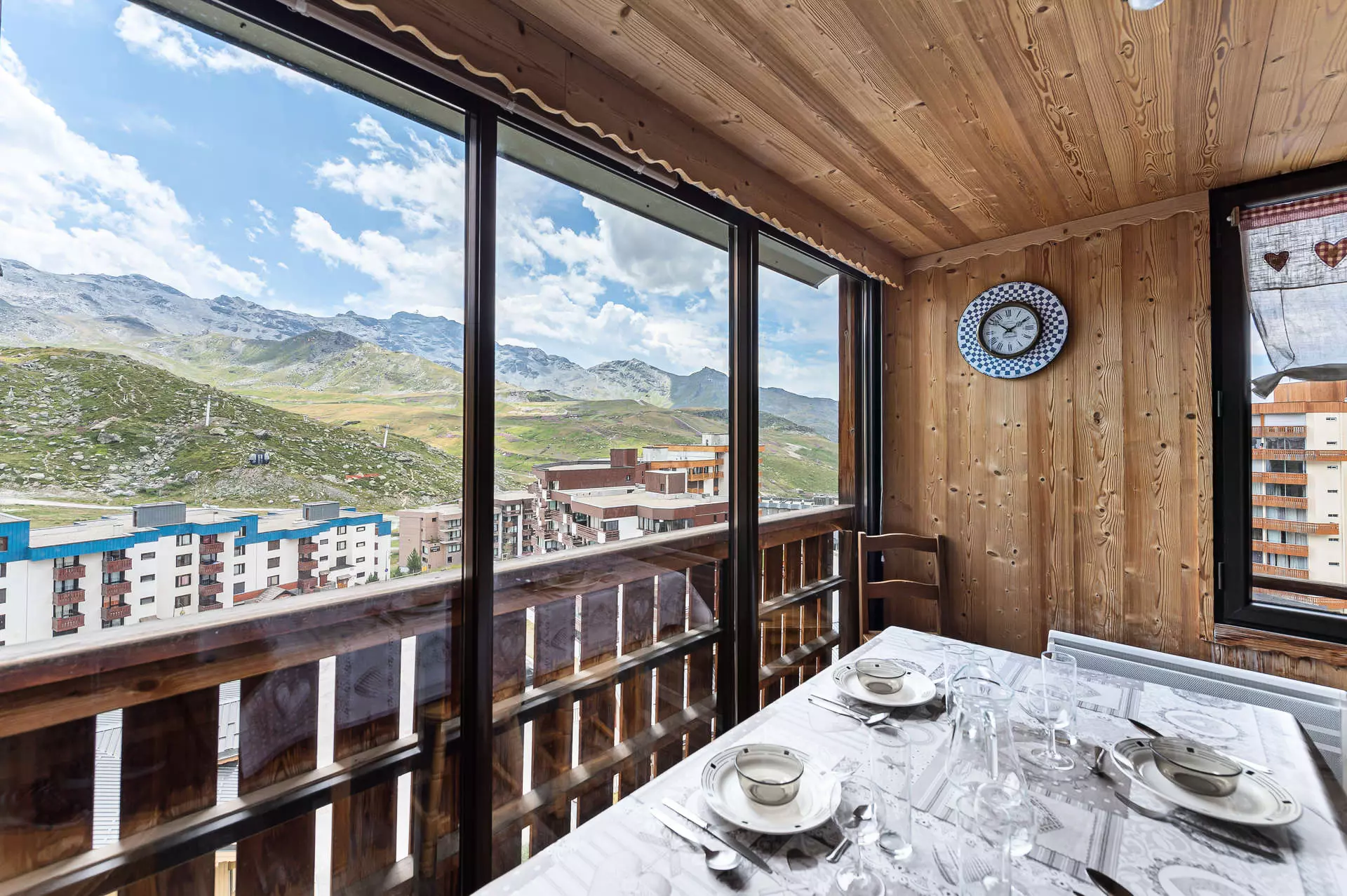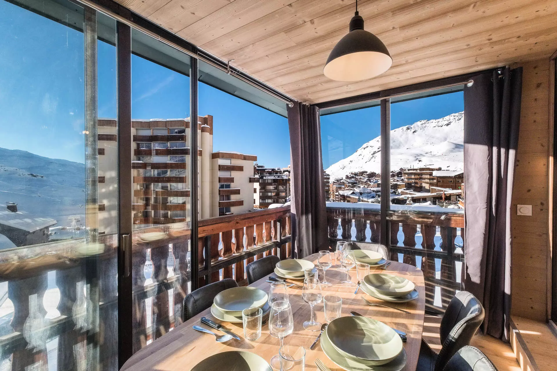 L'espace repas chaleureux dans la véranda offre une ambiance conviviale et lumineuse. La salle de bain est équipée d'une douche, et les toilettes sont séparées pour plus de praticité. Idéalement situé à proximité des pistes de ski et du centre, dans un quartier calme de Val Thorens, cet appartement est apprécié des touristes en quête d'une expérience montagnarde authentique et confortable. Profitez d'un séjour mémorable dans cet havre de tranquillité au cœur de l'animation de Val Thorens.