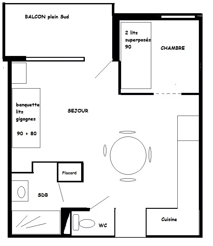 Studio + cabine pour 4/5 pers, 27m2, exposé Sud, avec balcon, belle vue sur la montagne et les pistes, situé au 2ème étage sans ascenseur (le balcon donne au 1er étage côté piste) Entrée N° 2 : escalier de droite - KITCHENETTE : 2 plaques vitrocéramiques, réfrigérateur, lave-vaisselle, four multifonctions. SEJOUR : coin salon 2 lits gigognes formant une banquette,TV - Cabine fermée : 2 lits superposés + 1 lit tiroir - SDB : douche, WC séparés. Literie : 3 couettes 1p et 1 couette 2p. Les sols : PVC - Draps et ménage de fin non inclus - Casier à skis : N°42 au RDC -Studio avec belle vue sur les pistes et les montagnes, au calme - Appt non fumeur et animaux non admis -La résidence : petite résidence de 3 étages, calme, située au pied des pistes, à env. 700m des commerces, reliée au village par navettes en bus gratuites (8h-minuit) -