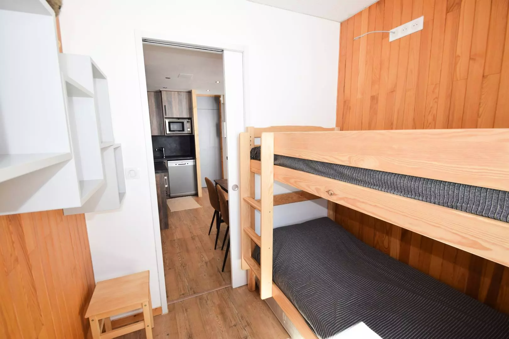 Studio cabine 3/4pers, 24m2, exposé Nord, plain pied, vue montagne et vallée. Entrée droite 13 à 47 - Cuisine américaine : 2 plaques électriques, réfrigérateur, four micro-ondes grill, lave-vaisselle - SEJOUR : coin repas, 1 canapé-lit clic-clac 2p (130cm), TV - CABINE dans l'entrée ouverte sur séjour : 2 lits superposés (70cm x180)- SDB : baignoire WC séparés. Literie : 2 couettes 1 pers. et 1 couette double. Les sols : moquette,sauf cuisine /SDB/WC: carrelage. Ménage de fin de séjour, draps, serviettes et forfaits ski en option - Non accessible PMR-Casier à skis : N°14 au RDC - Studio très agréable, avec belle vue sur la vallée, porte fenêtre pour accès de plain-pied devant l'appartement.