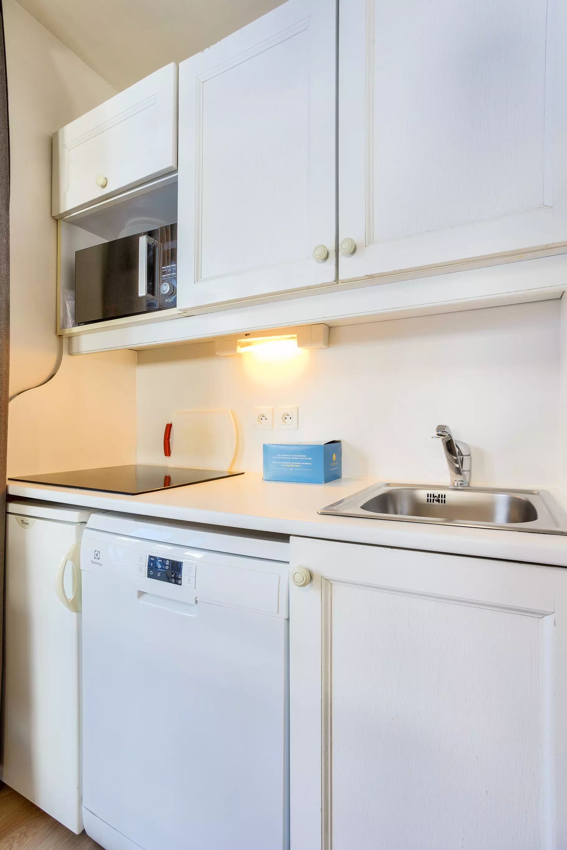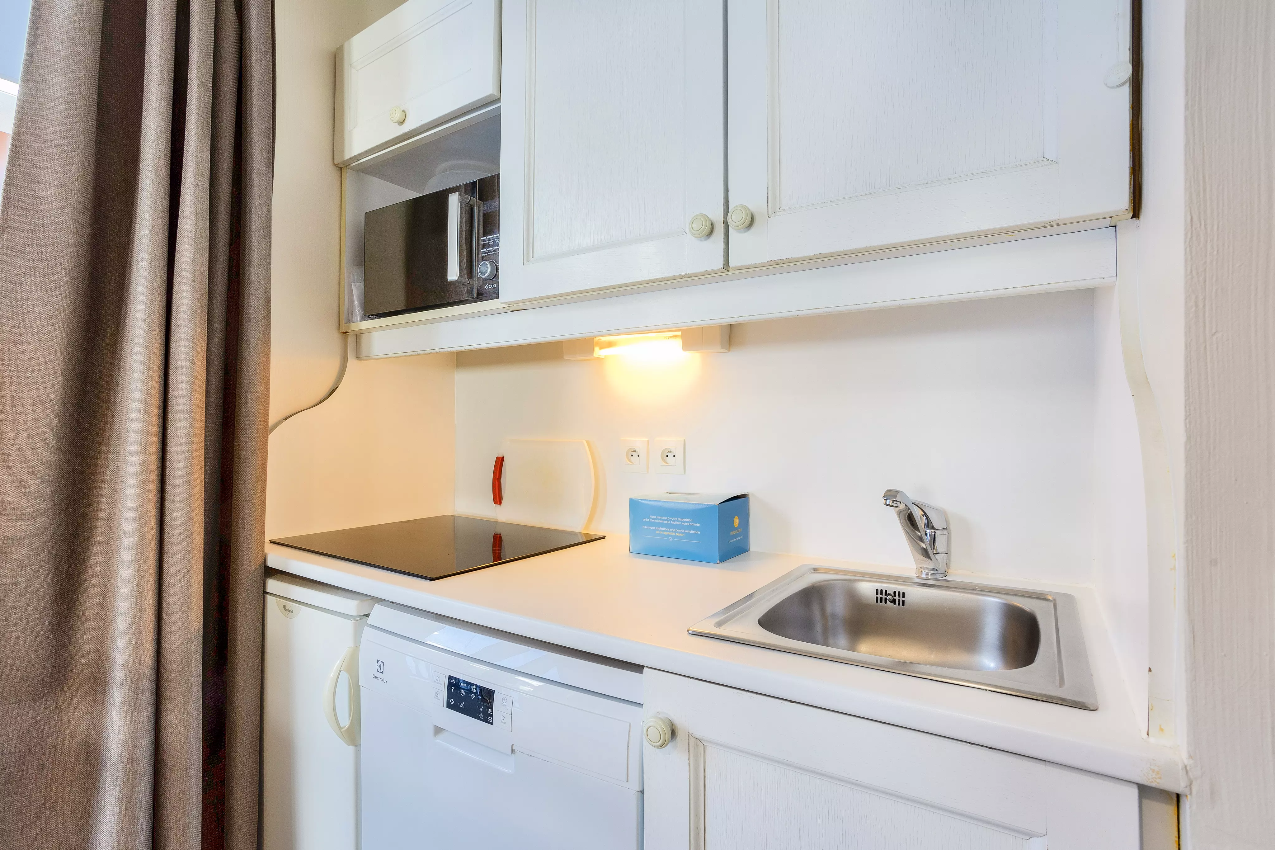Kit d'entretien : Inclus - contenu peut varier selon les résidences : éponge, lavette, flacon de produit multi-usages, flacon de produit liquide vaisselle main, tablette lave-vaisselle et torchon.