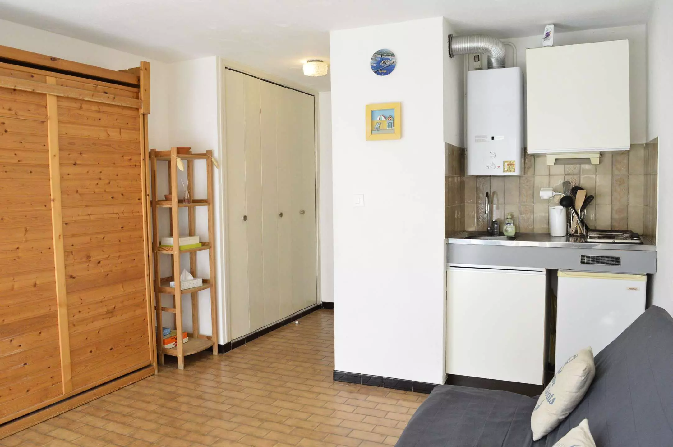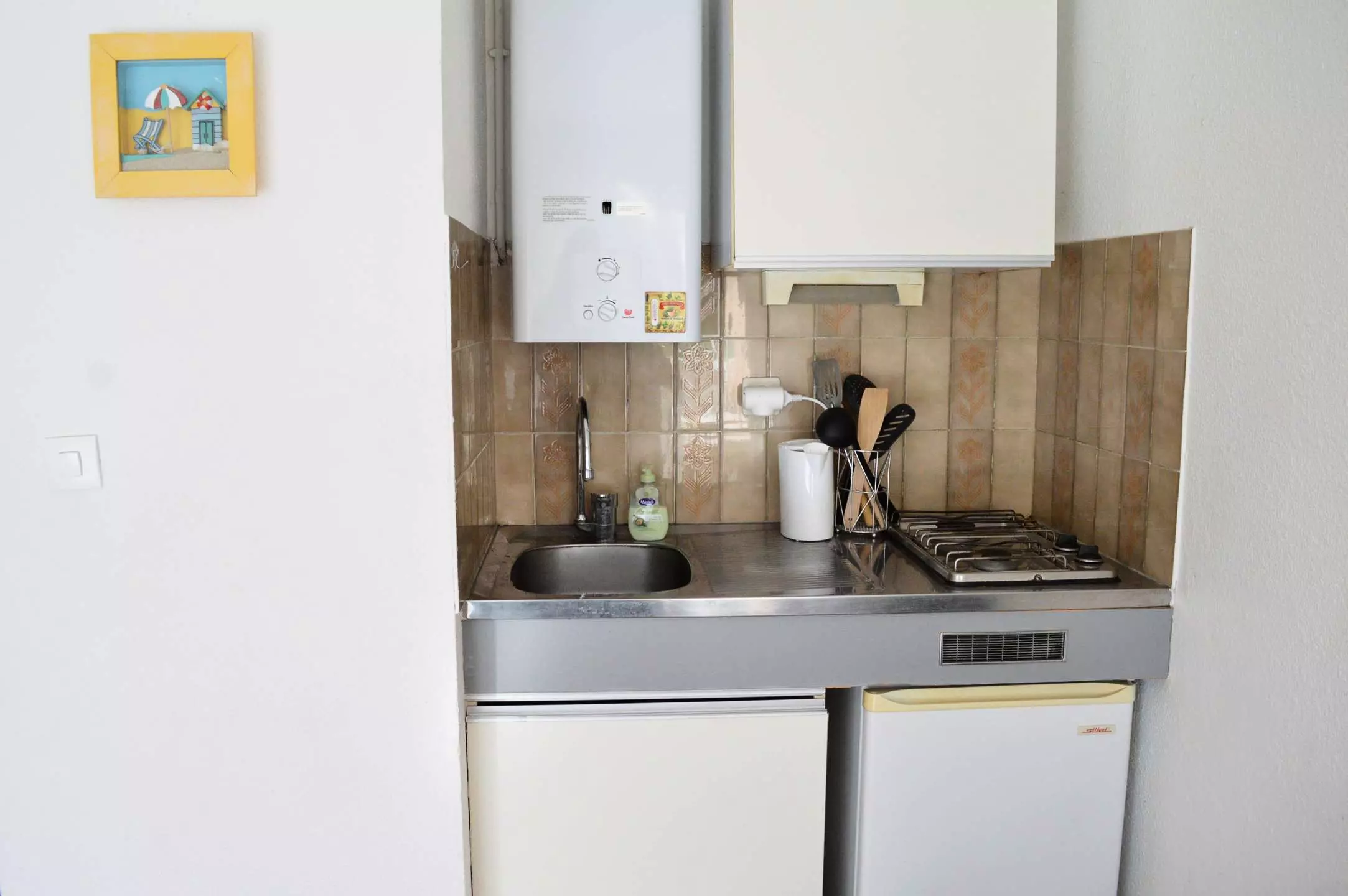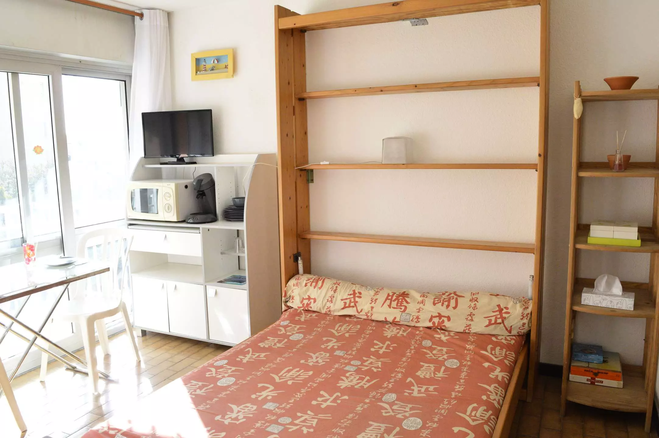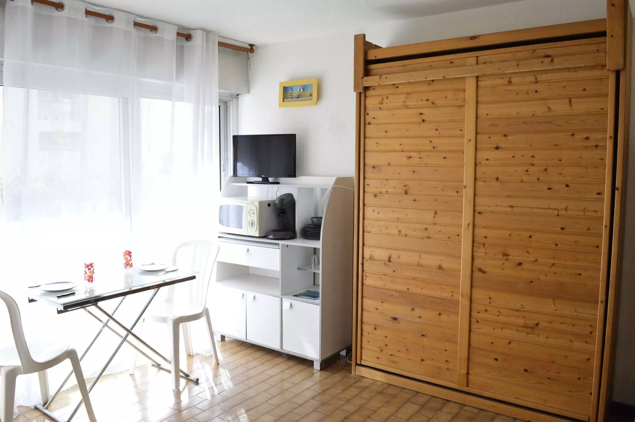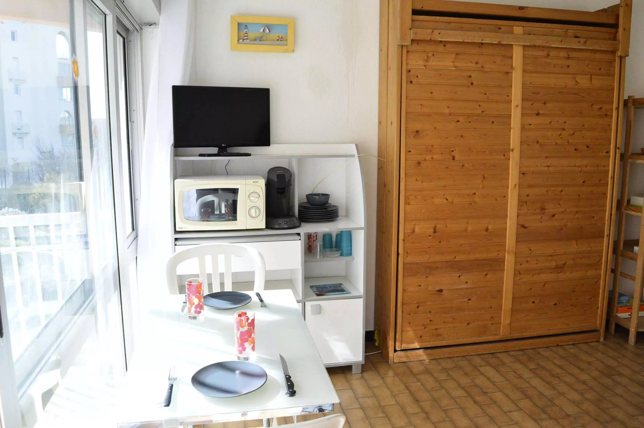 Cet appartement de vacances, situé au 1er étage avec ascenseur comprend un séjour avec un canapé convertible 2 places en 140 et une télévision ainsi qu'un lit armoire 2 places en 140, un coin kitchenette avec micro-ondes et réfrigérateur ainsi qu'une salle de bain avec WC .