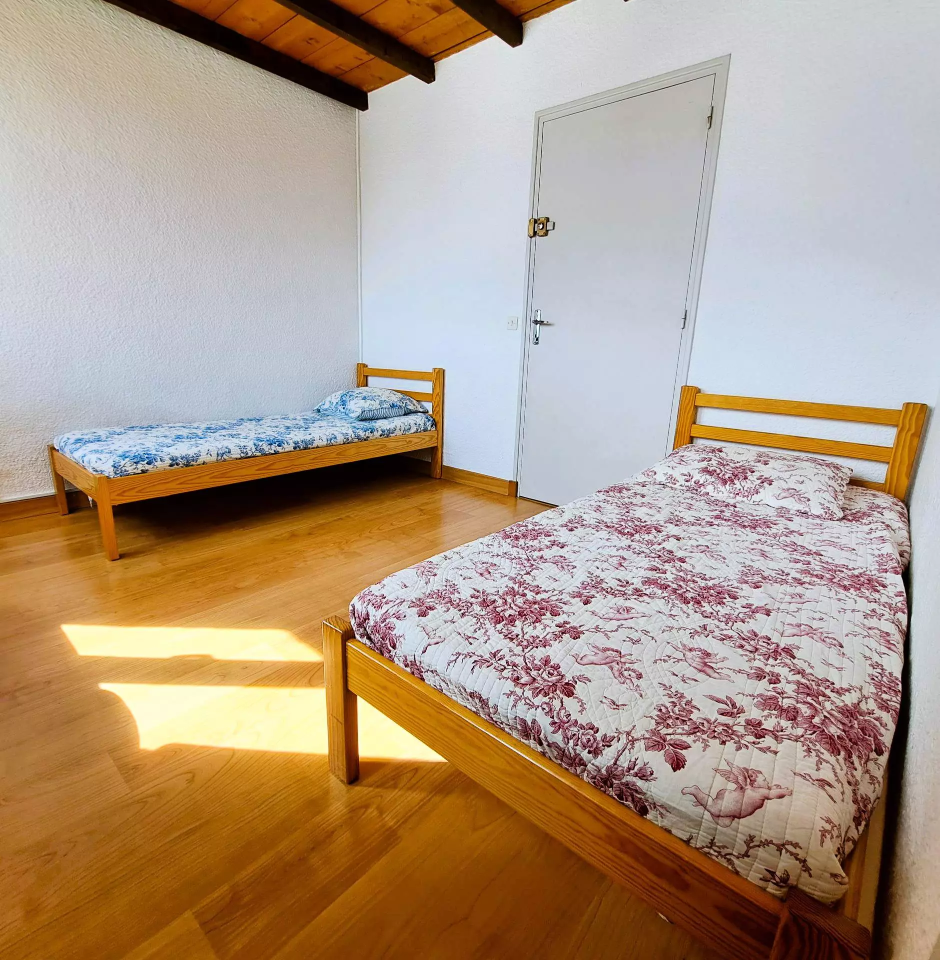 Une entrée, une salle de bains, un W-C, un séjour ouvrant sur balcon avec un convertible en 140 cm, une télévision, un espace cuisine équipé de réfrigérateur/congélateur, 4 plaques de cuisson vitrocéramique, four, micro ondes multifonctions, lave vaisselle, une chambre avec 1 lit gigogne 2x80 cm, un lit en 90 cm, une chambre avec 2 lits en 80 cm, ainsi qu'une salle d'eau.