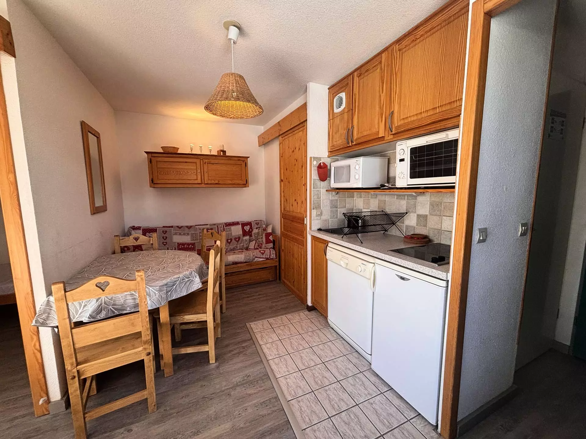 Appt 2 pièces, 4 pers, 25m2, balcon, expo sud, vue pistes, 1er étage avec ascenseur. Cuisine : 4 plaques électriques, four traditionnel, réfrigérateur, lave-vaisselle - Séjour : coin repas, coin salon, télévision. Chambre : lit 2 pers 140cm. Coin cabine : 2 lits superposés 70cm - Salle de Bains : baignoire, WC séparés. Literie : couettes : 2x1p - 1x2 p + couvertures Sols : lames pvc imitation bois - Appartement non fumeur, animaux non admis. En option et en supplément: Ménage de fin de séjour, draps, serviettes, forfaits ski.