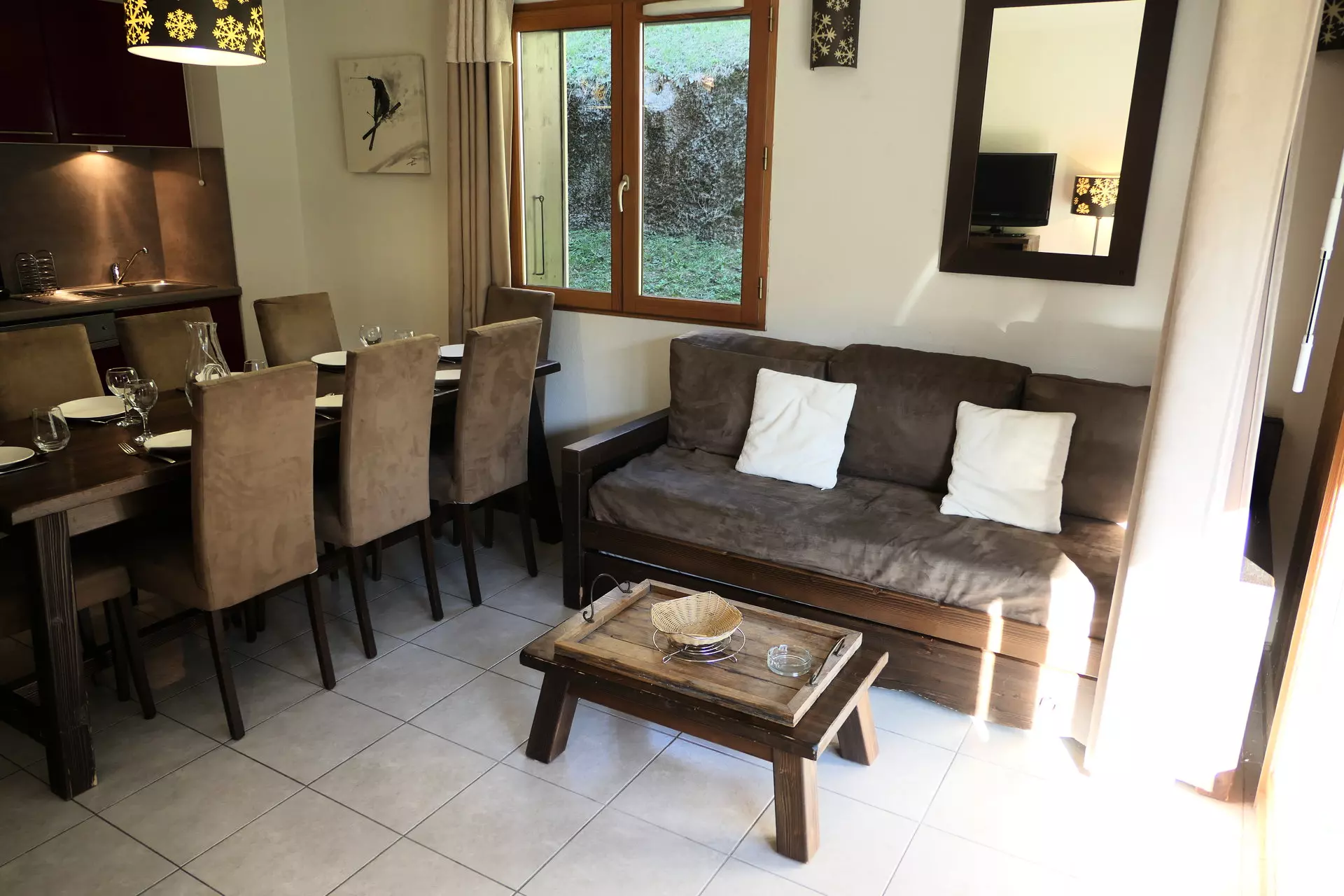 • Séjour avec canapé-lit gigogne pour 2 personnes, télévision et coin repas.