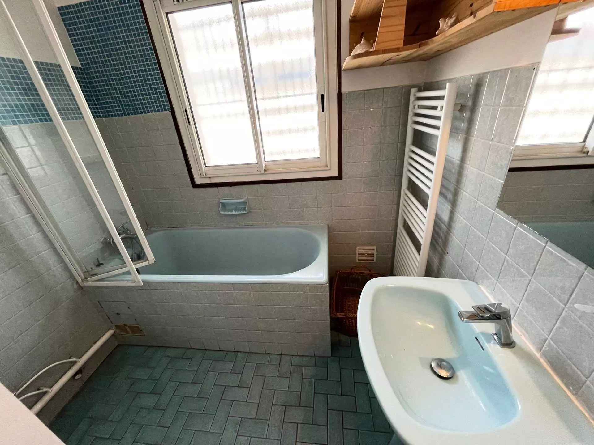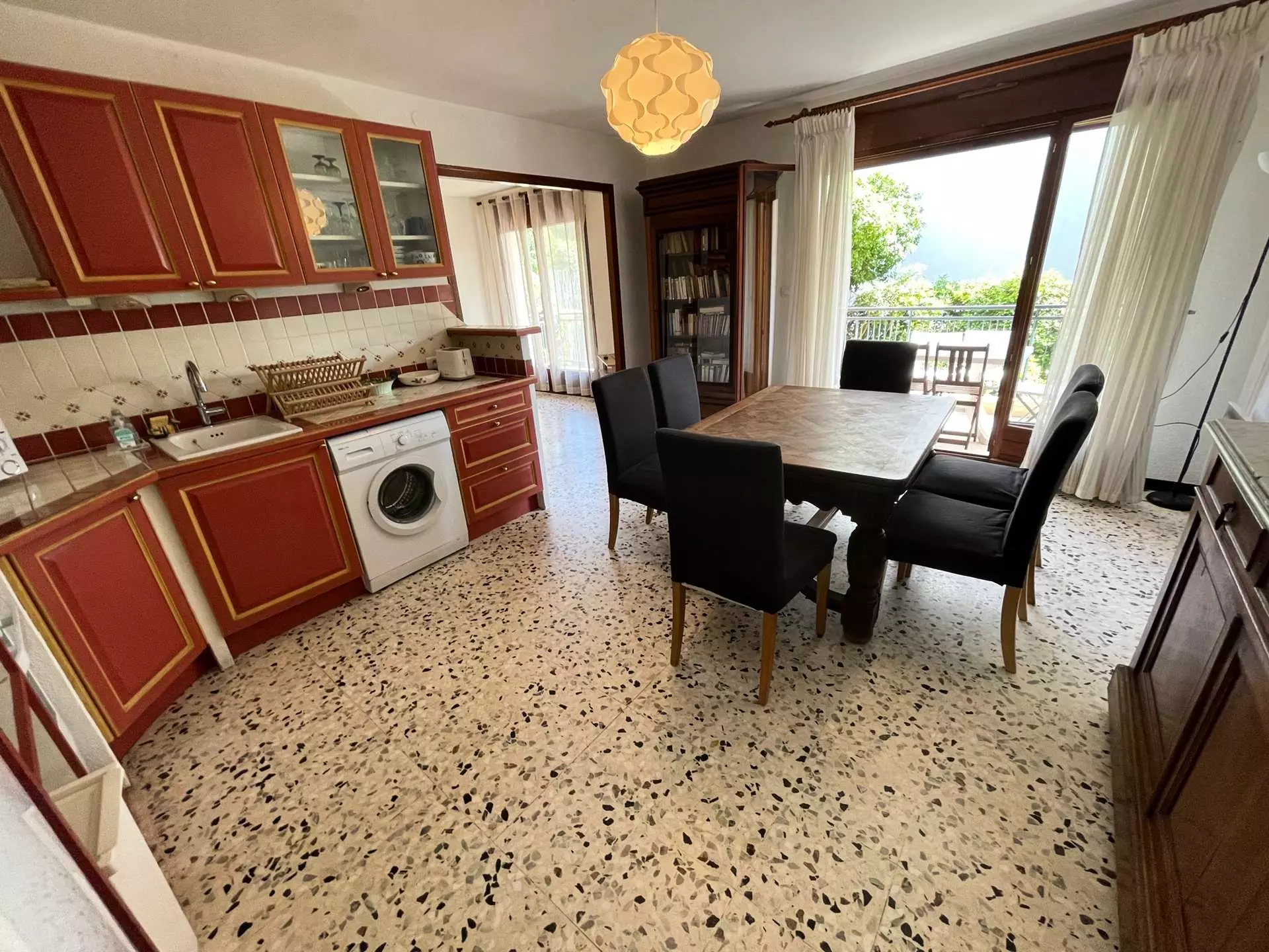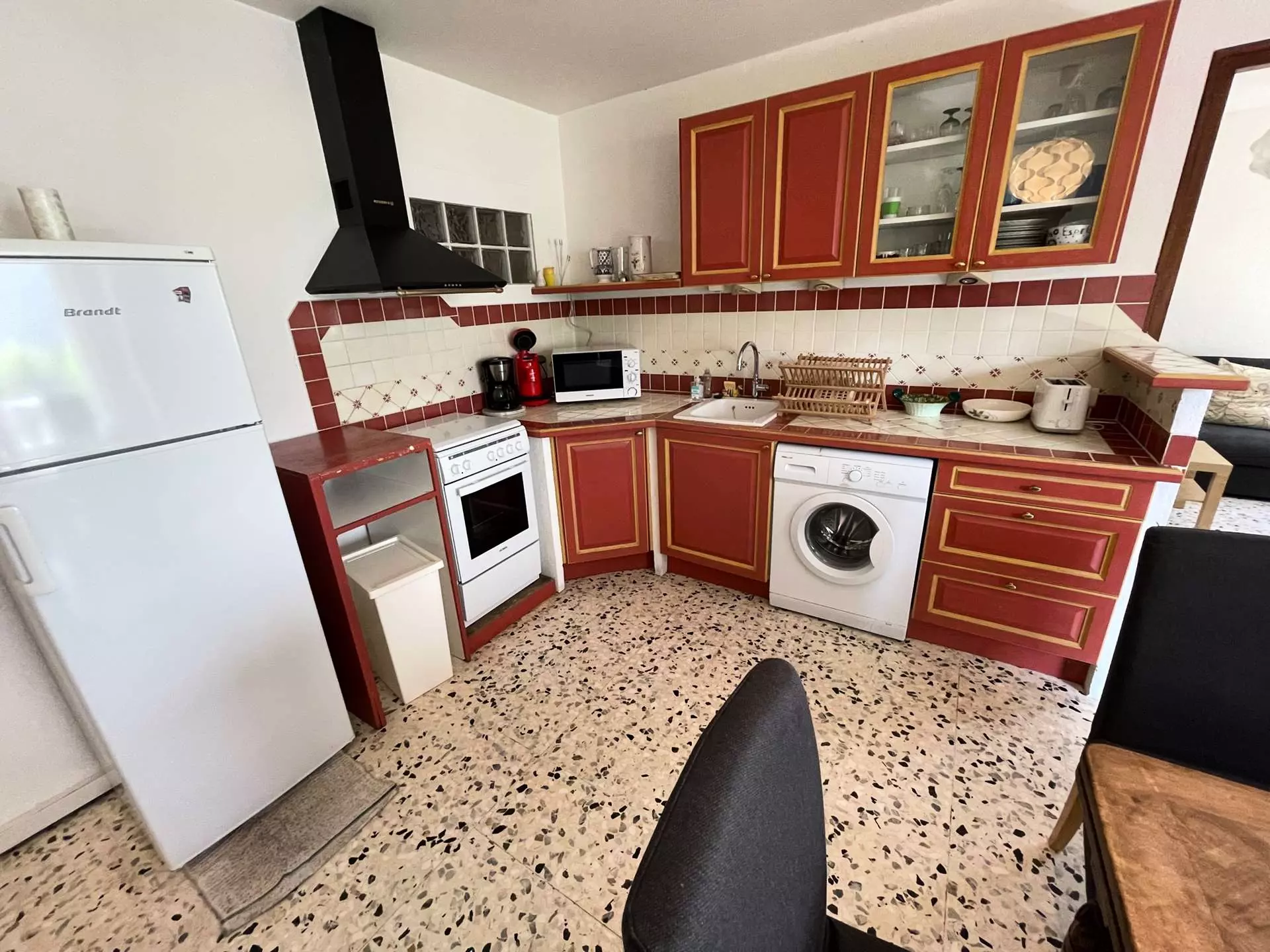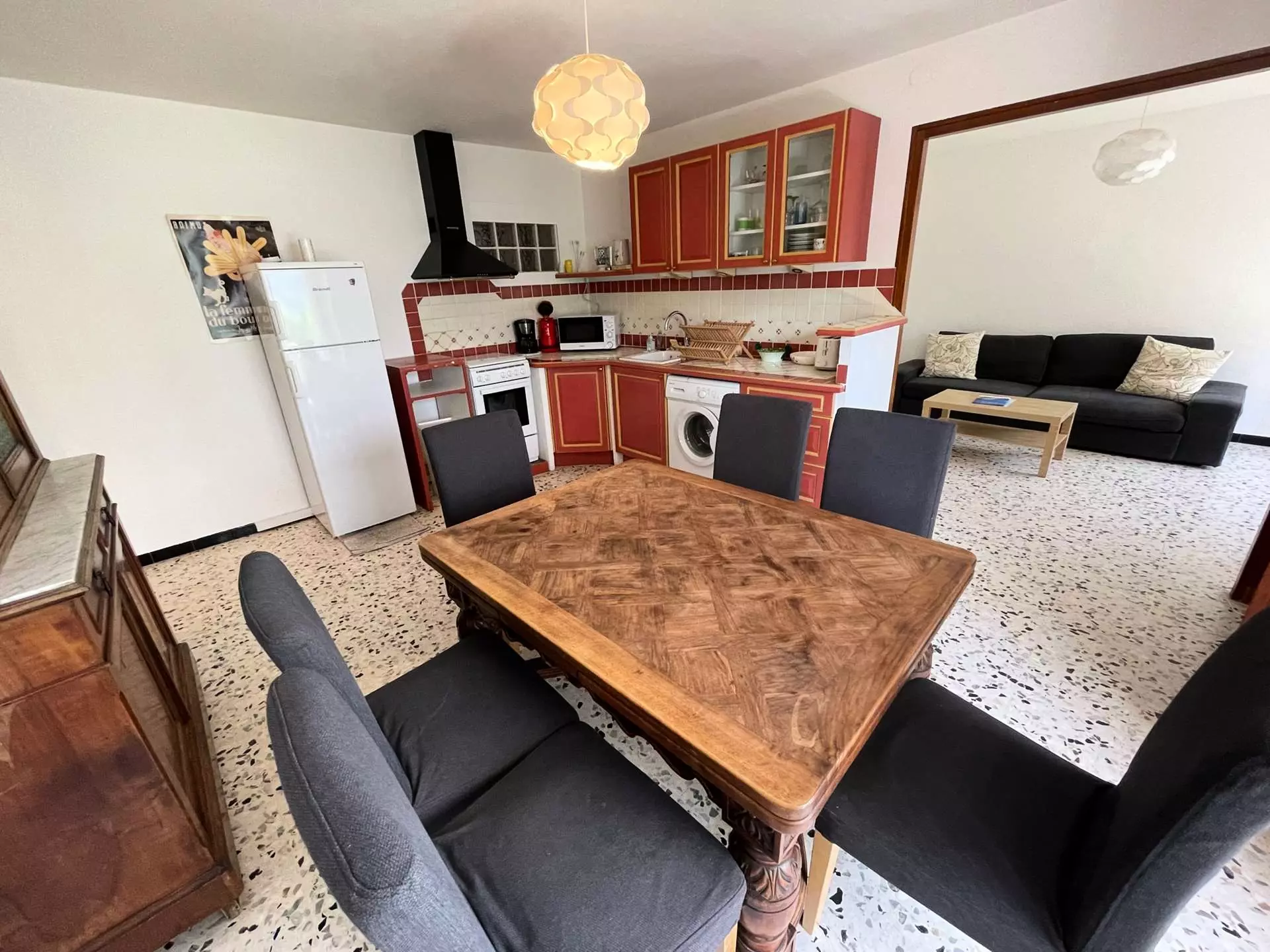 Cuisine équipée ouverte sur double séjour : cuisinière électrique + four, hotte aspirante, réfrigérateur + congélateur, micro-ondes, cafetière électrique, grille-pain...Lave-linge