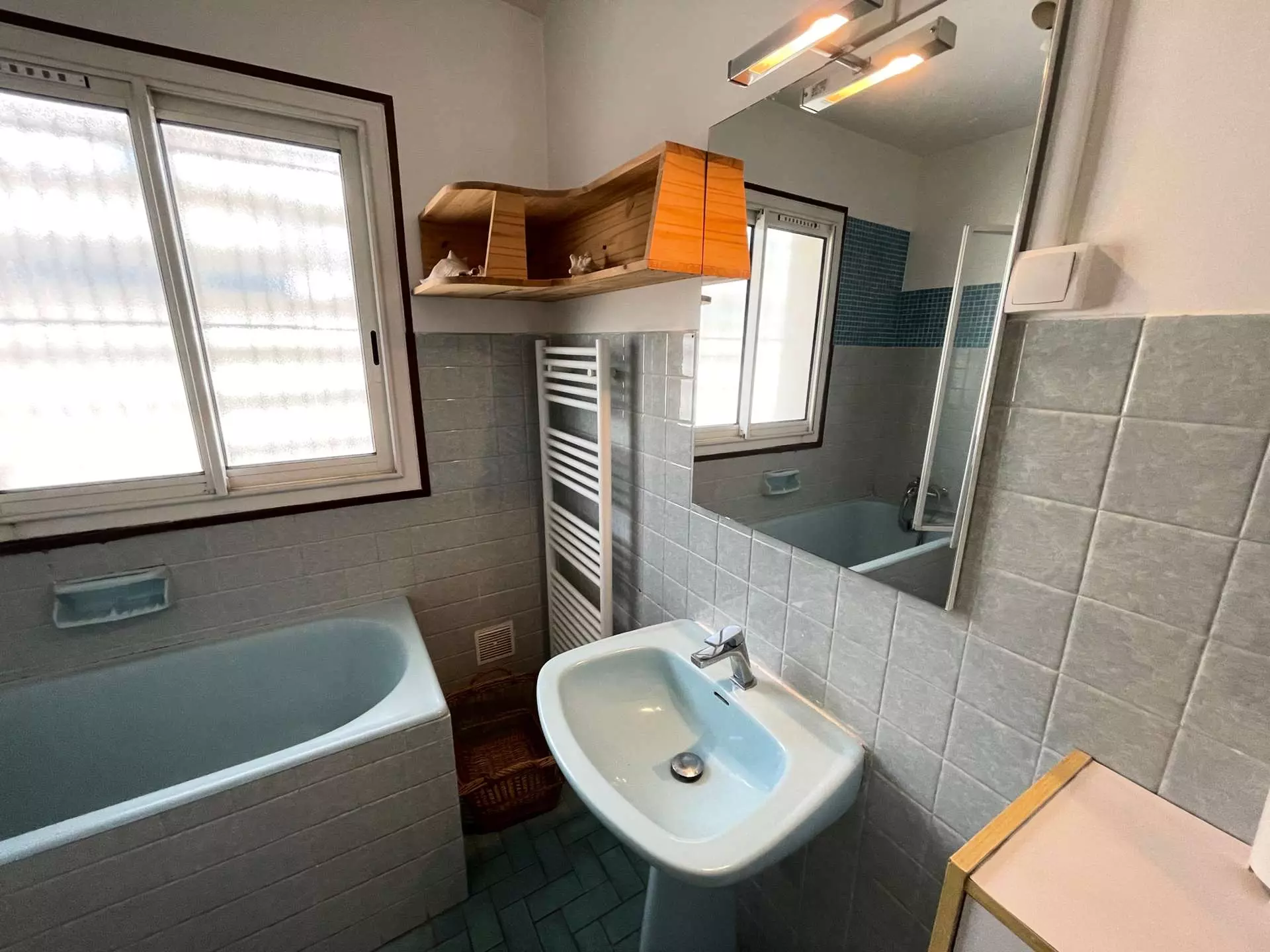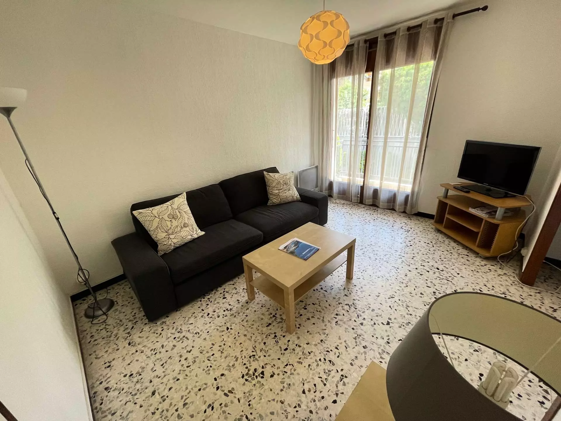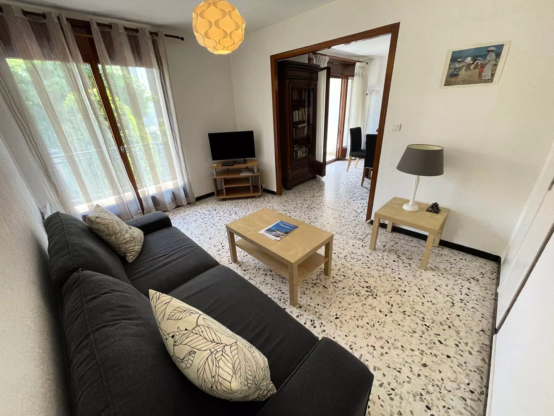 Double séjour lumineux avec coin salon : canapé convertible deux places, téléviseur écran plat
