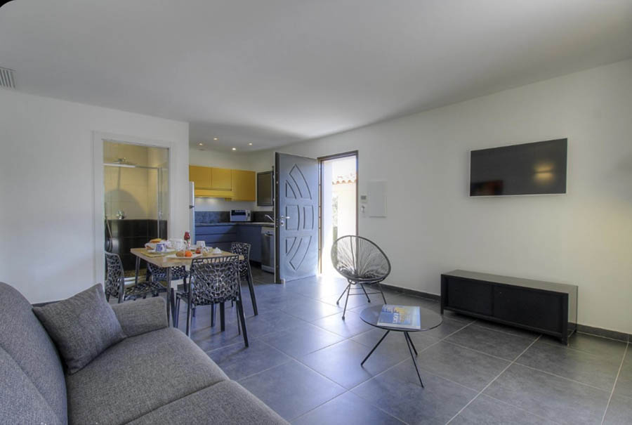 Climatisation, cuisine avec lave-vaisselle, réfrigérateur-congélateur, plaques 2 feux de cuisson, micro-ondes, bouilloire, grille-pain et cafetière. Vaste salon (avec convertible en 160 dans le T2), télévision TNT.