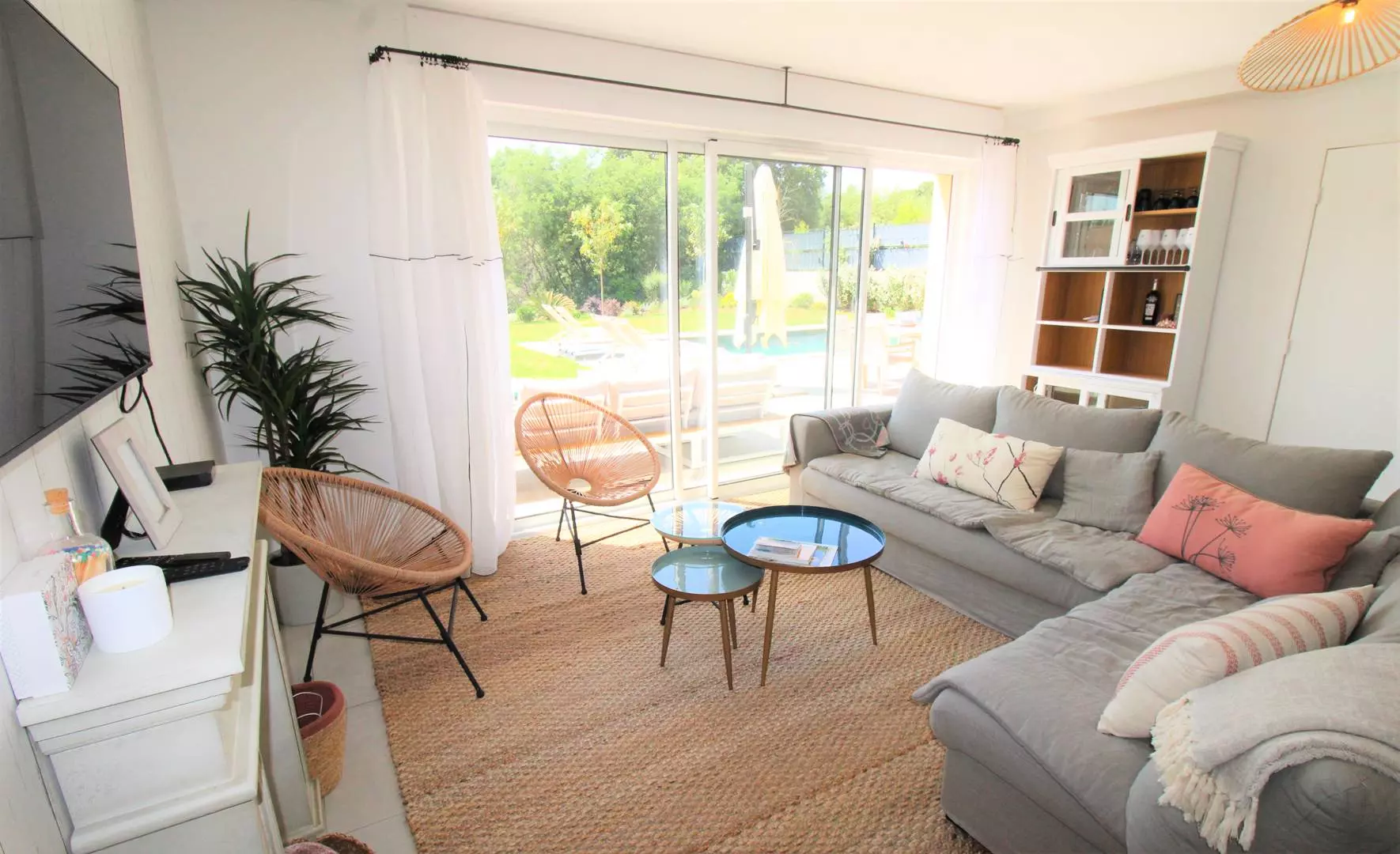 Une entrée accueillante mène à une vaste pièce de vie baignée de lumière, ouverte sur une terrasse aménagée avec vue sur la piscine et le jardin. La cuisine américaine, équipée d'un îlot central, est ouverte sur le salon pour des moments de convivialité. Une buanderie pratique se situe à l'arrière.