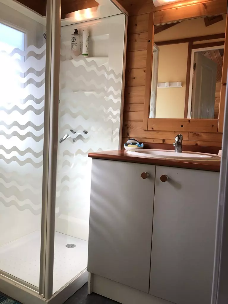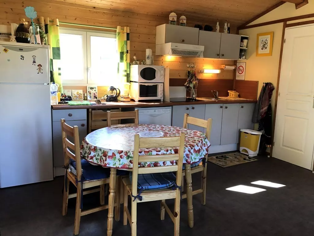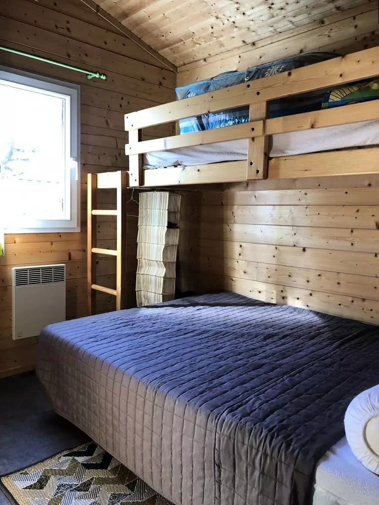 Chalet de 42 m2 pouvant accueillir 5 personnes. Il se compose d'une cuisine ouverte sur le séjour, de deux chambres avec placards, d'une salle d'eau et d'un WC indépendant.