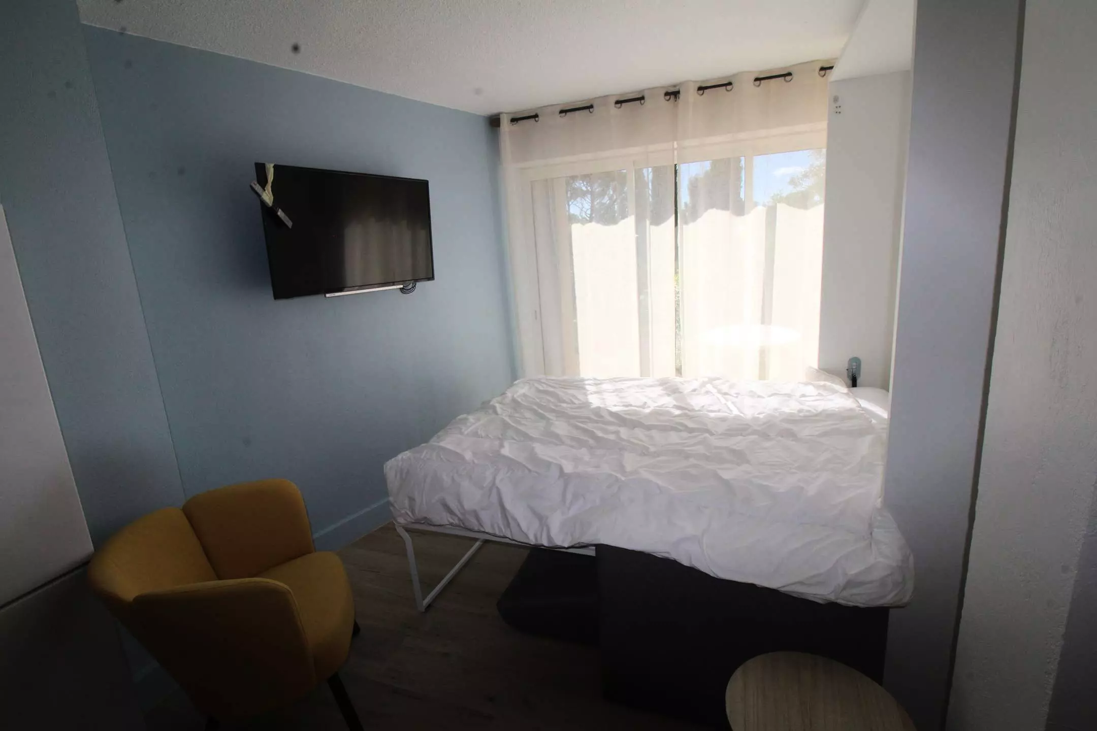 Il est composé d'une cabine avec 2 lits simples superposés, d'une salle d'eau, d'un WC indépendant, d'un séjour (canapé convertible, TV écran plat) avec cuisine équipée américaine et coin repas, donnant sur un jardinet. Il possède également une terrasse dont vous pourrez profiter avec un mobilier extérieur.