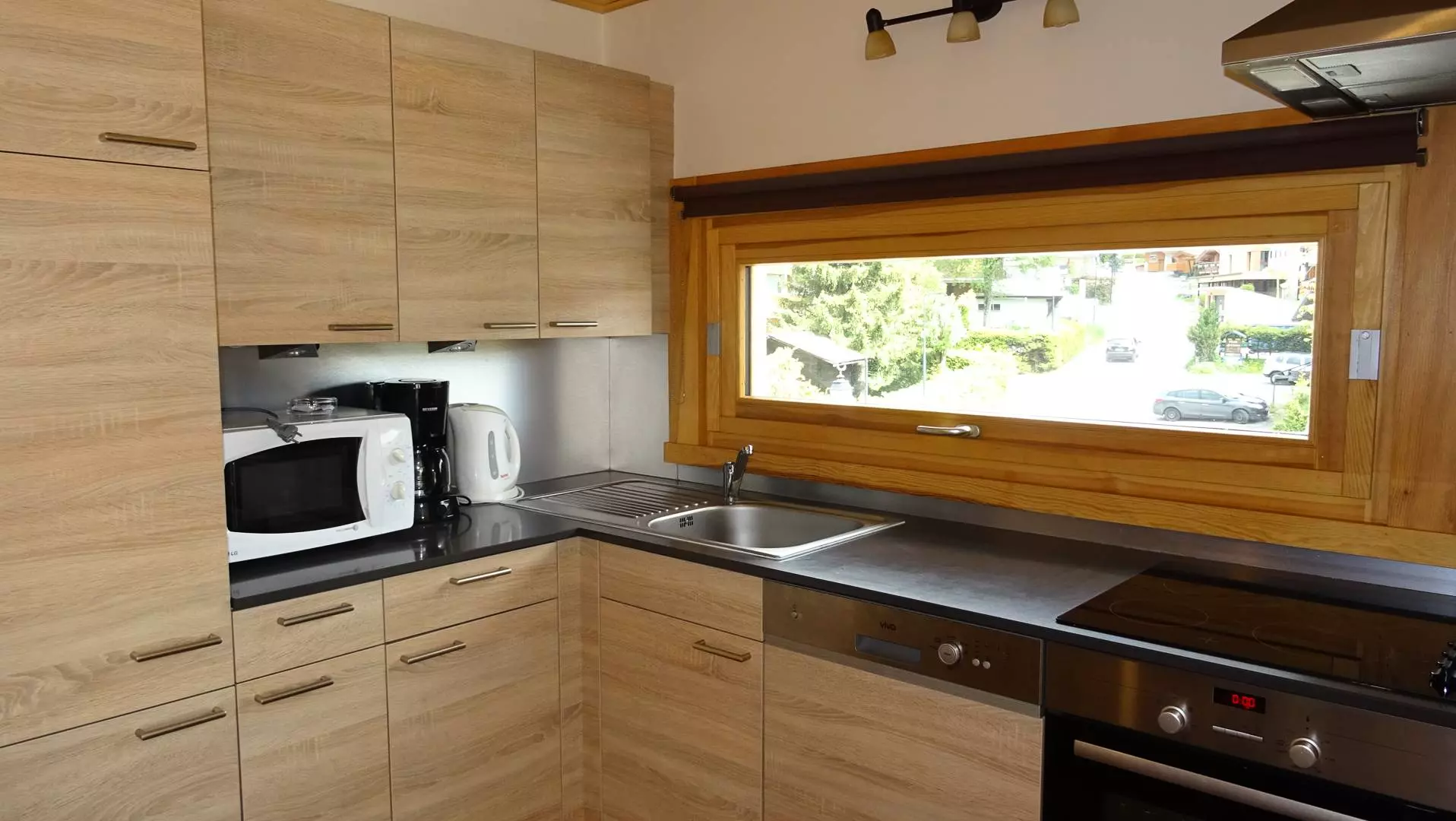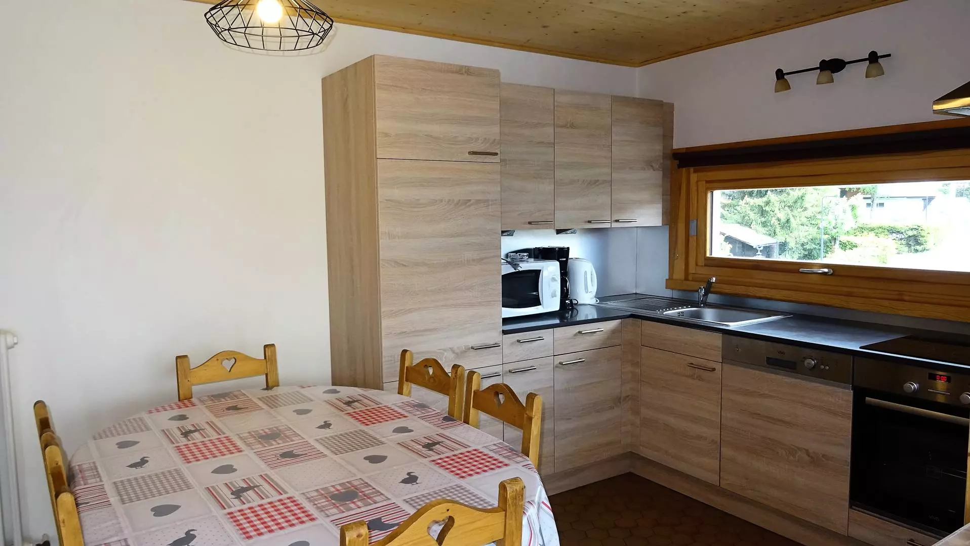 DESCRIPTIF : Entrée spacieuse avec placard - Une chambre équipée d' 1 lit 2 personnes (140) + placard - 1 chambre équipée de 3 lits simples (90) + rangement - Séjour salle à manger équipé d' 1 banquette 1 personne (90), baies vitrée donnant sur un balcon avec mobilier de jardin, Vue centre village - Coin cuisine ouvert sur salle à manger entièrement équipée (lave-vaisselle, 4 plaques vitrocéramiques, grand frigidaire, hotte aspirante, grille-pain, bouilloire, cafetière électrique, four, micro-ondes avec batterie de cuisine ) - 1 WC indépendant - 1 salle d'eau (douche, lavabo) - 1 terrasse + balcon.
