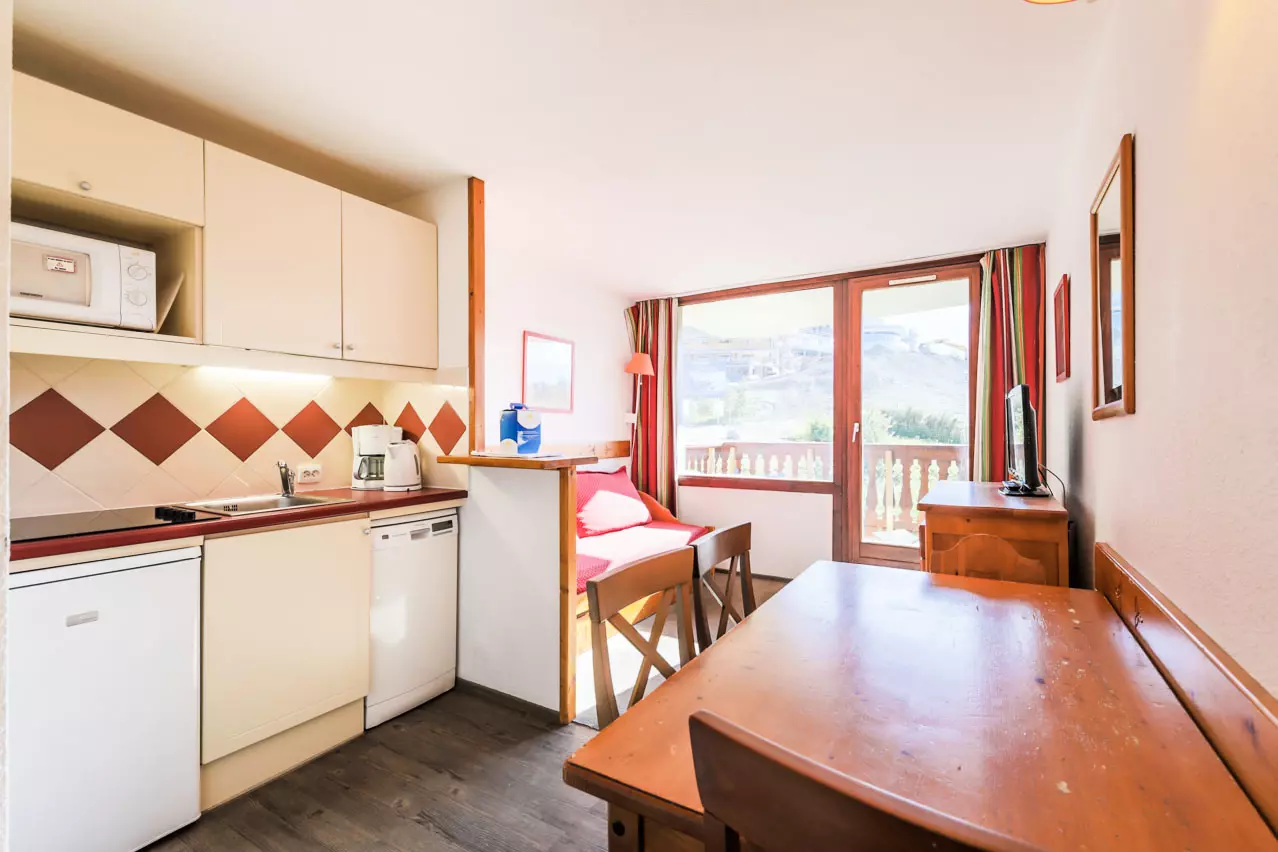 Les atouts de votre location : Cet appartement au rez-de-chaussée offre une vue dégagée sur les pistes depuis son balcon orienté Est. Fonctionnel et bien équipé, il comprend une télévision, un lave-vaisselle, un coin nuit séparé, ainsi qu'un accès Wifi en supplément. Idéal pour des vacances au pied des pistes en toute simplicité.