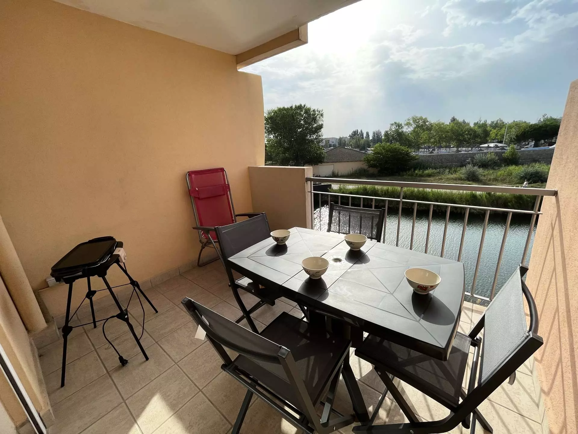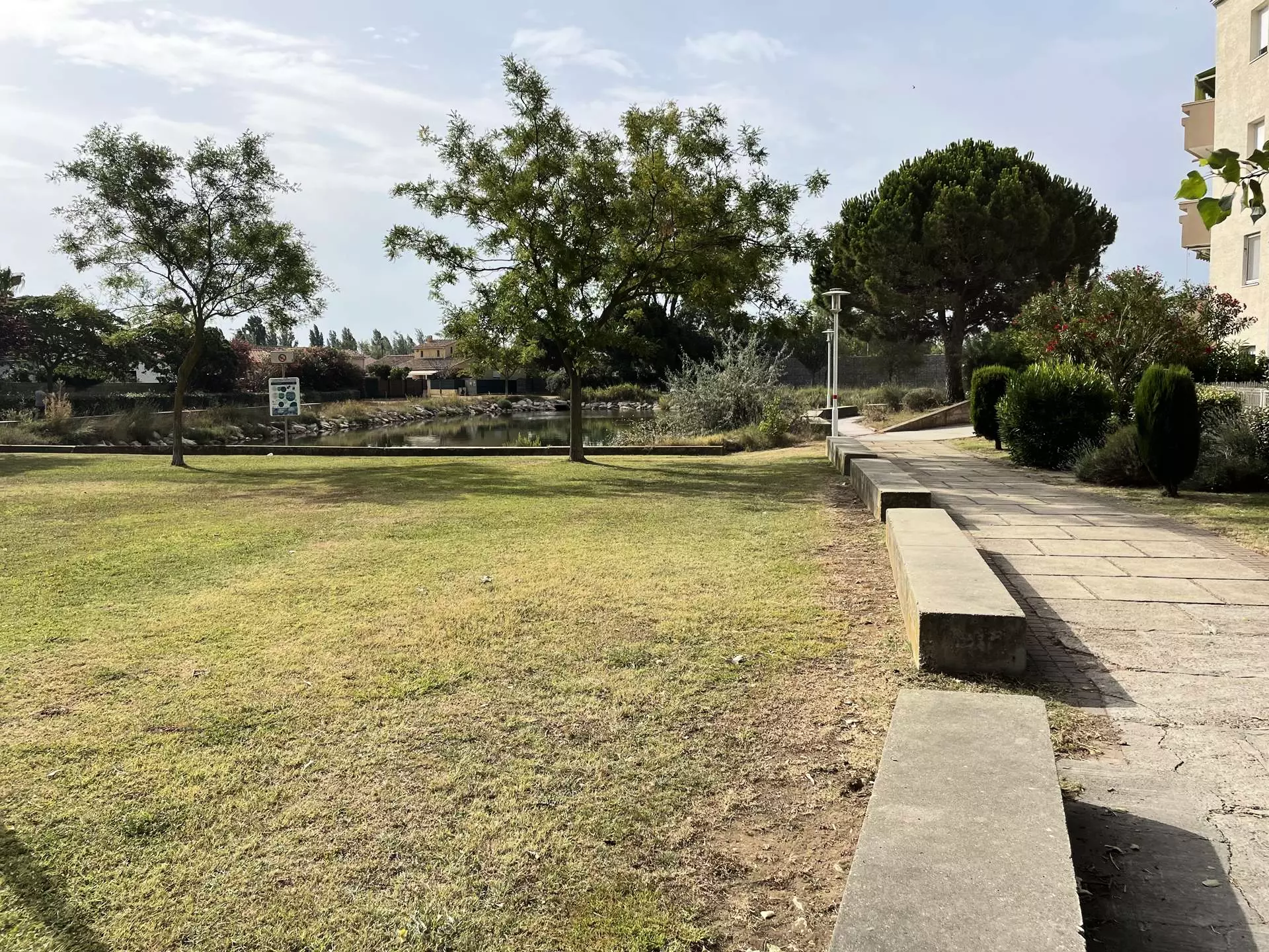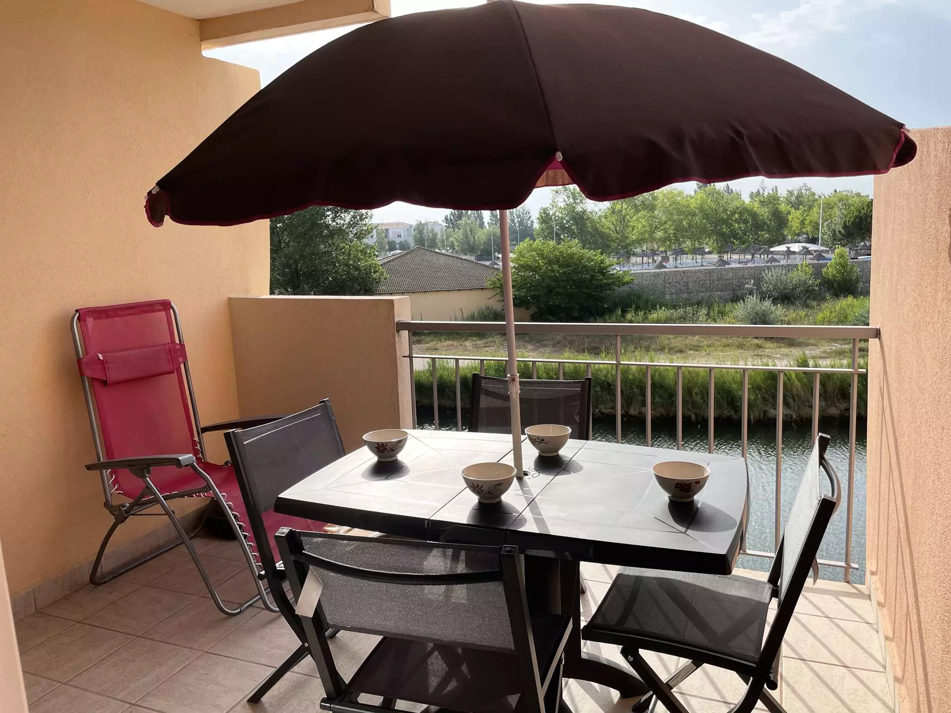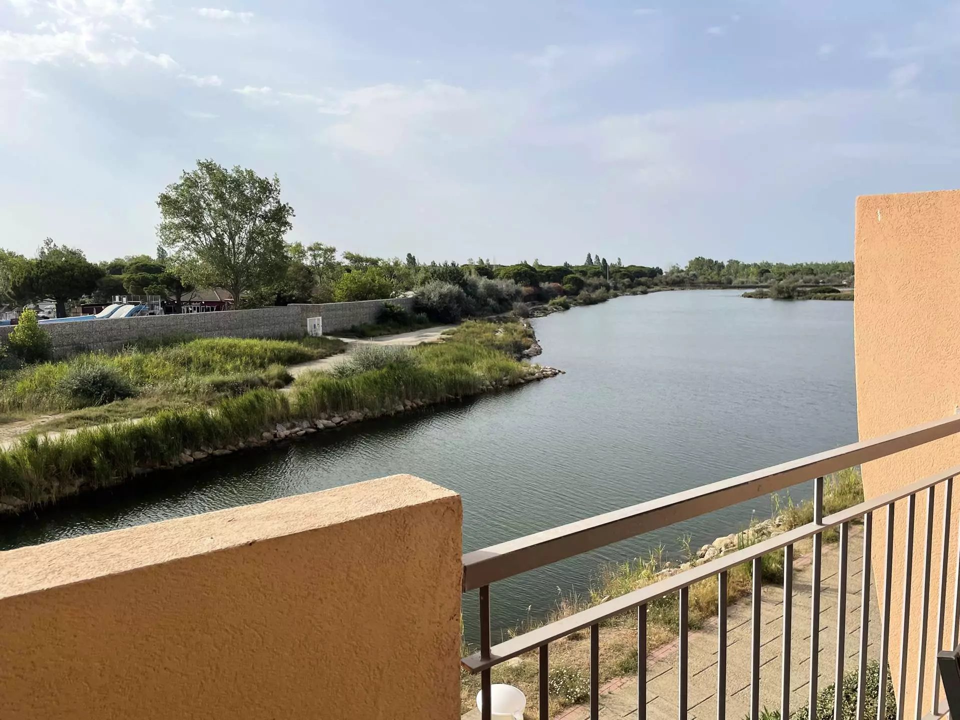 Les "Plus" de cette location de vacances en Camargue : une résidence avec piscine, un parking privé à la résidence et une jolie vue sur le chenal, le lac et en face la piscine du camping.
