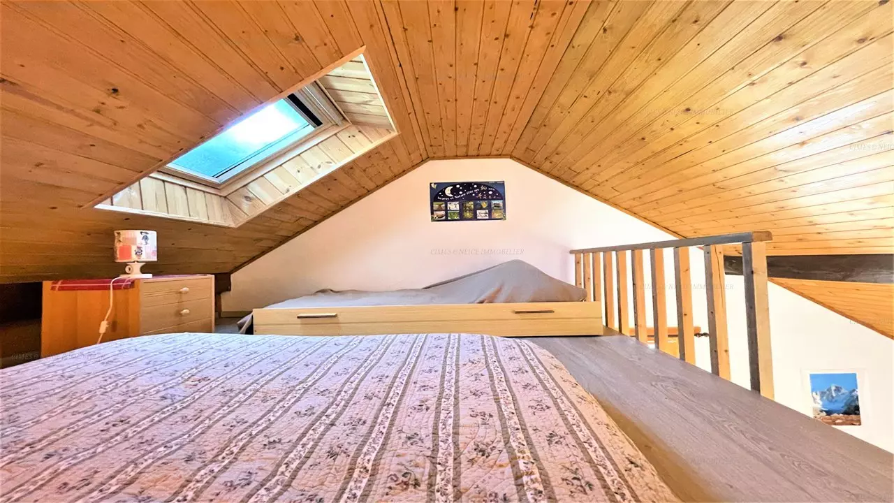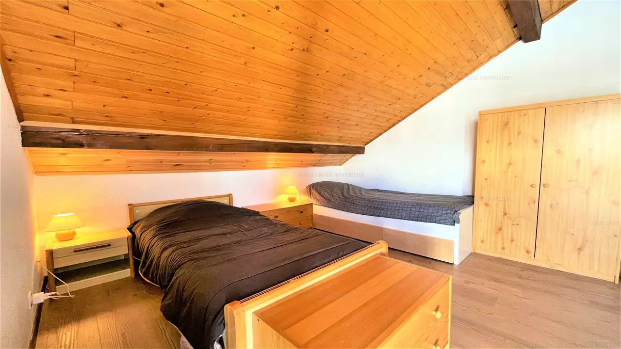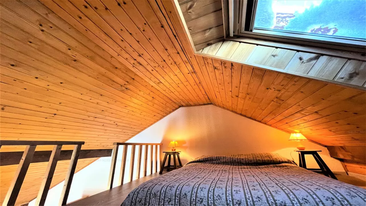 Une salle de bains avec une machine à laver et des WC indépendant. Une chambre avec un lit en 140 donnant sur le deuxième balcon, une seconde chambre avec 2 lits simples et une mezzanine avec un lit simple et un lit double en 140 (Attention l'accès à la mezzanine se fait par une échelle à la verticale). Casier à ski & parking gratuit.